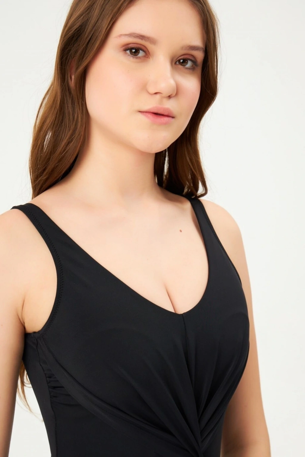 V yaka tasarımı ile feminen bir görünüm sunar ve rahat bir kullanım sağlar; Toparlayıcı özelliği sayesinde vücut hatlarını daha sıkı ve düzgün gösterir, özgüveninizi artırır; Düz kesimiyle sade ve şık bir stil yaratırken, hareket özgürlüğünüzü kısıtlamaz; Dokuma kumaş yapısı, dayanıklılığı artırarak uzun süreli kullanım imkanı sunar;