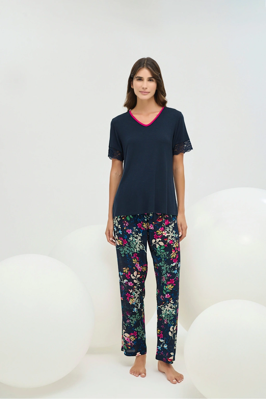 25109 Kadın V Yaka Kısa Kollu Bol Paçalı Pijama Takım