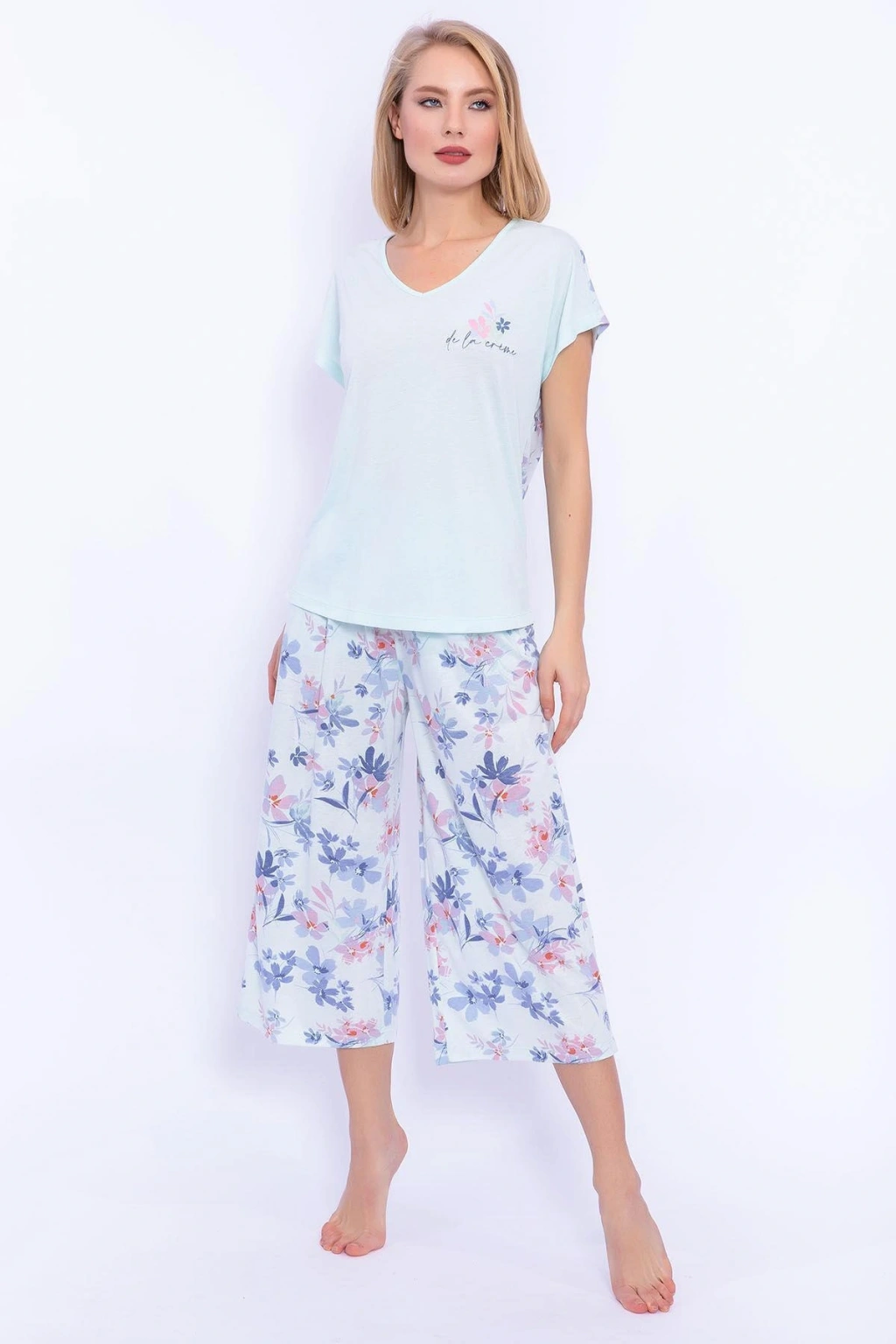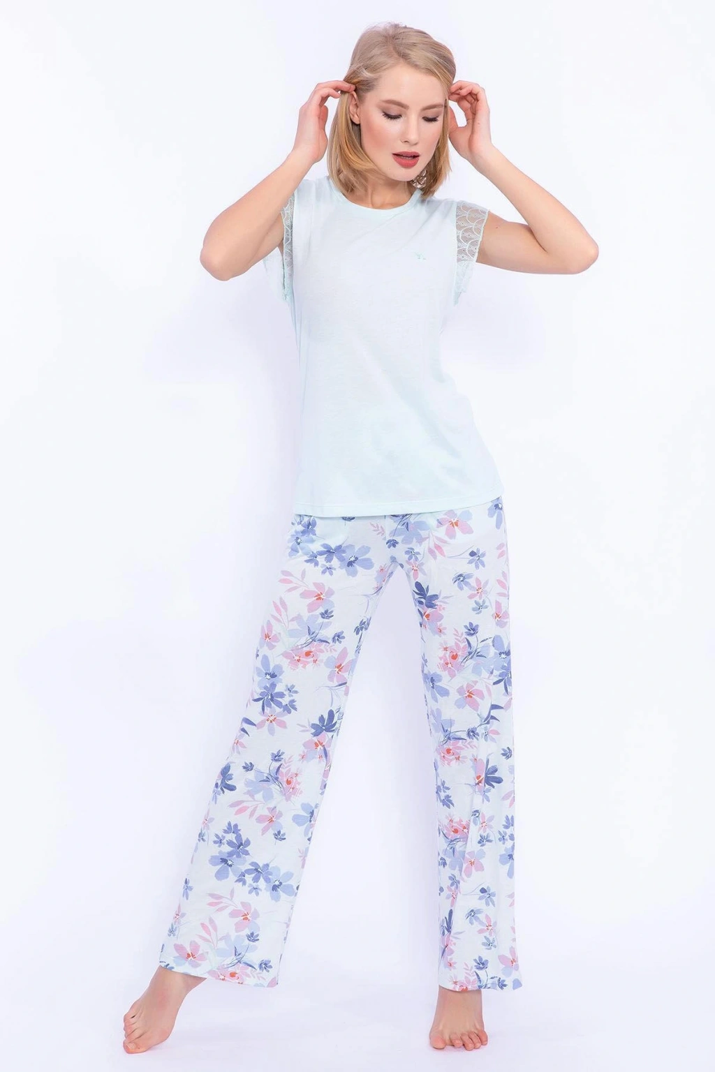 Arnetta 1899 Çiçek Desenli Nil Dantel Detaylı Kadın Pijama Takımı Dünyanın en uzun nehri olarak bilinen, yüz yıllar boyunca insanlık için bereket ve sonsuzluğun simgesi olarak kabul edilen Nil Nehrinin etkileyici mavi tonunu Arnetta’nın rahatlık ve güzellikte sınır tanımayan tasarımlarıyla buluşturduk.; Arnetta Çiçek Desenli Nil Mavisi Dantel Detaylı Kadın Pijama Takımımız, %50 polyester ve %50 viskon içeriğine sahip süprem kumaş kullanılarak hazırlandı.; Bisiklet yaka, nil mavisi renkte tişörtü kollarına eklediğimiz dantel detaylarla zenginleştirdiğimiz pijama takımımızın alt parçası da üst tasarımında kullanılan mavi renkle uyumlu çiçek desenleriyle tamamlandı.; Rahat giyinmeyi seven tüm kadınların ilgisini çekecek takımımızın üst parçası üstüne yapışmayacak bir kalıba, alt parçası ise bol paça bir kesime sahip.; Tasarımında ince yapılı kumaşlar tercih ettiğimiz kadın pijama takımımız, sıcak havalarda nemi içine hapsederek konforuna zarar vermez.; Yaz ve bahar aylarında ipeksi dokusuyla uyku zamanlarının vazgeçilmezi olacak pijama takımımız, evinde geçireceğin keyifli zamanların habercisi.; Evde rahat hissetmenin yanında şık bir tarza ulaşmanı da sağlayacak Arnetta pijama takımımız sayesinde Nil Nehrinin sonsuz enerjisiyle dolup taşacaksın.; Kumaş İçerik: Üst Kumaş %50 Viskon %50 Polyester (Süprem) , %50 Viskon %50 Polyester (Süprem) Kumaş Tipi: Süprem Renk: Nil Beden: S - M - L - XL ÖNEMLİ NOT: Erojen bölge ile temas eden ürünlerin iadesi (sağlık nedenleri ile) kabul edilmez.; Korse, Sütyen, Pijama, Elbise ve gecelik takımları; ancak ambalajı açılmamış, denenmemiş, bozulmamış ve kullanılmamış olmaları halinde edilebilir.; Ürün, varsa hediyesi ve tüm aksesuarları ile birlikte orijinal paketiyle gönderilmelidir.; Hijyen kuralları gereği alt iç giyimde ve değişim yapılmaz.; İlk kullanıcıya özel yapıştırma jelatini olan ürün ve aksesuarlarımızda, mayo, sütyen, bikini ürünlerinde de ve değişim yapılmaz.