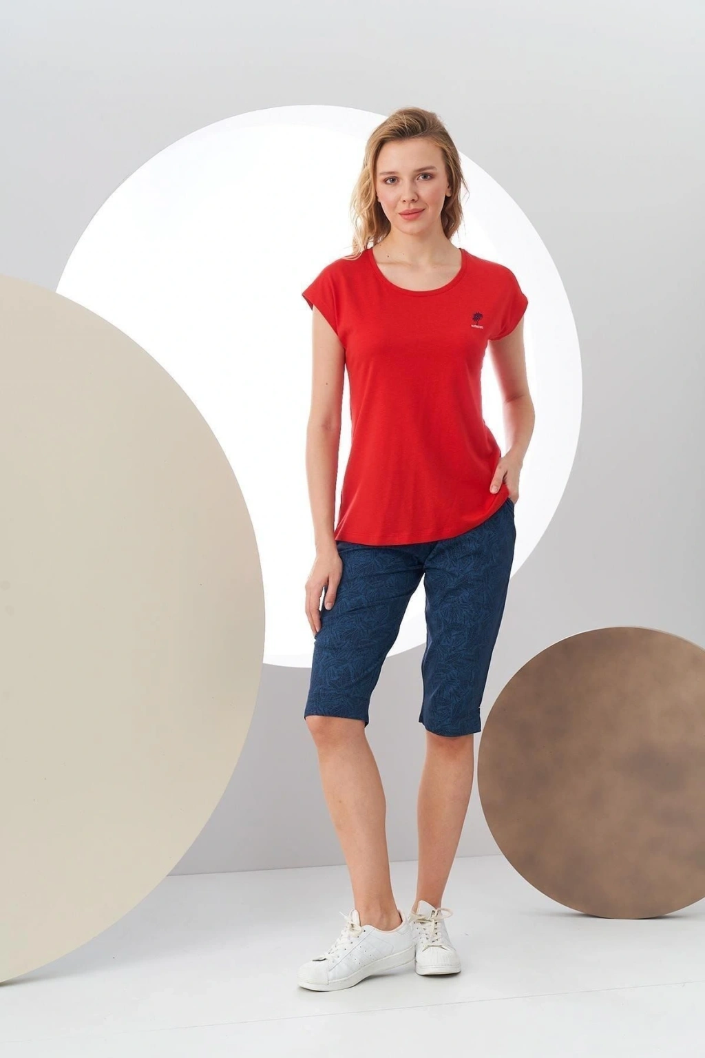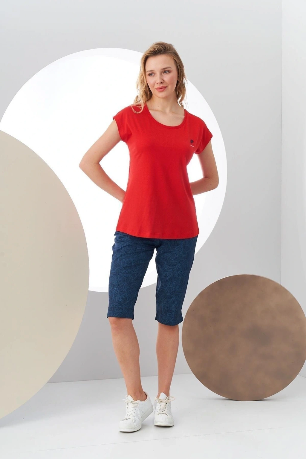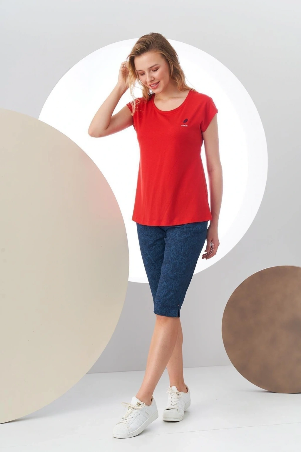 Desenli tasarımıyla göz alıcı bir görünüm sunarken, aynı zamanda zamansız parçalardan hoşlananlar için ideal bir seçim.; Normal bel kesimi sayesinde gün boyu rahatlık sağlayan ve vücut hatlarınızı nazikçe sararak konforlu bir kullanım sunuyor.; Kısa kol ve kapri kesimi ile yaz ayları için idealdir; serinlik hissi verirken aynı zamanda hareket özgürlüğünüzden ödün vermezsiniz.; Homewear koleksiyonunun vazgeçilmez parçası olarak tasarlanmıştır; evdeki rahatlığınız düşünülerek üretilmiştir.;