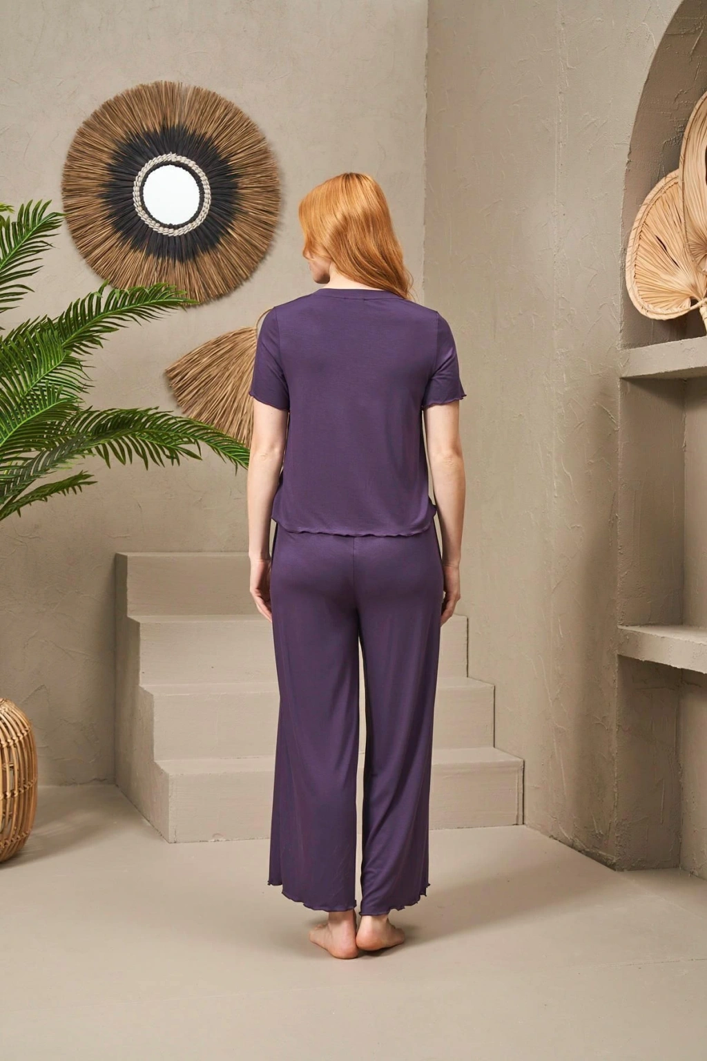 - Rahat kesimi ve normal bel tasarımı ile evde konforlu bir kullanım sunar; - Düz renk ve desen seçenekleriyle sade ve şık bir görünüm sağlar; - Homewear koleksiyonunun bir parçası olarak ev ortamına uygunluk gösterir; - Basic silueti sayesinde her vücut tipine uyum sağlar ve rahat bir kullanım sunar; - Cep detayları ile fonksiyonellik kazandırırken, günlük kullanım için idealdir; - Regular kalıp, hareket özgürlüğünüzü kısıtlamadan rahat bir oturuş sağlar; - Örgü dokuma tipi, dayanıklılığı artırarak uzun süreli kullanım imkanı tanır; - İki parçadan oluşan set, t-shirt ve pantolon olmak üzere tam bir pijama takımını oluşturur; - Kısa kol ve geniş paça tasarımı ile yaz ayları için idealdir; serin tutar ve rahat hareket etme olanağı tanır.; - V yaka kesimiyle modern ve zarif bir görünüm sunarken, kısa boyu da rahatlık sağlar.; - Tüm yaş gruplarına hitap eden tasarımıyla geniş bir kullanıcı kitlesine uygundur.; - Viskon materyali;