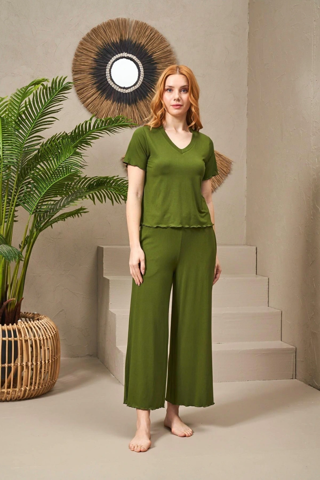 - Rahat kesimi ve normal bel tasarımı ile evde konforlu bir kullanım sunar; - Düz renk ve desen seçenekleriyle sade ve şık bir görünüm sağlar; - Homewear koleksiyonunun bir parçası olarak ev ortamına uygunluk gösterir; - Basic silueti sayesinde her vücut tipine uyum sağlar ve rahat bir kullanım sunar; - Cep detayları ile fonksiyonellik kazandırırken, günlük kullanım için idealdir; - Regular kalıp, hareket özgürlüğünüzü kısıtlamadan rahat bir oturuş sağlar; - Örgü dokuma tipi, dayanıklılığı artırarak uzun süreli kullanım imkanı tanır; - İki parçadan oluşan set, t-shirt ve pantolon olmak üzere tam bir pijama takımını oluşturur; - Kısa kol ve geniş paça tasarımı ile yaz ayları için idealdir; serin tutar ve rahat hareket etme olanağı tanır.; - V yaka kesimiyle modern ve zarif bir görünüm sunarken, kısa boyu da rahatlık sağlar.; - Tüm yaş gruplarına hitap eden tasarımıyla geniş bir kullanıcı kitlesine uygundur.; - Viskon materyali;