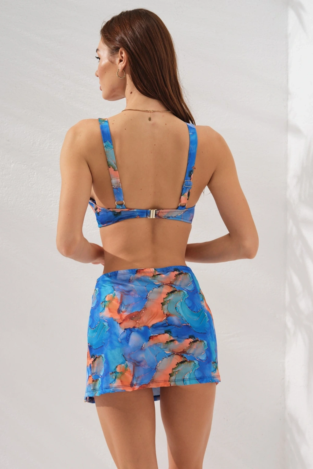 3'lü Mavi Fra Batik Desenli Mini Yırtmaçlı Etek Bikini Takımı Üçgen Askılı Pedli Toparlayıcı