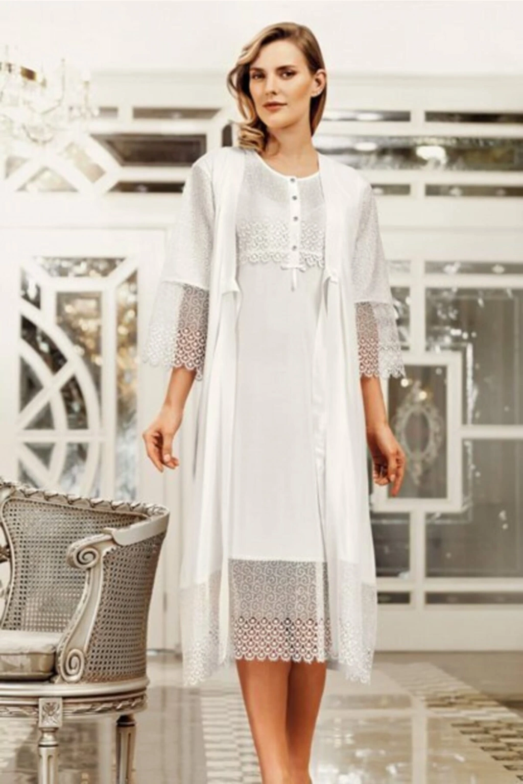 6406 Sabahlık Gecelik 2li Takım Ekru
