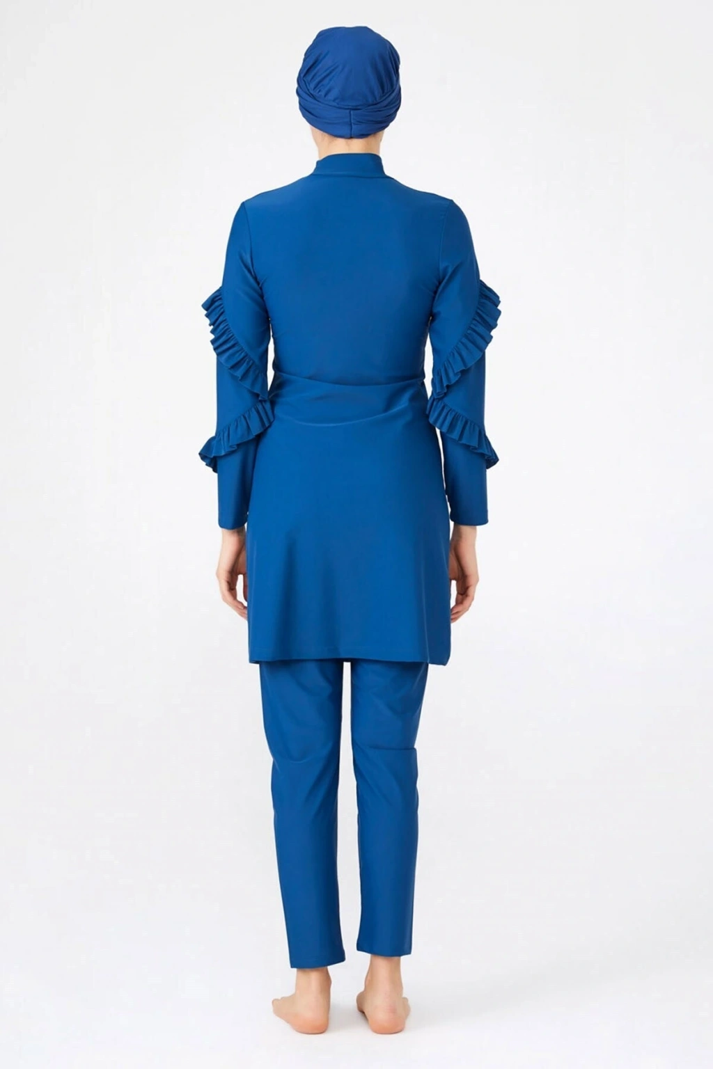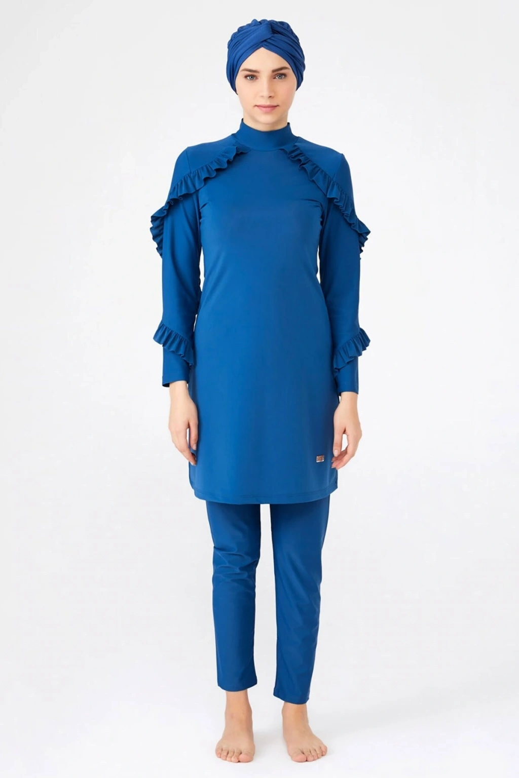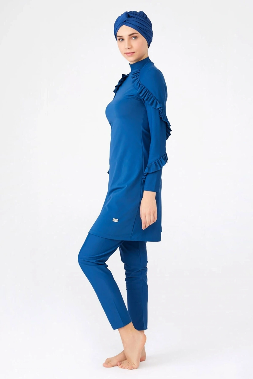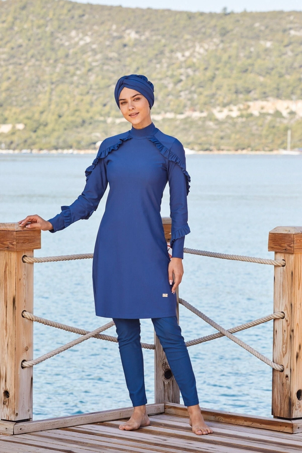Esnek ve rahat hareket imkanı sunan likra materyali ile konforlu bir yüzme deneyimi sağlar; Fırfır detayları ile şık ve feminen bir görünüm kazandırırken, suyun içinde ve dışında stil sahibi olmanızı sağlar; Açık lacivert rengi, güneşin altında bile şıklığınızdan ödün vermeden rahatça yüzebilmenize olanak tanır; Tesettür mayonuzun her detayı, suyun içinde ve dışında rahat etmenizi düşünerek tasarlanmıştır;