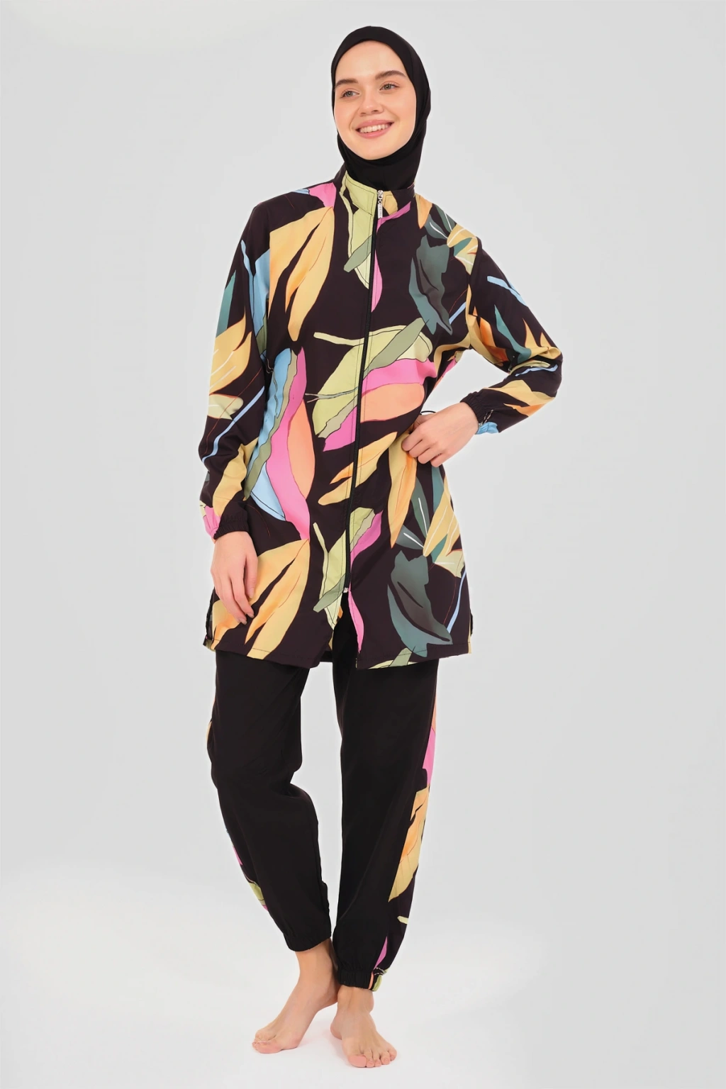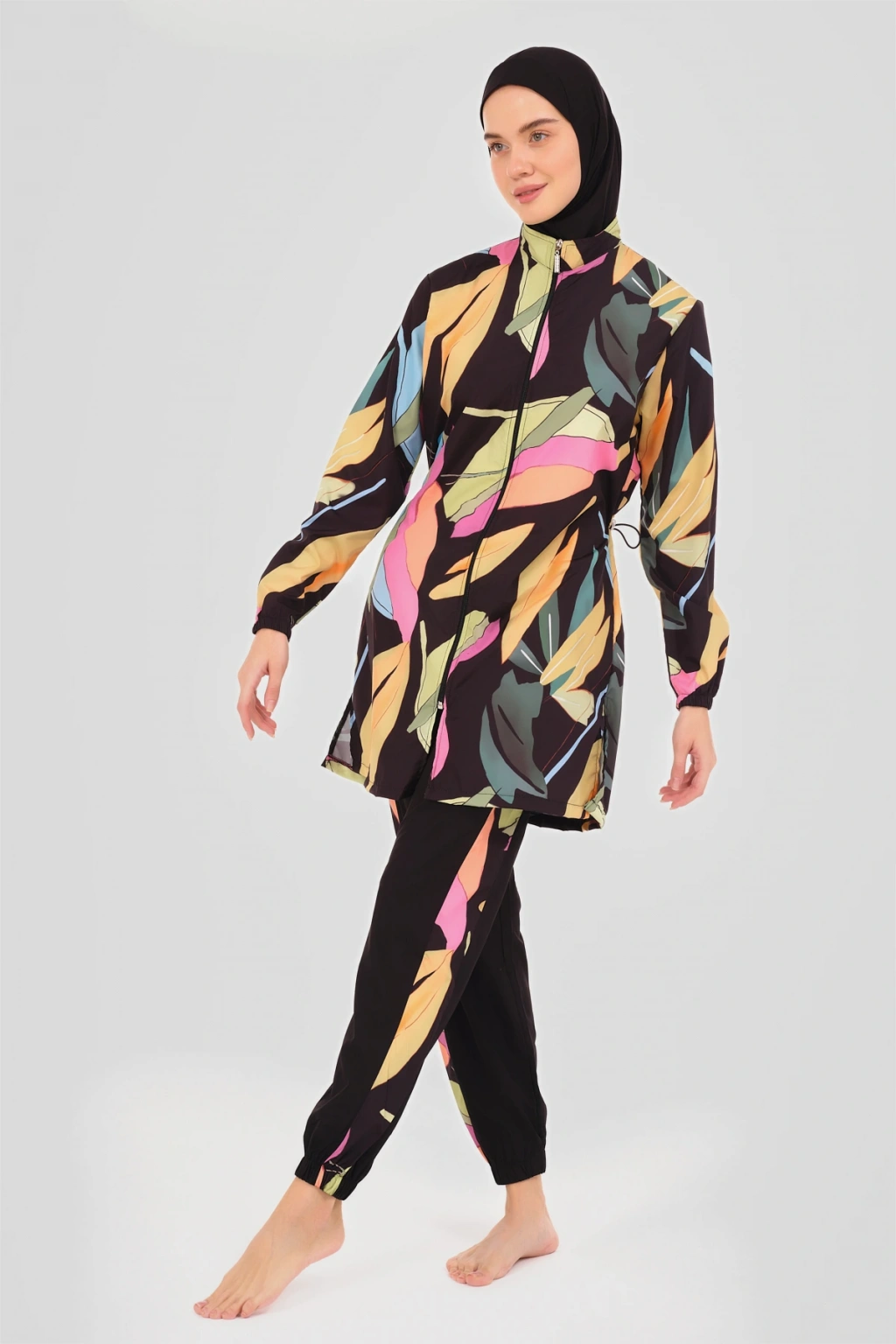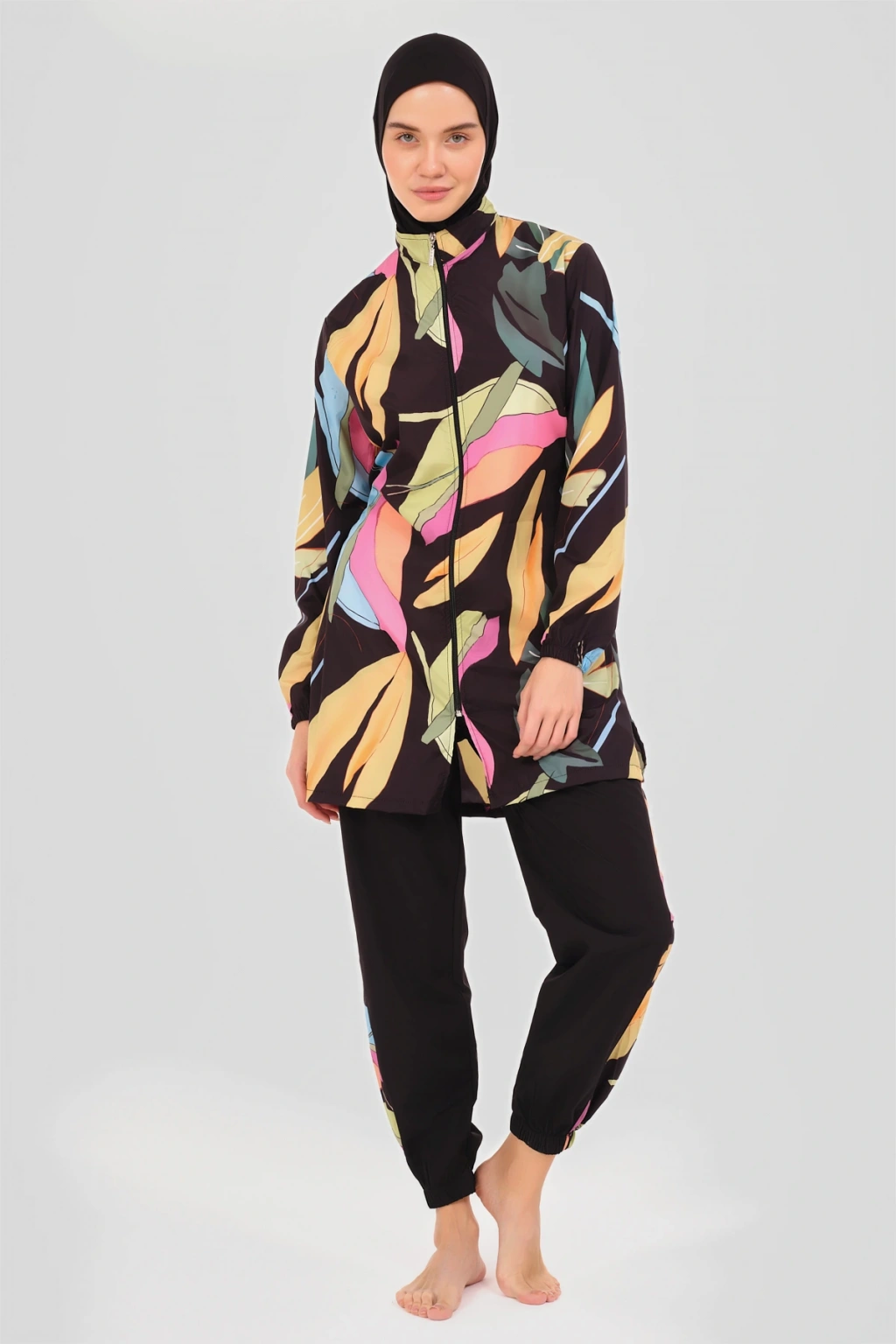 Atina Desenli Tesettür Mayo Tropikal esintiler taşıyan palmiye desenli tesettür mayomuz, yazın sıcak günlerinde serinletici bir stil vadediyor. ; Uzun kesimi ve kaliteli kumaşı ile konfor ve şıklığı bir arada sunar, plajlarda ve havuz başında göz alıcı bir görünüm sağlar. ; Tanım Su itici . ; Suyu iten apreli paraşüt kumaş. ; Üst desenli. ; Uzun kollu. ; Önü fermuar kapamalı. ; Dik yaka. ; Yanları desenli pantolon. ; Lastikli paça. ; Likra eşarp ve bone. ; Tek parça iç çamaşır. ; Paket İçeriği Üst, Pantolon, Eşarp, Bone, Tek parça iç çamaşırı olmak üzere 5 parçadan oluşmaktadır. ; Hızlı kuruma, kolay yüzme olanağı sağlar. ; Kumaş İçeriği Ana Kumaş : %100 Poliester, Su itici paraşüt kumaş . ; Yardımcı Kumaş : %95 Poliester, %5 Elastan, Su itici apre uygulanmıştır.;