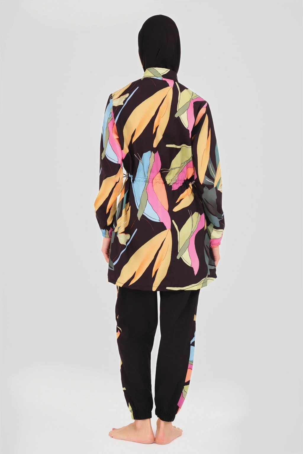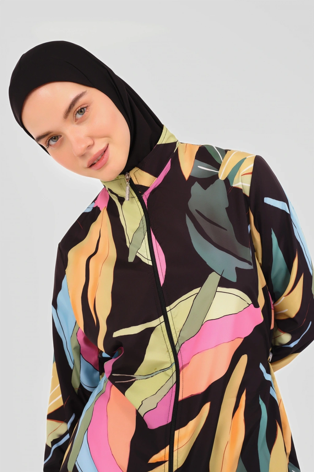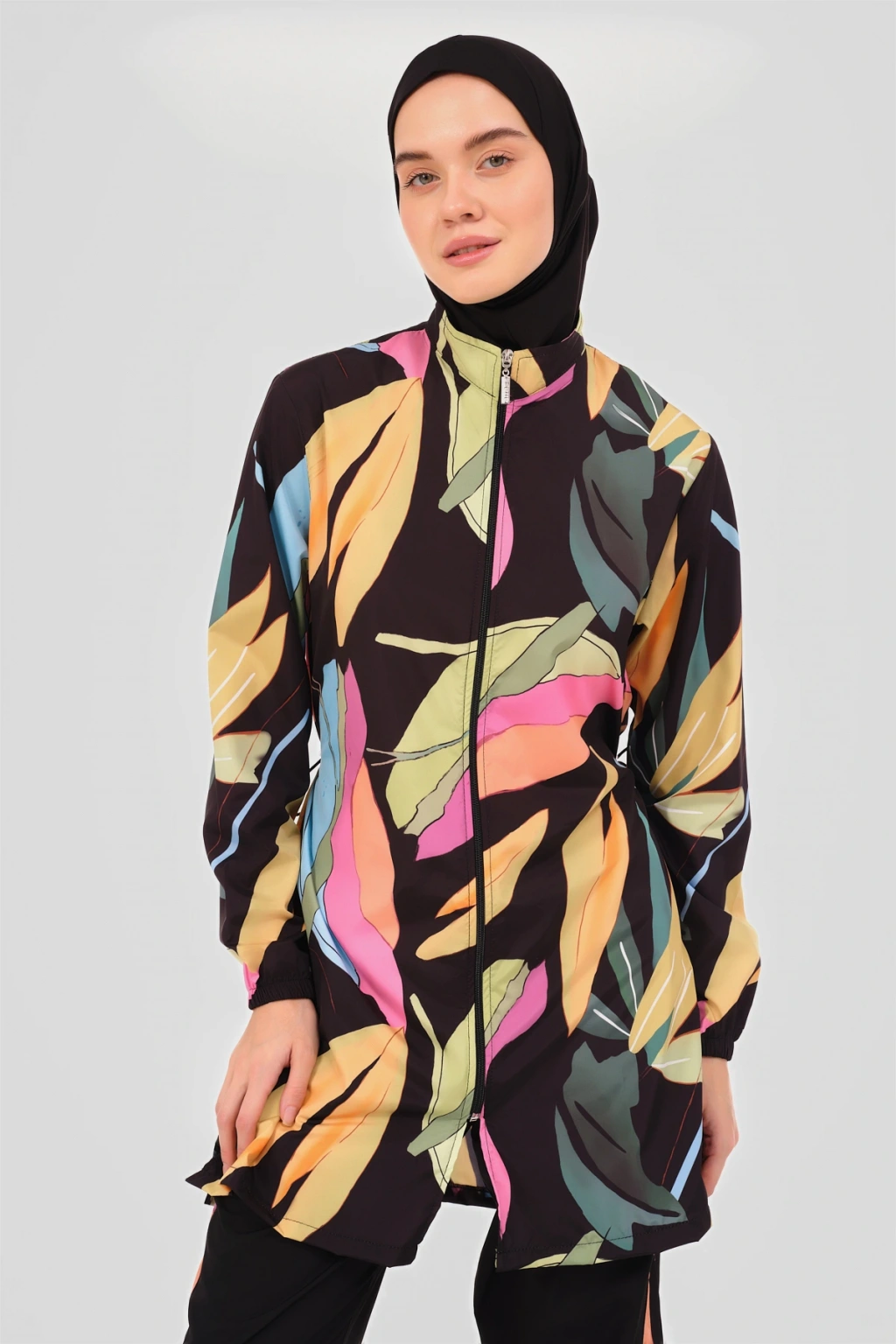 Atina Desenli Tesettür Mayo Tropikal esintiler taşıyan palmiye desenli tesettür mayomuz, yazın sıcak günlerinde serinletici bir stil vadediyor. ; Uzun kesimi ve kaliteli kumaşı ile konfor ve şıklığı bir arada sunar, plajlarda ve havuz başında göz alıcı bir görünüm sağlar. ; Tanım Su itici . ; Suyu iten apreli paraşüt kumaş. ; Üst desenli. ; Uzun kollu. ; Önü fermuar kapamalı. ; Dik yaka. ; Yanları desenli pantolon. ; Lastikli paça. ; Likra eşarp ve bone. ; Tek parça iç çamaşır. ; Paket İçeriği Üst, Pantolon, Eşarp, Bone, Tek parça iç çamaşırı olmak üzere 5 parçadan oluşmaktadır. ; Hızlı kuruma, kolay yüzme olanağı sağlar. ; Kumaş İçeriği Ana Kumaş : %100 Poliester, Su itici paraşüt kumaş . ; Yardımcı Kumaş : %95 Poliester, %5 Elastan, Su itici apre uygulanmıştır.;