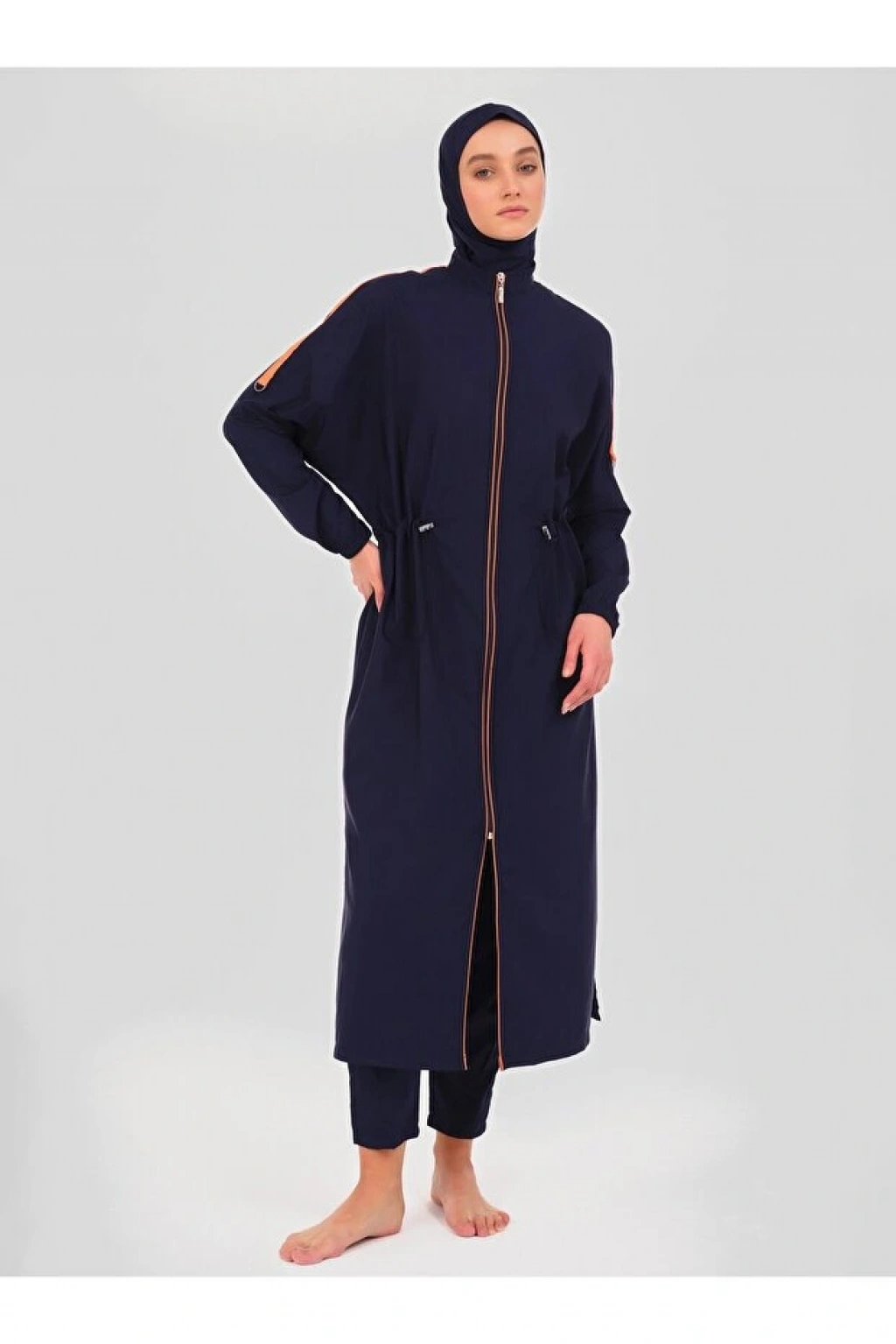 Bu özel tasarım tam kapalı yüzücü elbisesi, derin ve tok rengi (lacivert) ile zarif bir duruş sergilerken, modern drapaj detayı ile vücut hatlarını mükemmel bir şekilde şekillendiriyor. Şıklık, konfor ve üst düzey kapanmayı bir arada arayanlar için ideal.