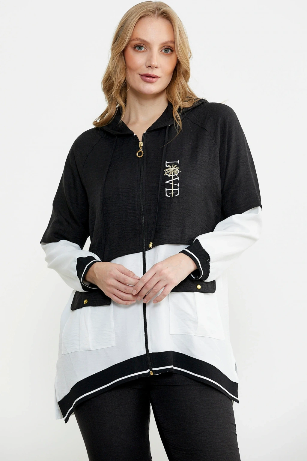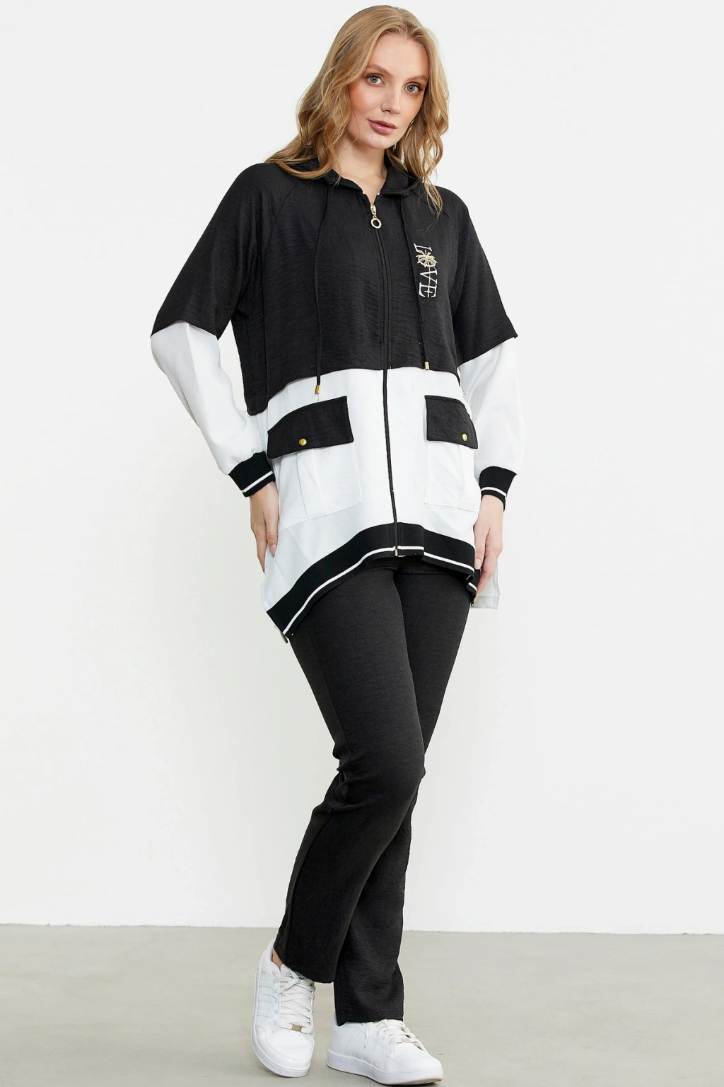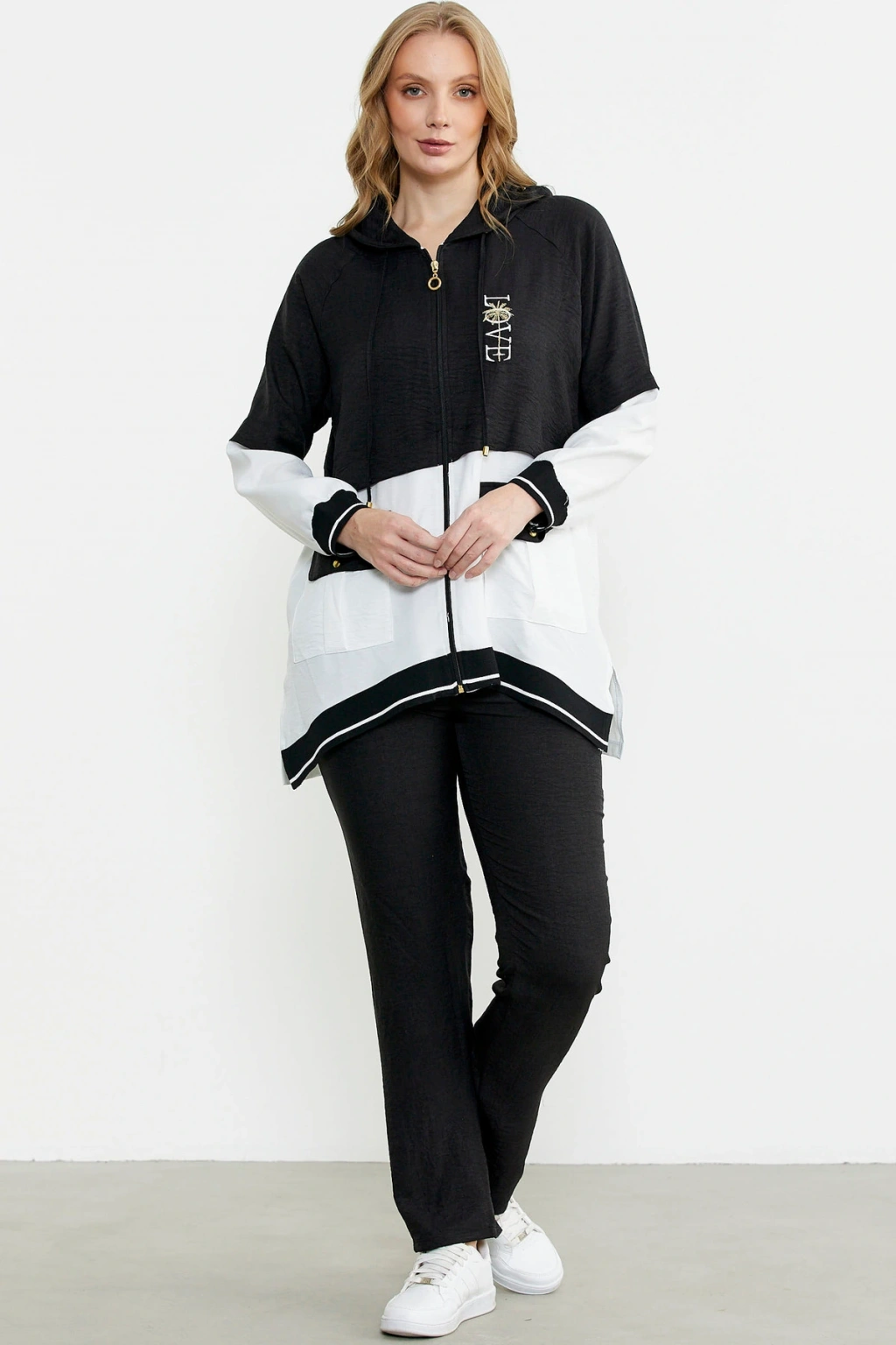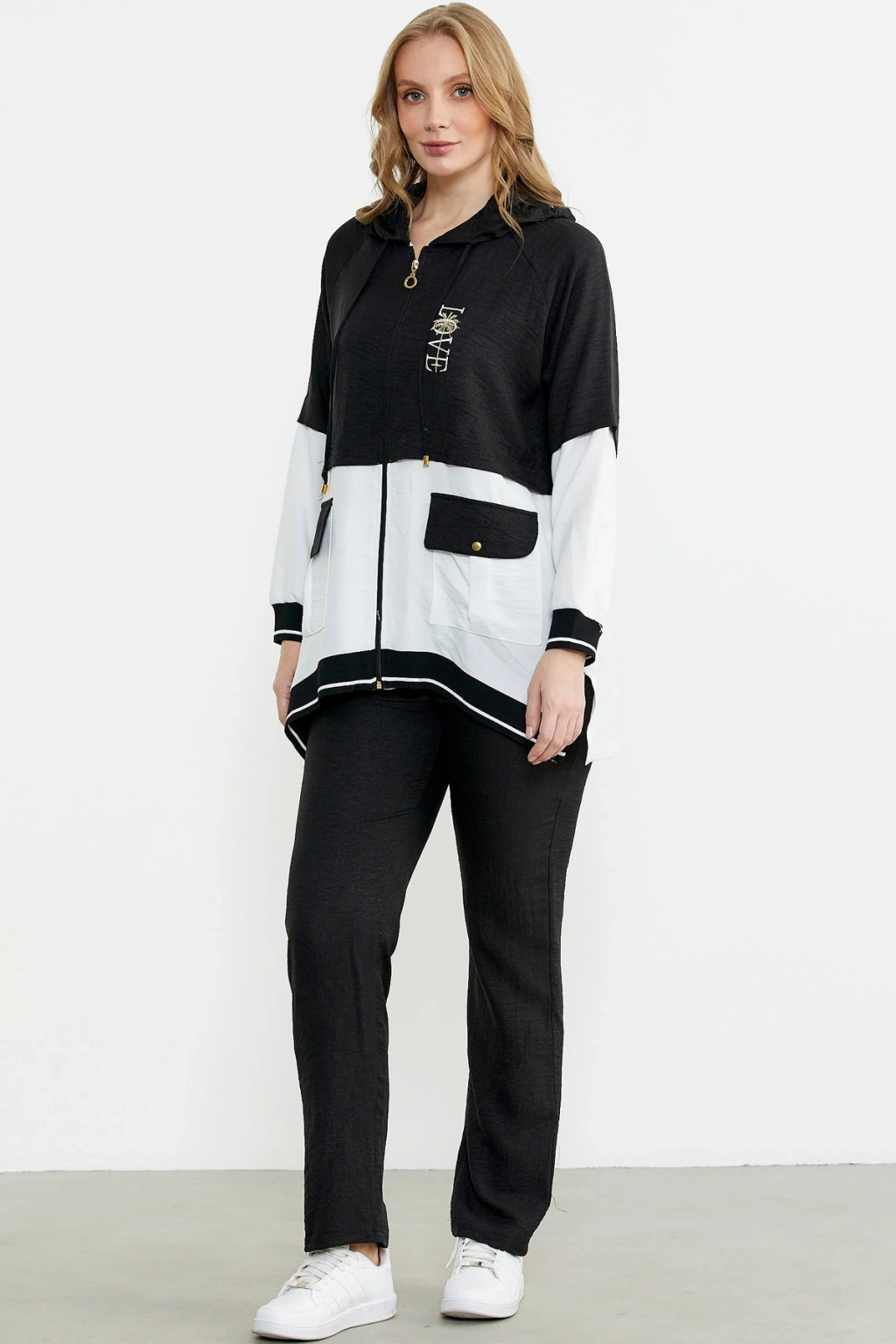 Fermuar Kapamalı Nakışlı Tunik Takım - Siyah