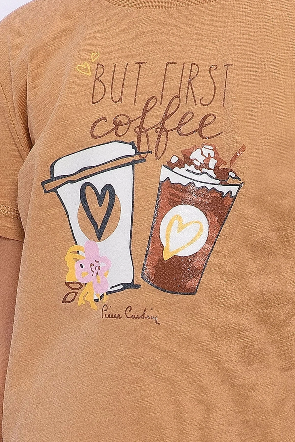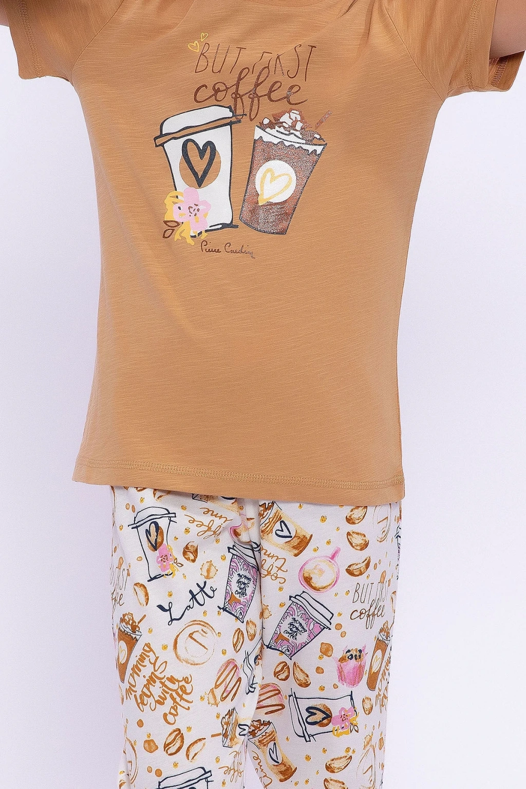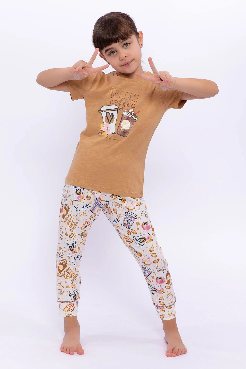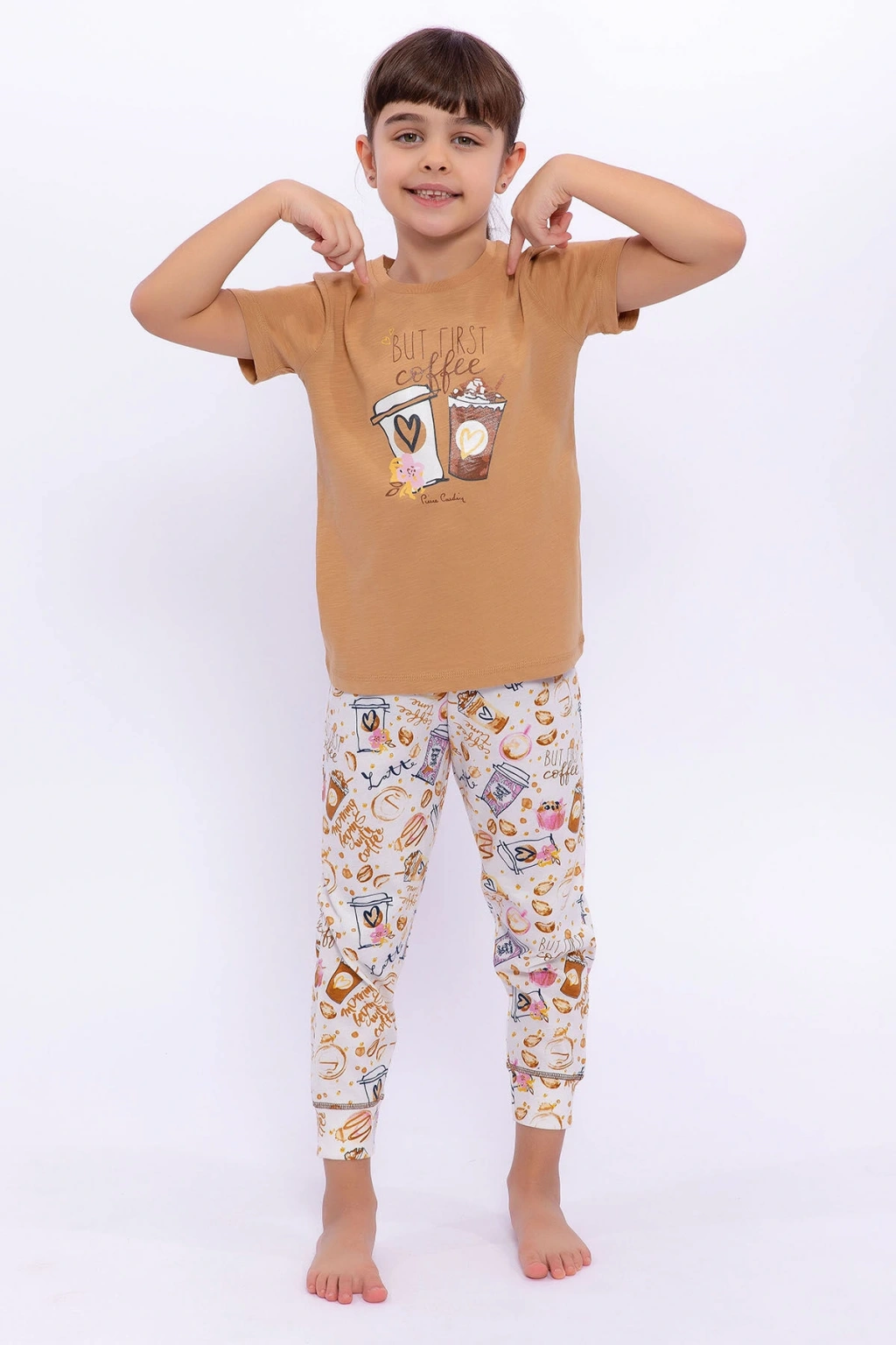 Bu onun ilk kahvesi! Anneler kahve tiryakisi olur da kız çocukları onun izinden gitmez mi? Anne- kız pijama takımlarımıza bir yenisini daha ekleyerek çocuklar için harika bir tasarım yaptık. İki parçadan oluşan takımımızın tişörtüne iki bardak kahve görseli ekleyerek bardakların ortasına kalp kondurduk. Üzerine ise onların kahve sevdasına atıfta bulunarak ‘ilk kahve’ mesajımızı ekledik. Bisiklet yaka sayesinde ise çocuklarımızı serin havalardan korumak istedik. Alt parçayı ise rüzgârlı yaz günlerinde rahat uyumaları ve vücut ısılarını koruyabilmek için uzun tuttuk. Kumaş olarak tek renk kullanmak yerine bol kahve ve kahve bardaklarından oluşan renkli ve dinamik bir baskılı kumaş kullandık. Burada da mesajları unutmayarak “Sabahlar kahve eşliğinde başlar” yazısını ekledik. Takımın önden görüntüsü oldukça hareketli. Bu nedenle tişörtün arka kısmını tek renk kullanarak bir denge oluşturmak istedik. Yaz gecelerinde rahat bir uyku uyumak isteyen çocuklar için tasarladığımız Pierre Cardin ‘But First Coffe’ mesajlı takımımızdan memnun kalacağınızdan eminiz. Çocuklar! Sabah kahvenizi nasıl almak istersiniz? Ürün Kodu: PC8286-C-V1 Sezon : İlkbahar-Yaz Marka: Pierre Cardin Renk: Camel Cinsiyet:Kız Çocuk