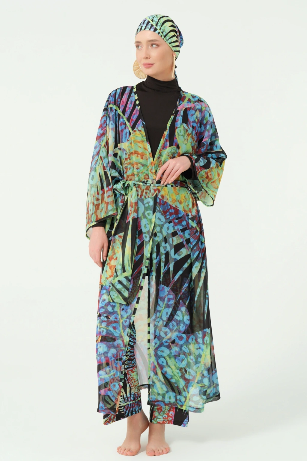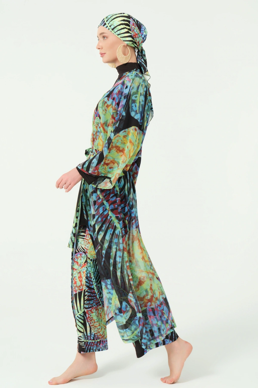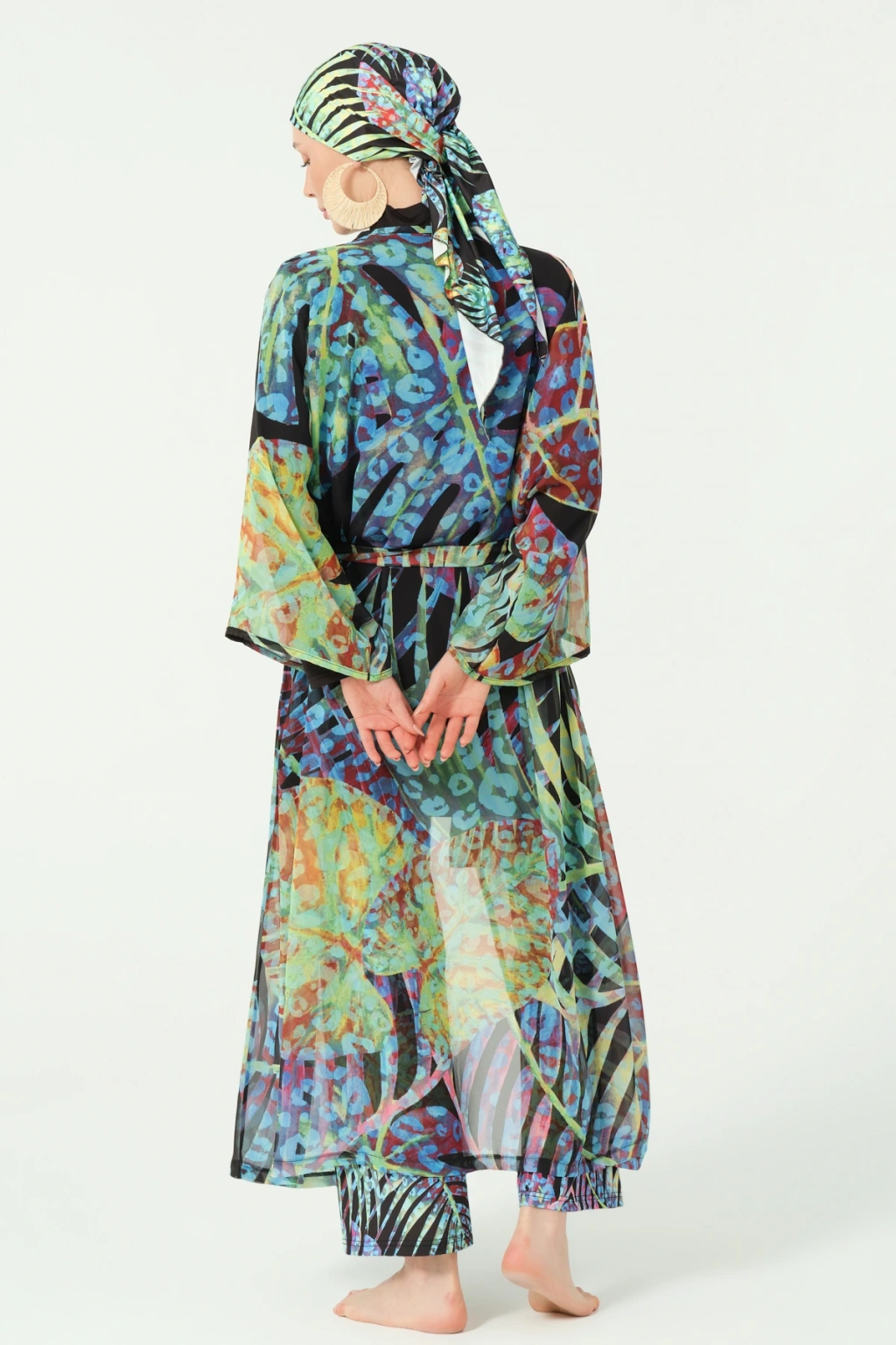 TR: Desenli şifon kumaş. Kemer detaylı tasarım.
