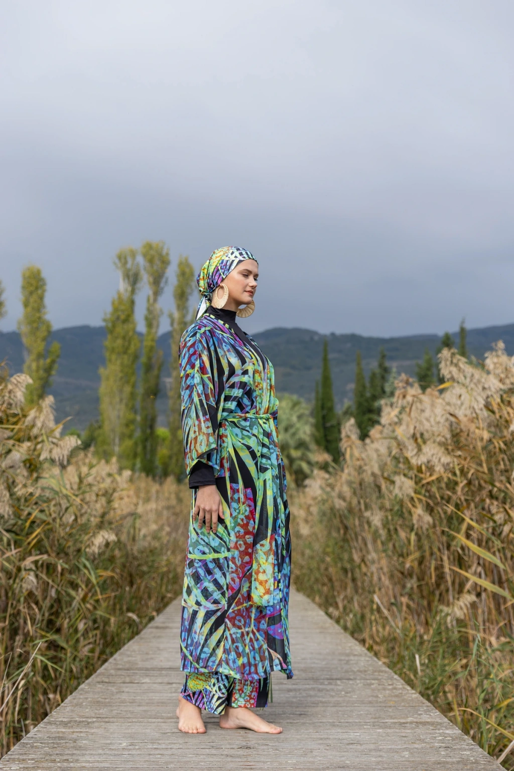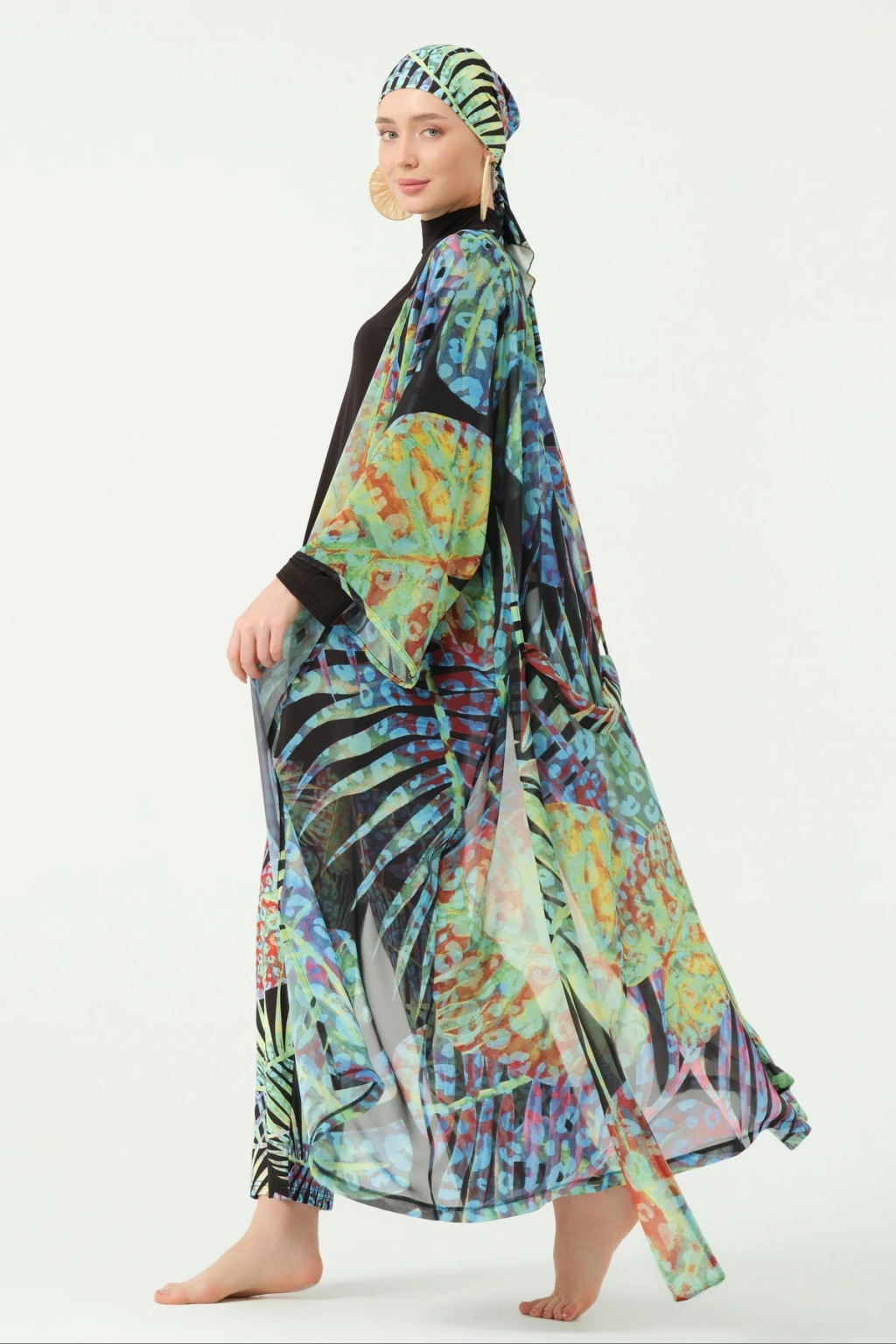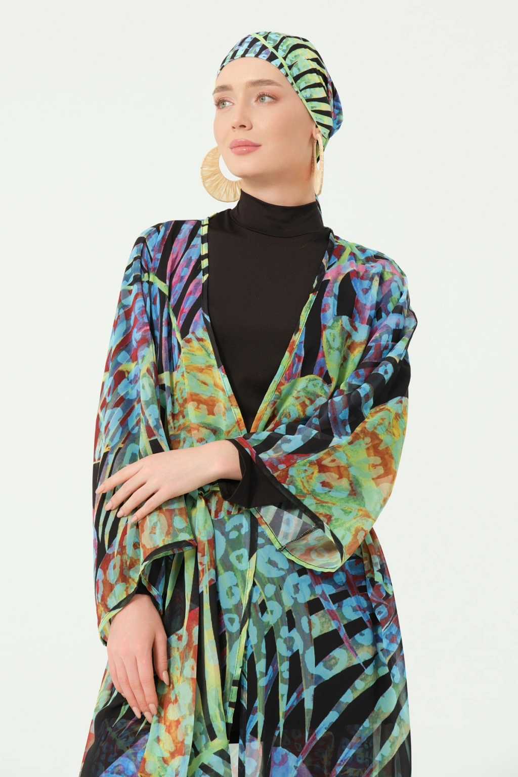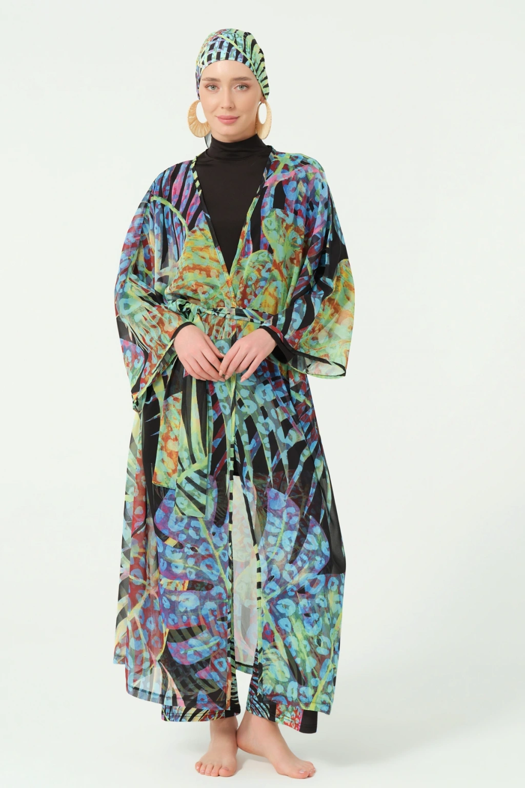 TR: Desenli şifon kumaş. Kemer detaylı tasarım.