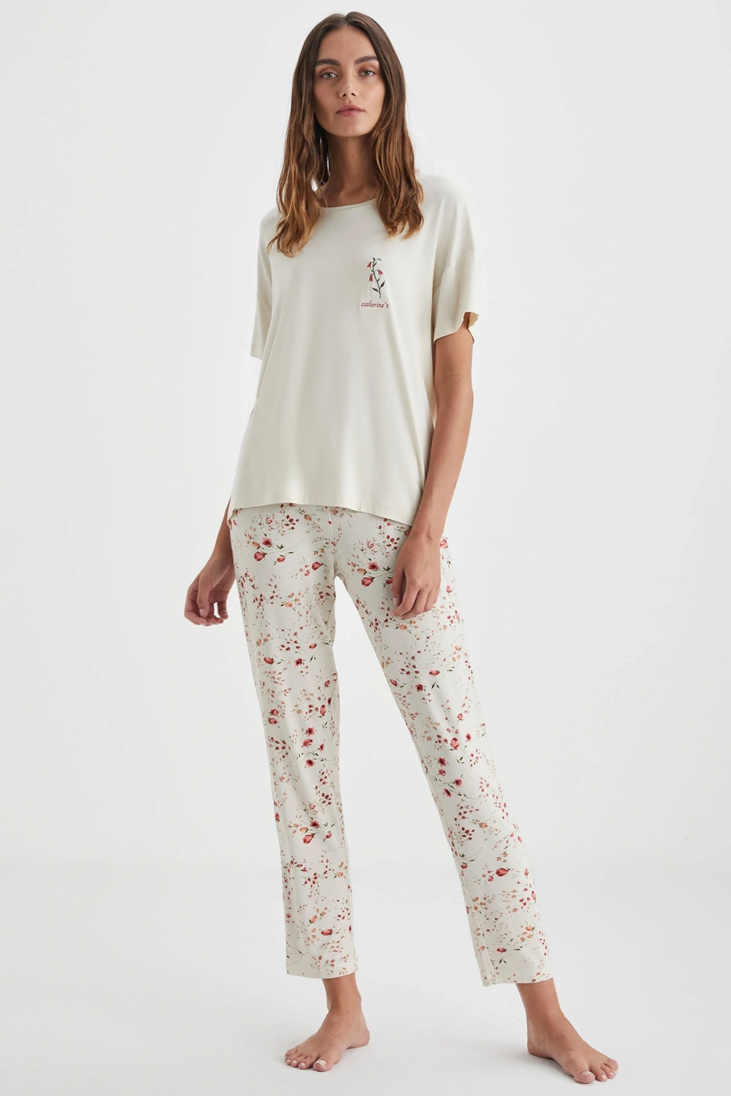Yumuşak dokulu ve çiçek desenli pijama takımı.