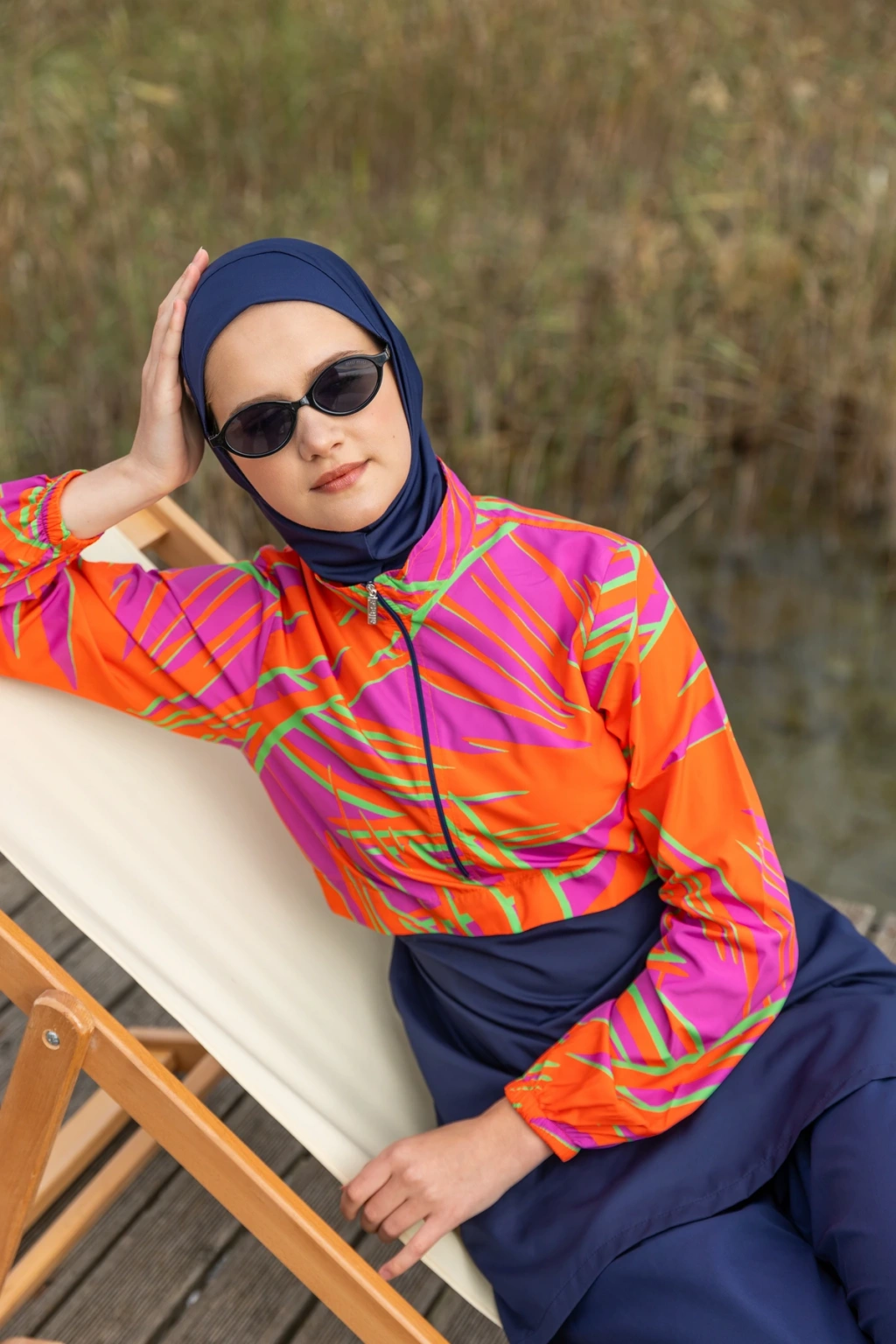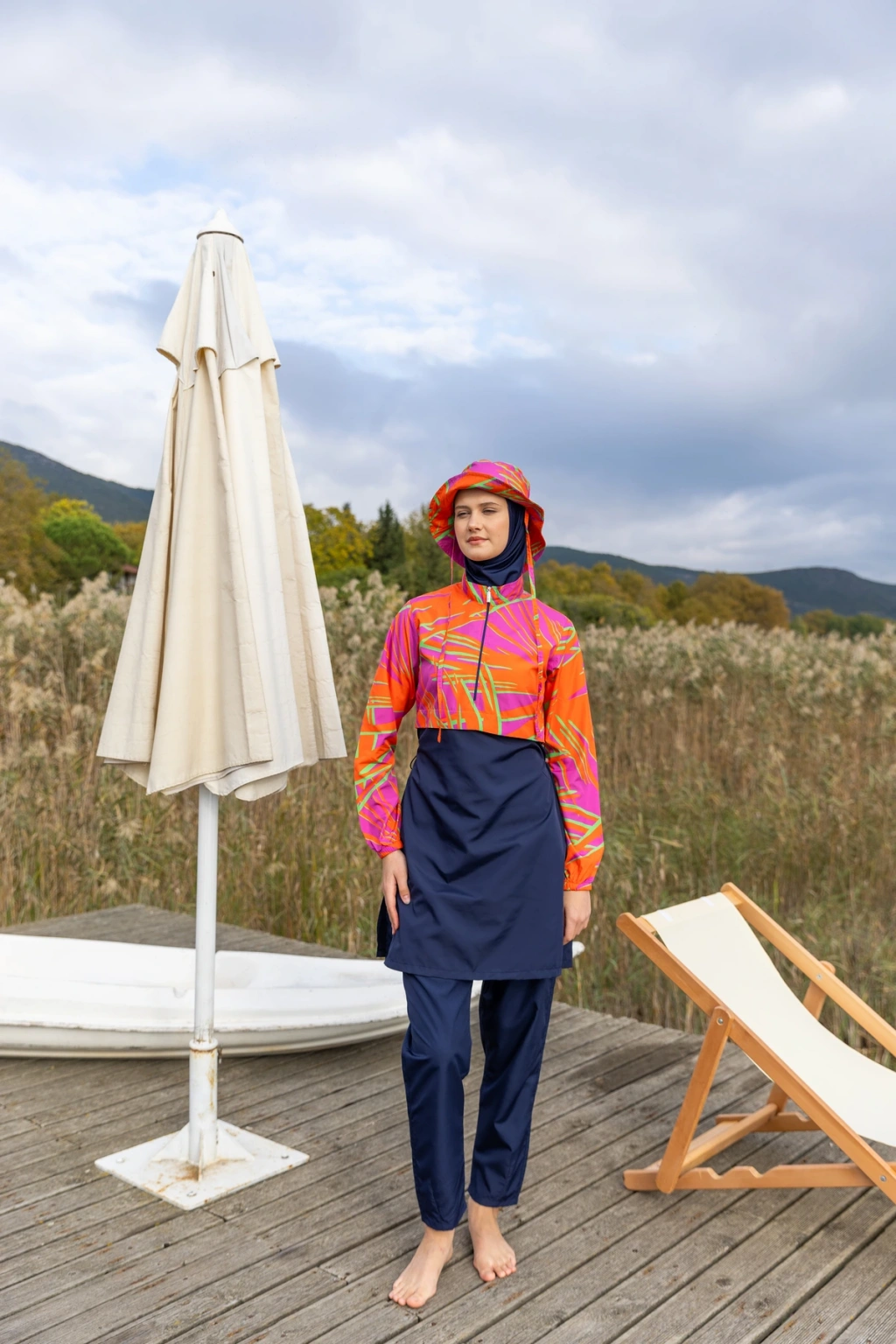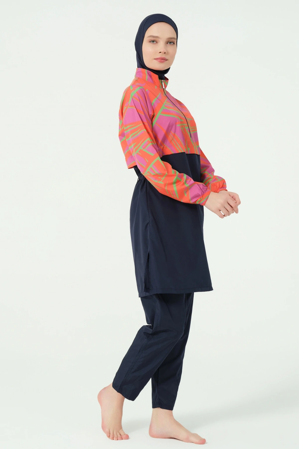 Lian Kıl Biye Detaylı Paraşüt Kumaş Tam Kapalı Tesettür Mayo Lacivert DLX-25289