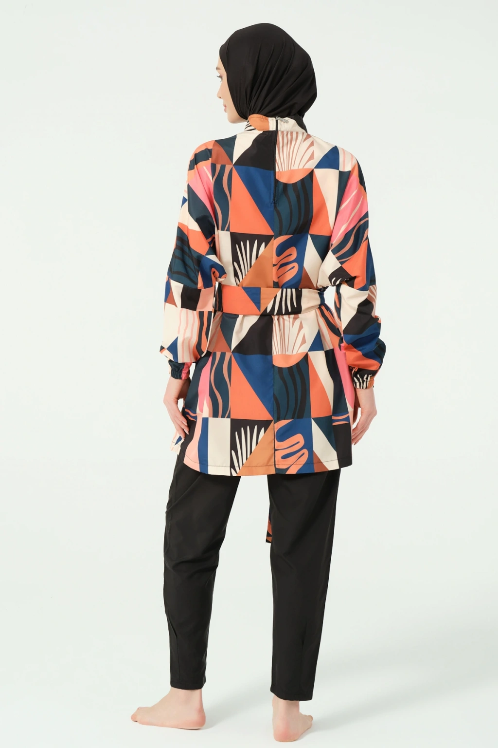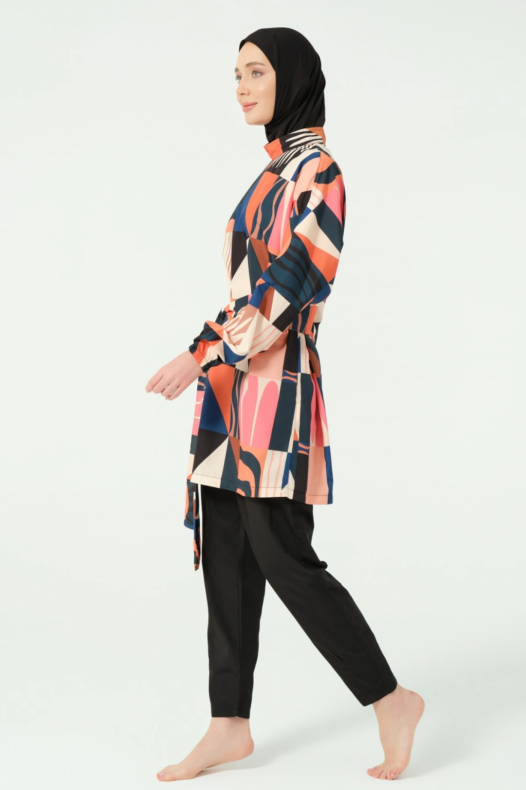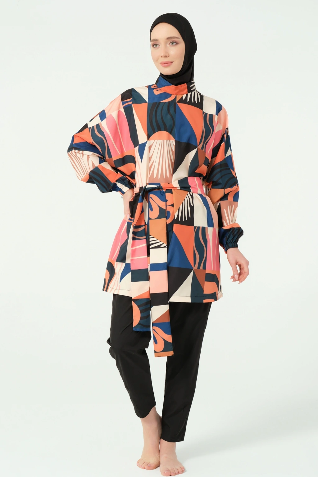 TR: Üst, Pantolon, Eşarp, Bone, Tek parça iç çamaşırı olmak üzere 5 parçadan oluşmaktadır. Hızlı kuruma, kolay yüzme olanağı sağlar.