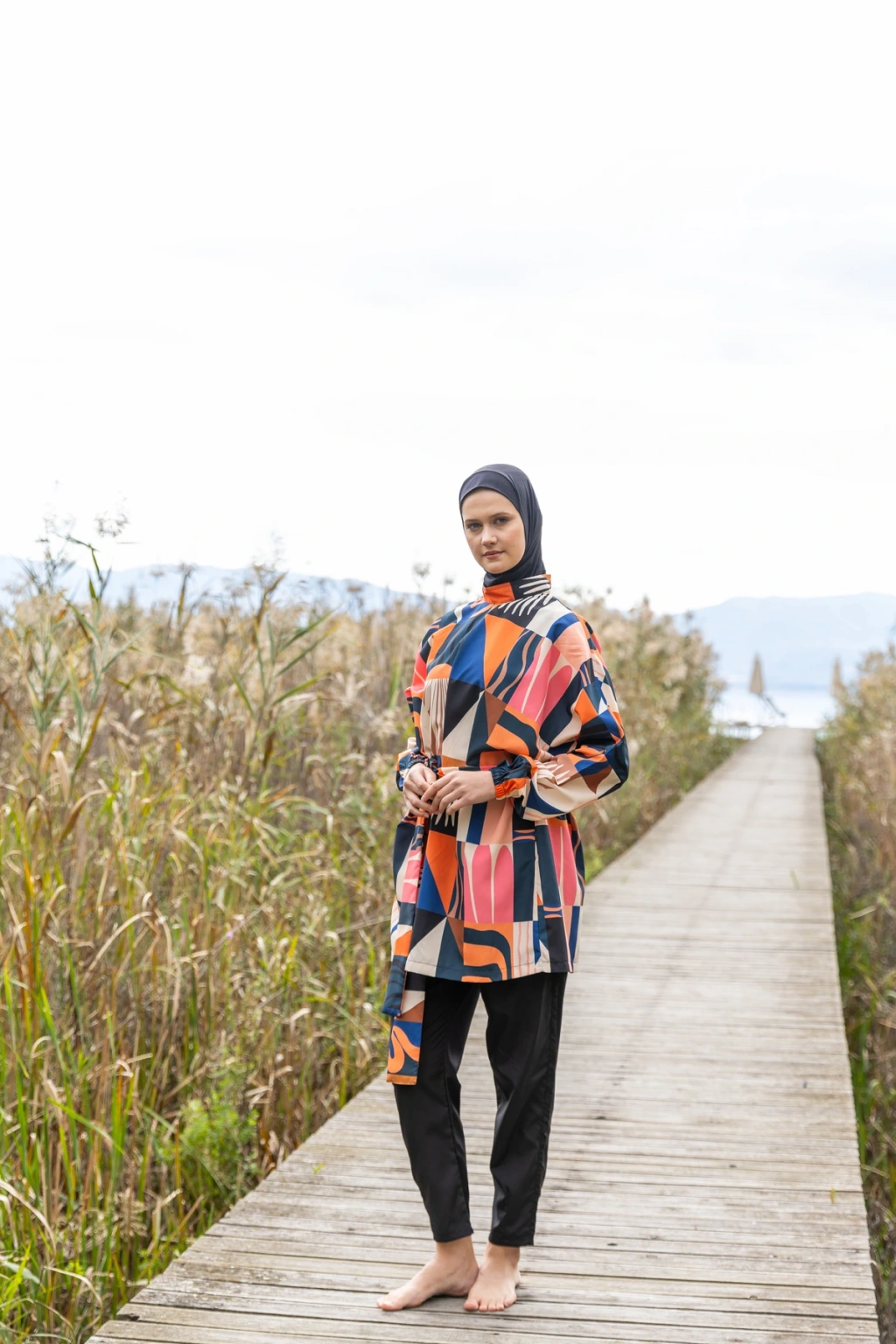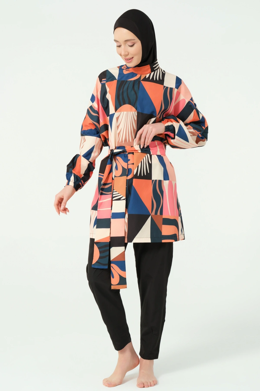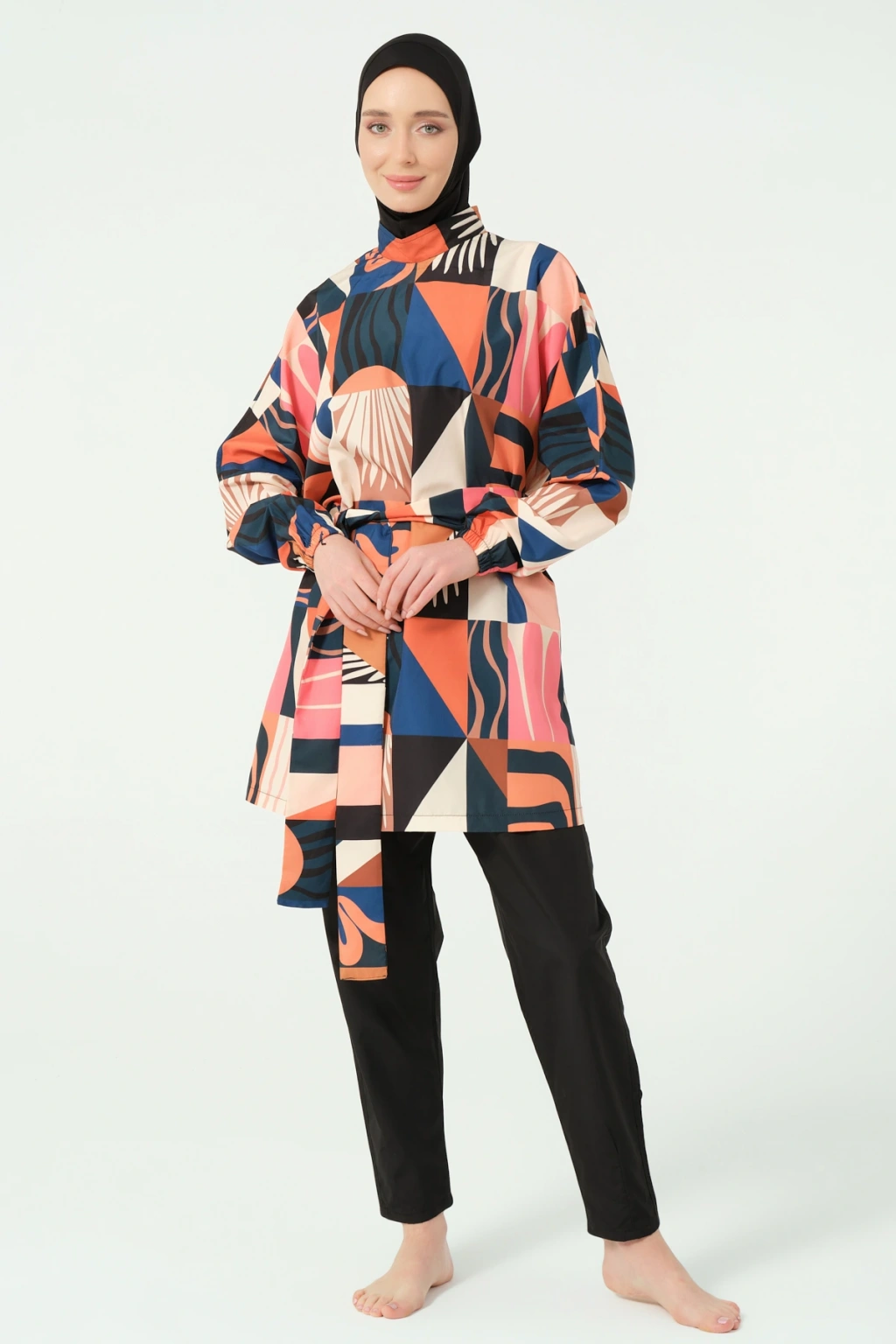 TR: Üst, Pantolon, Eşarp, Bone, Tek parça iç çamaşırı olmak üzere 5 parçadan oluşmaktadır. Hızlı kuruma, kolay yüzme olanağı sağlar.