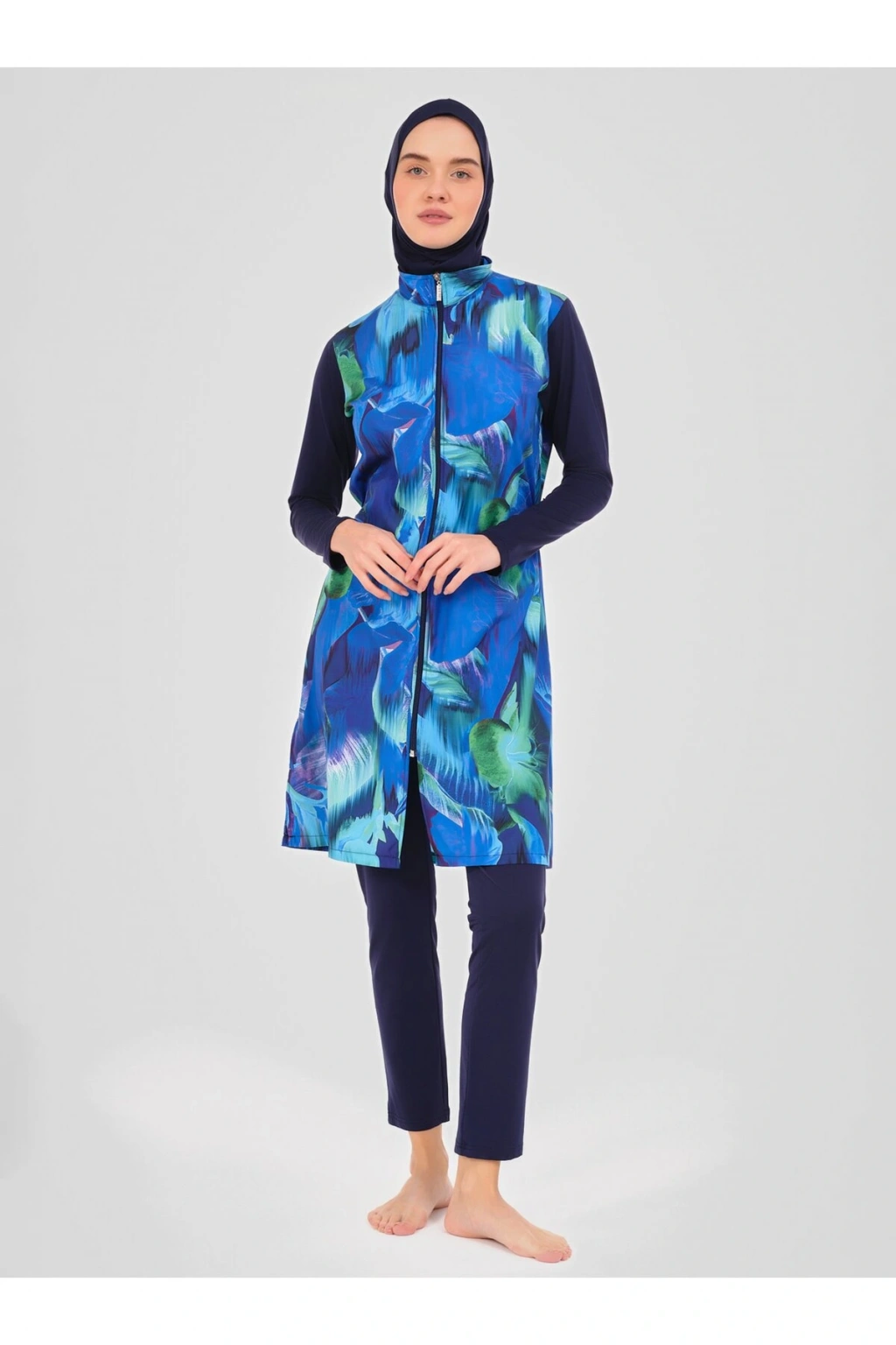 %100 Poliester, Su itici paraşüt kumaş - %95 Poliester, %5 Elastan, Su itici apre uygulanmıştır.; Üst, Tayt, Eşarp, Bone, Tek parça iç çamaşırı olmak üzere 5 parçadan oluşmaktadır.; Hızlı kuruma, kolay yüzme olanağı sağlar.; Su itici apreli.; Üst desenli paraşüt kumaş.; Önü fermuar kapamalı.; Dik yaka.; Likra uzun kol.; Likra tayt.; Likra eşarp ve bone.; Tek parça iç çamaşır.; Kumaş Bilgisi: %100 Polyester Resimdeki ürünün ölçüleri: Beden: M