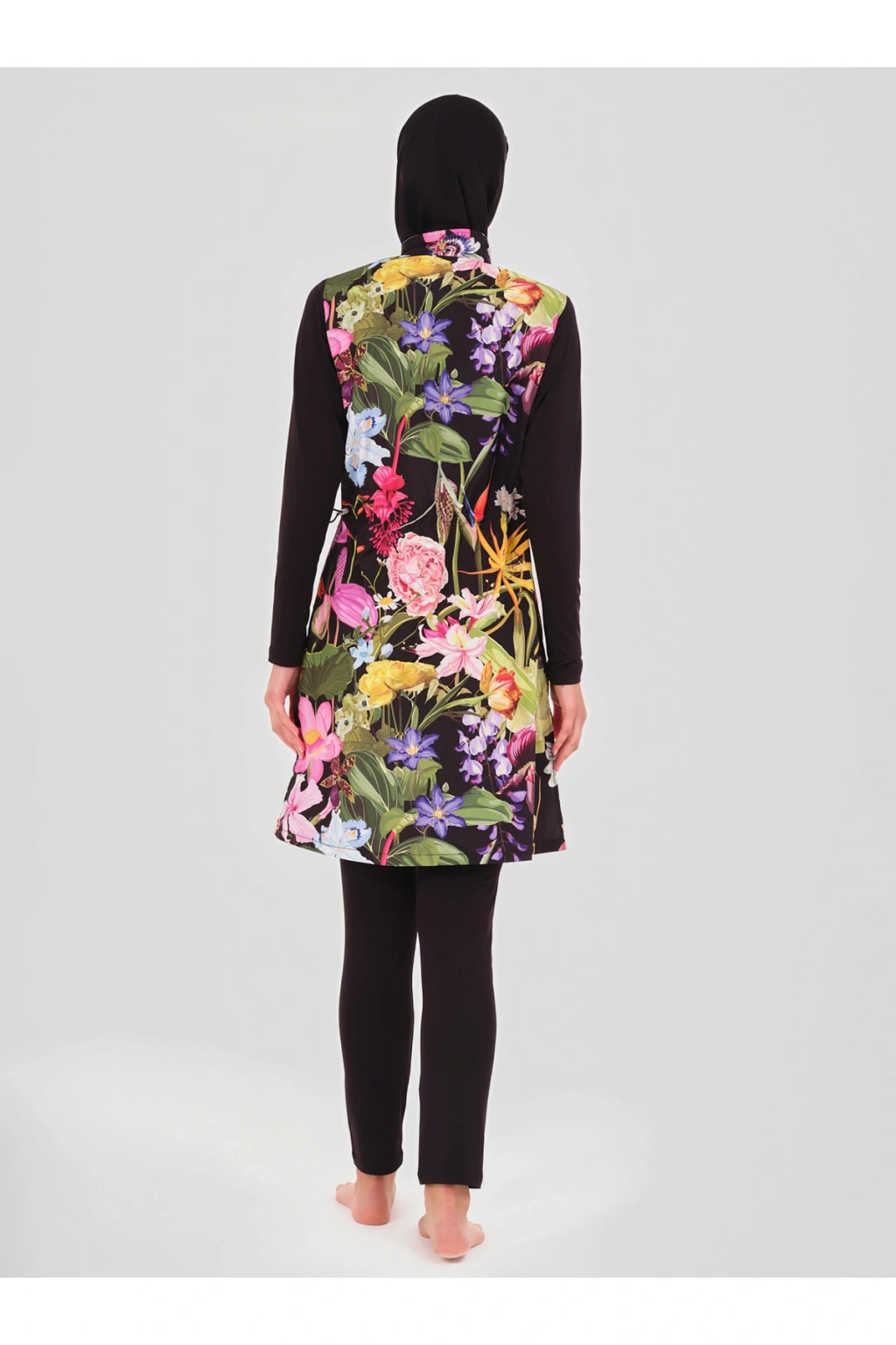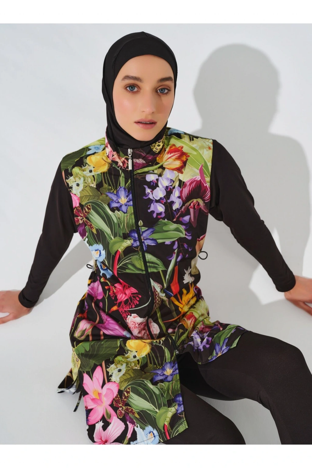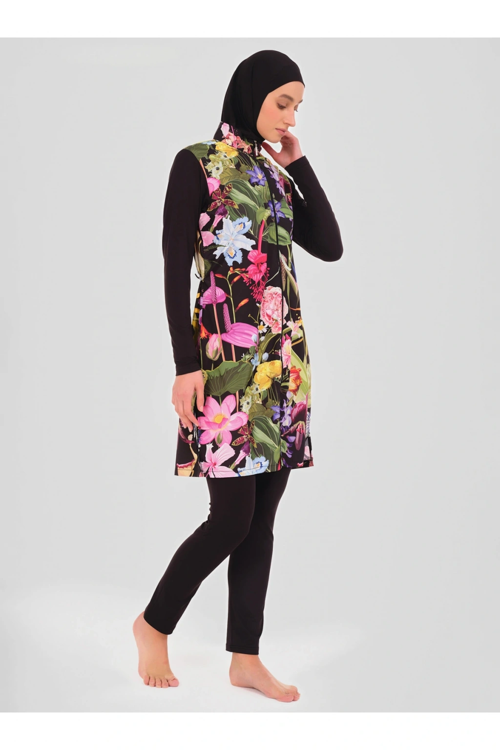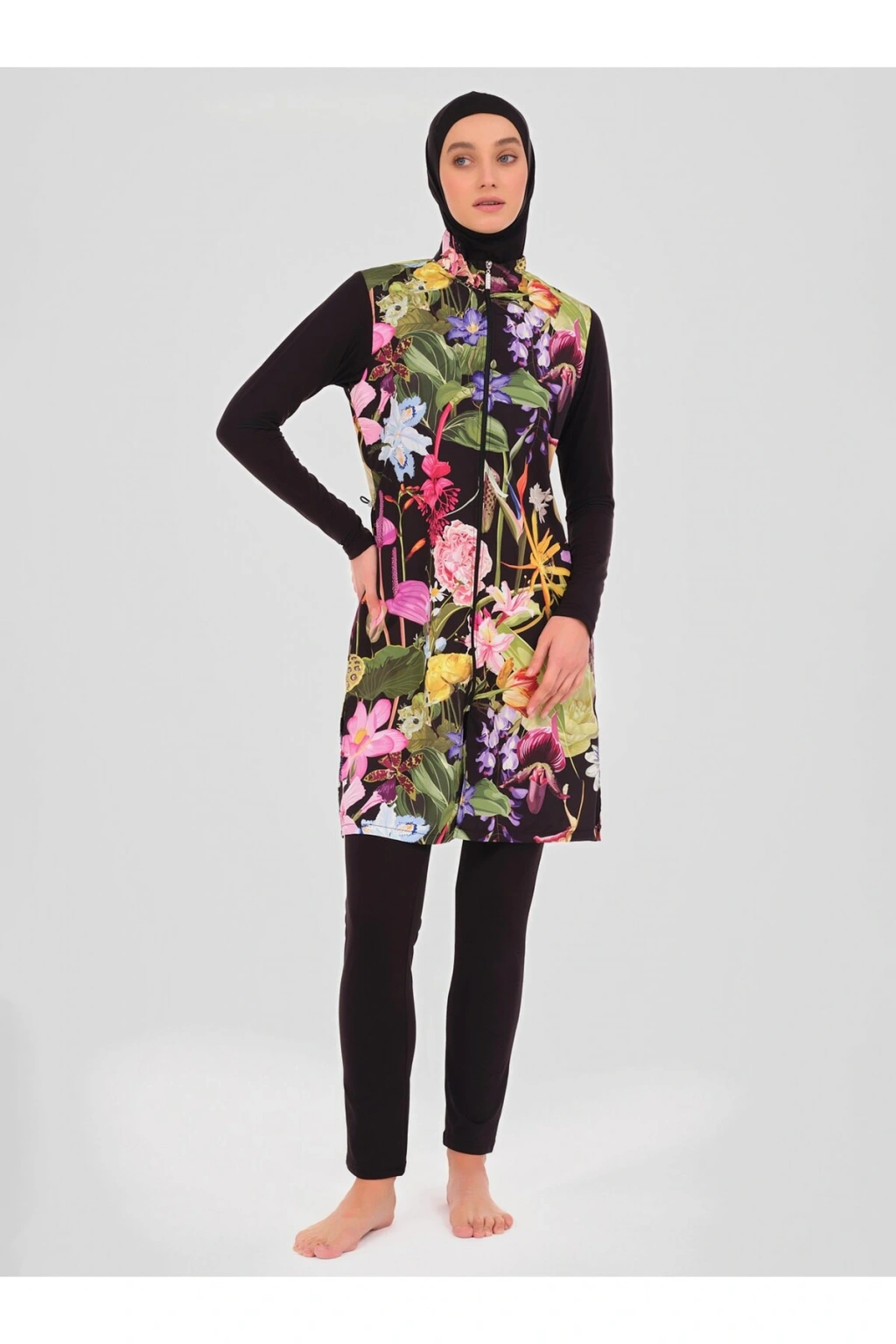 %100 Poliester, Su itici paraşüt kumaş - %95 Poliester, %5 Elastan, Su itici apre uygulanmıştır.; Üst, Tayt, Eşarp, Bone, Tek parça iç çamaşırı olmak üzere 5 parçadan oluşmaktadır.; Hızlı kuruma, kolay yüzme olanağı sağlar.; Su itici apreli.; Üst desenli paraşüt kumaş.; Önü fermuar kapamalı.; Dik yaka.; Likra uzun kol.; Likra tayt.; Likra eşarp ve bone.; Tek parça iç çamaşır.; Kumaş Bilgisi: %100 Polyester Resimdeki ürünün ölçüleri: Beden: M