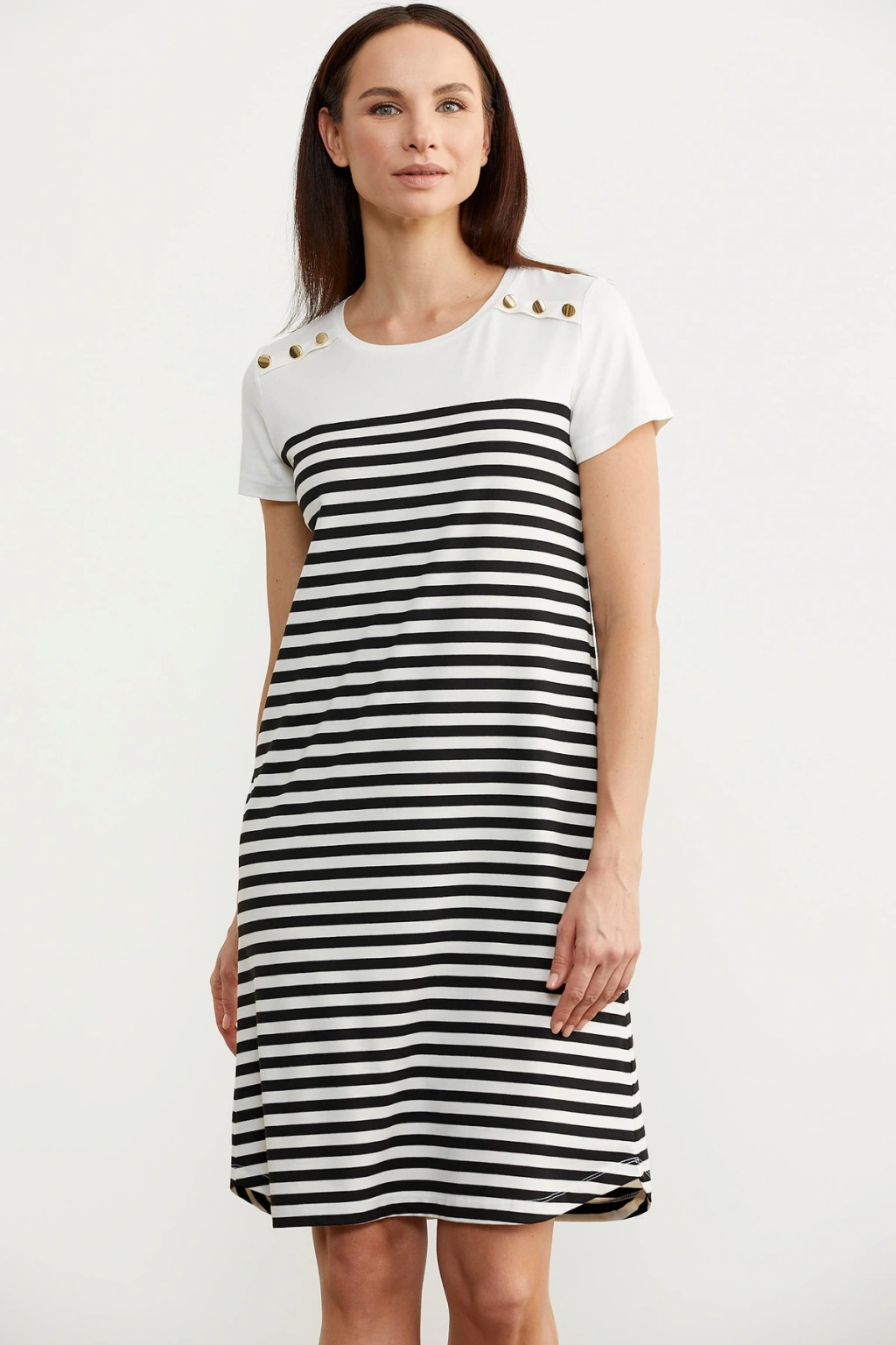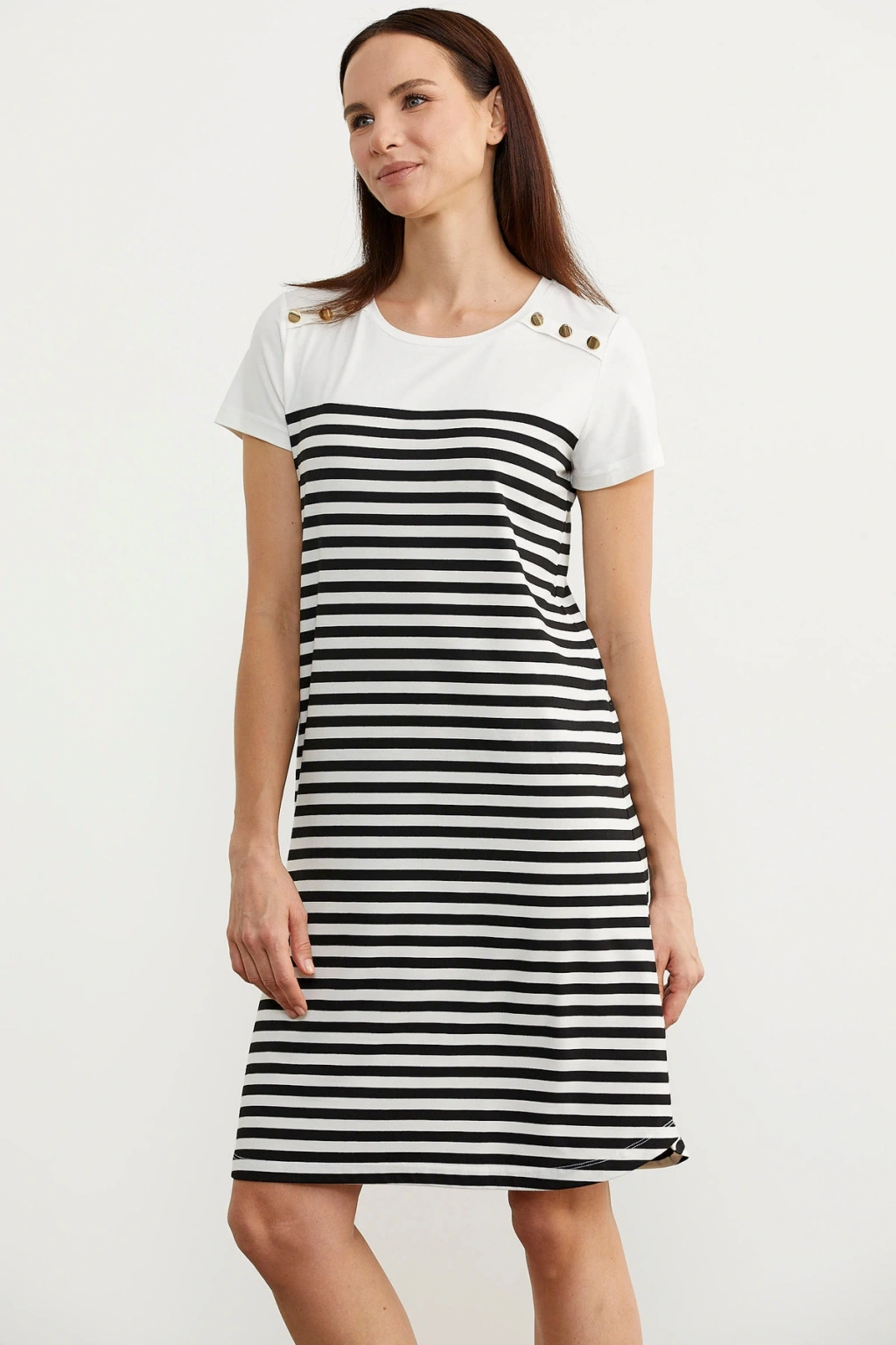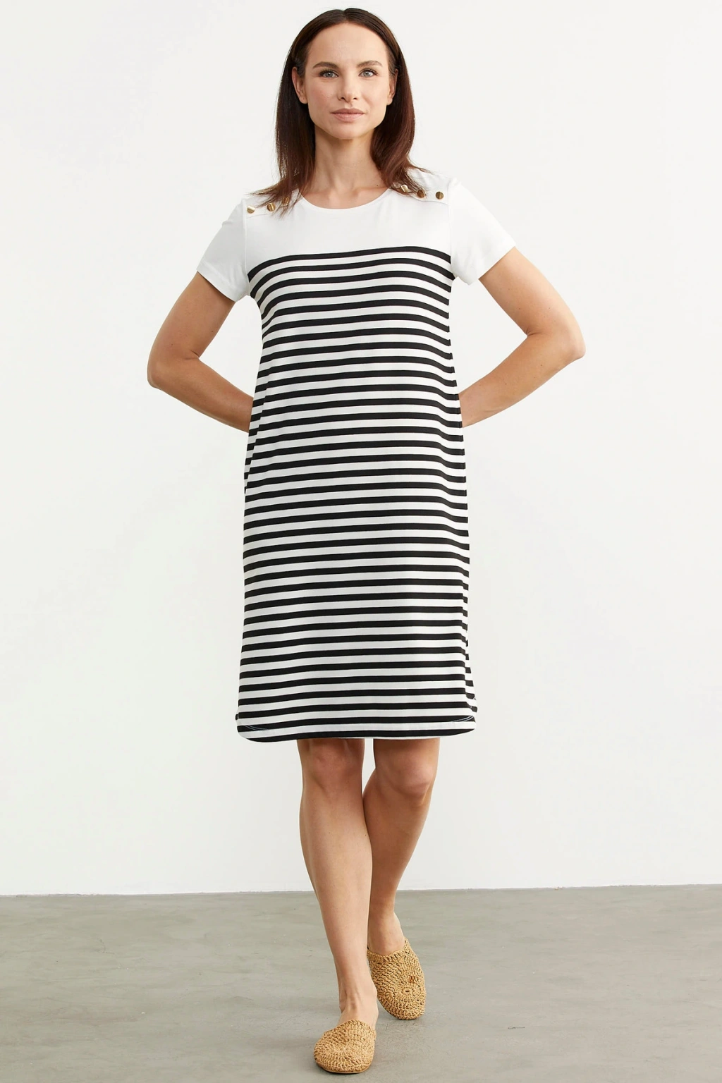 Zarif çizgili deseniyle göz alıcı bir görünüm sunan bu elbise, günlük kullanımda şıklığı yakalamanızı sağlar.; Viskon karışımlı kumaşı sayesinde hafif ve nefes alabilen yapısıyla yaz ayları için idealdir.; Sade ve düz tasarımı, farklı aksesuarlarla kolayca kombinlenebilirliği artırır.; Sıfır yaka detayı ile modern bir görünüm kazanan bu elbisenin kısa kolları hareket özgürlüğünüzü kısıtlamaz.; Kolay bakım imkanı sunan Type 3 yıkama talimatına uygun şekilde temizlenmesi pratikliği arttırır.; Düğme detayları ile hem spor hem de resmi ortamlarda rahatça tercih edilebilir.; Regular boy ve siluetiyle her vücut tipine uyum sağlayan slim kalıbı, konforlu bir kullanım vaat eder.; Dokuma kumaşı dayanıklıdır ve uzun süreli kullanımlara uygundur.;