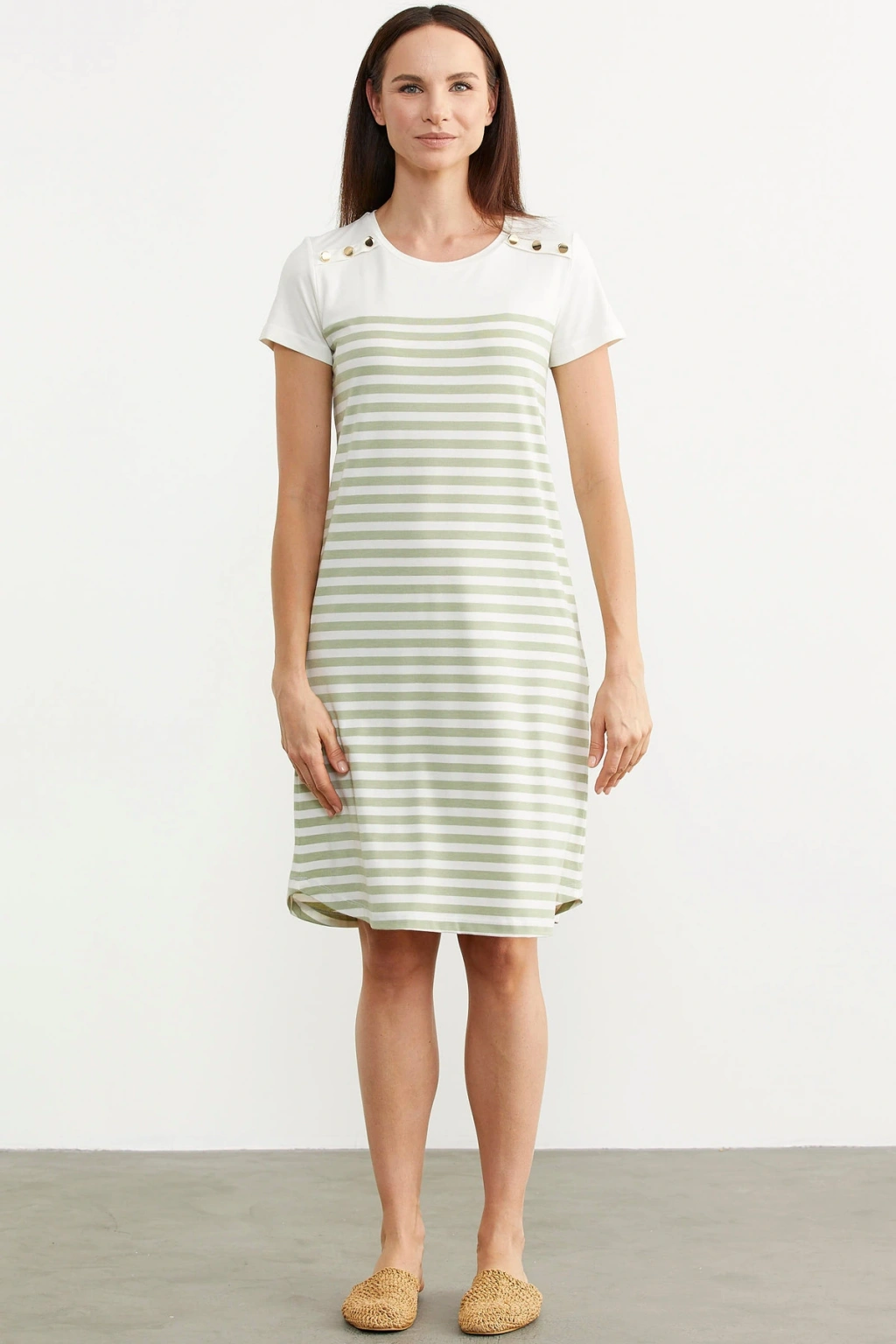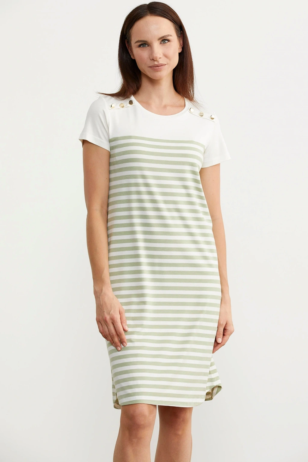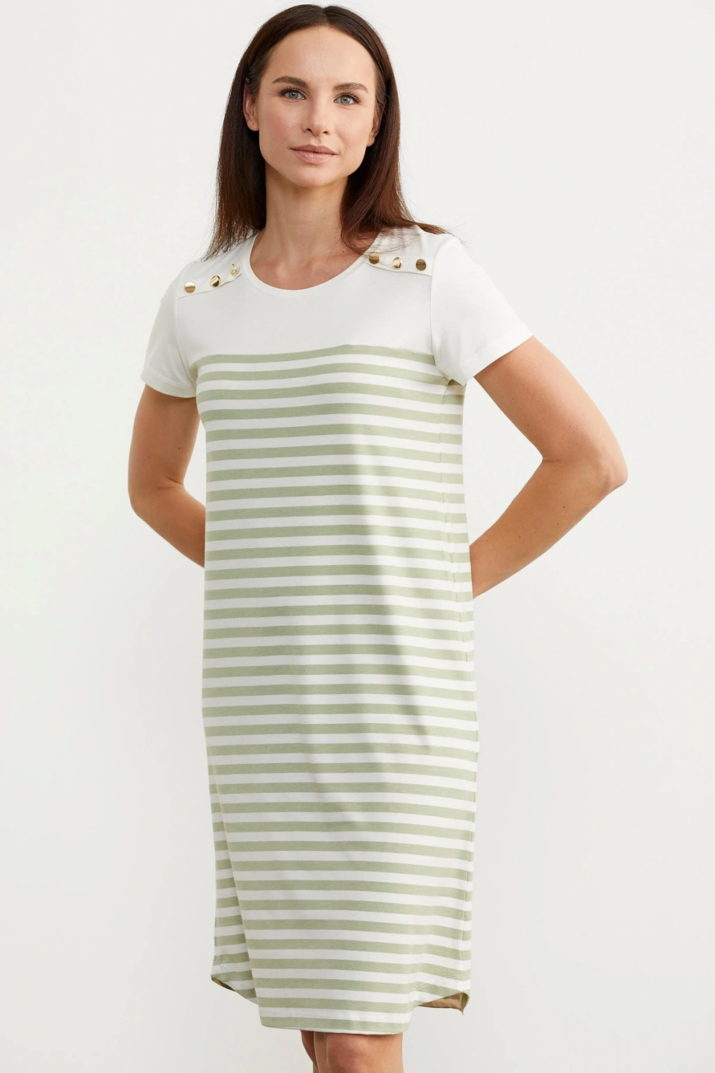 Çizgili diz boy marine elbise omuzlarda kullanılan metal düğme detaylarıyla göz alıcı sade bir görünüme kavuşmuştur; Kumaş İçeriği: %58 Viskoz %37 Polyester %5 Elastan Desen: Çizgili Yaka Tipi: Sıfır Yaka Kol Tipi: Kısa Kol Ürün Boyu: 112 cm Astar: Astarsız Cep: Cepsiz Kalıp Tipi: Standart Kalıp Mankenin Giydiği Beden: M Manken Ölçüleri: Boy: 178 cm Göğüs: 87 cm Bel: 65 cm Basen: 96 cm;