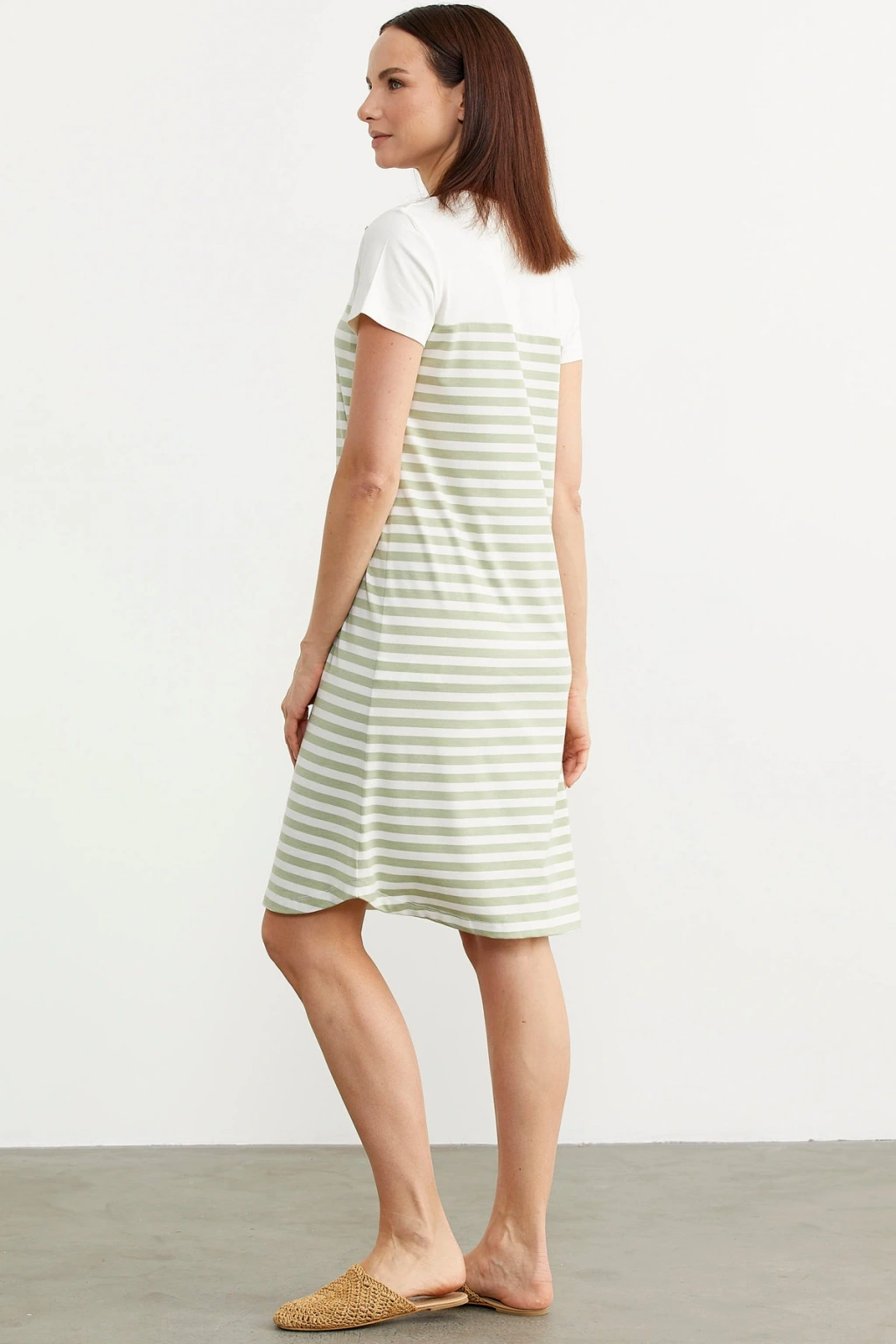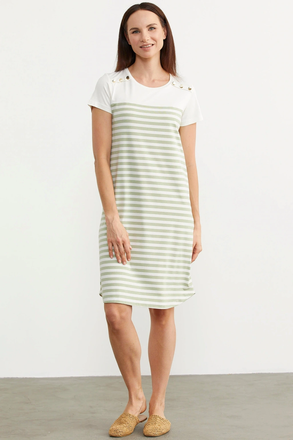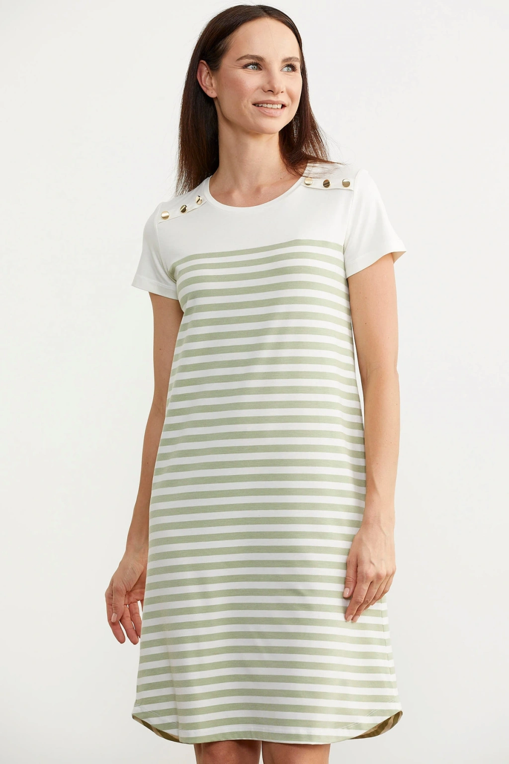 Çizgili diz boy marine elbise omuzlarda kullanılan metal düğme detaylarıyla göz alıcı sade bir görünüme kavuşmuştur; Kumaş İçeriği: %58 Viskoz %37 Polyester %5 Elastan Desen: Çizgili Yaka Tipi: Sıfır Yaka Kol Tipi: Kısa Kol Ürün Boyu: 112 cm Astar: Astarsız Cep: Cepsiz Kalıp Tipi: Standart Kalıp Mankenin Giydiği Beden: M Manken Ölçüleri: Boy: 178 cm Göğüs: 87 cm Bel: 65 cm Basen: 96 cm;