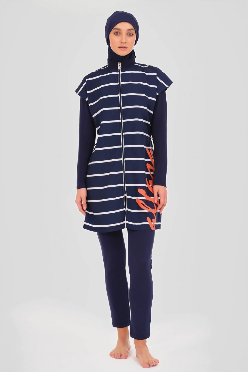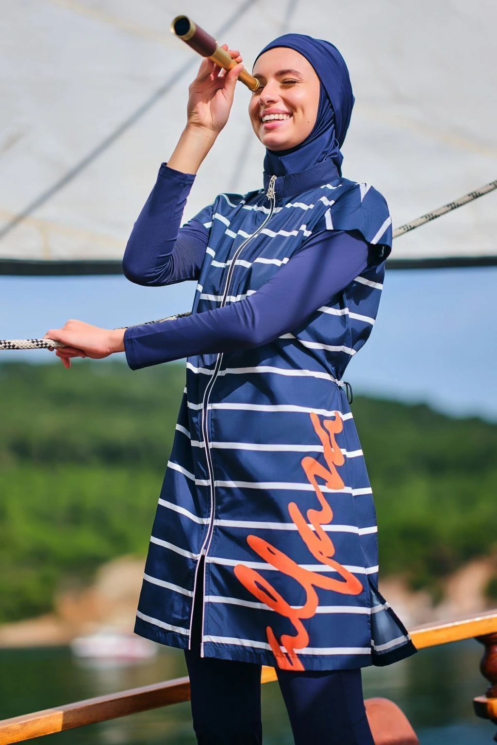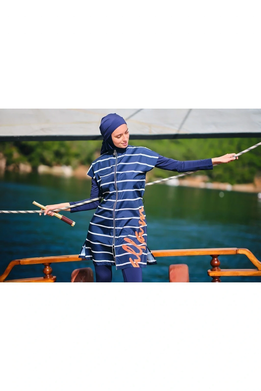 Dümen Çizgili Tesettür Mayo Dümen ve çizgili desenlerin mükemmel uyumuyla tasarlanmış bu tesettür mayo, denizcilik esintilerini stilinize taşır. Kaliteli kumaşı ve rahat kesimi ile suyun keyfini çıkarırken, şıklık ve konforu bir arada sunar. Yaz gardırobunuzun vazgeçilmez bir parçası olacak. Tanım Su itici apreli. Üst desenli paraşüt kumaş. Üst desenli. Önü fermuar kapamalı. Dümen elcik süslemeli. Dik yaka. Likra tayt. Likra eşarp ve üçgen bone. Yeni nesil crop; Likra uzun kollu. İçi kaplı crop tasarım. Paket İçeriği Üst, Tayt, Eşarp, Üçgen bone, Uzun kollu crop olmak üzere 5 parçadan oluşmaktadır. Hızlı kuruma, kolay yüzme olanağı sağlar. Kumaş İçeriği Ana Kumaş : %100 Poliester, Su itici paraşüt kumaş . Yardımcı Kumaş : %95 Poliester, %5 Elastan, Su itici apre uygulanmıştır.