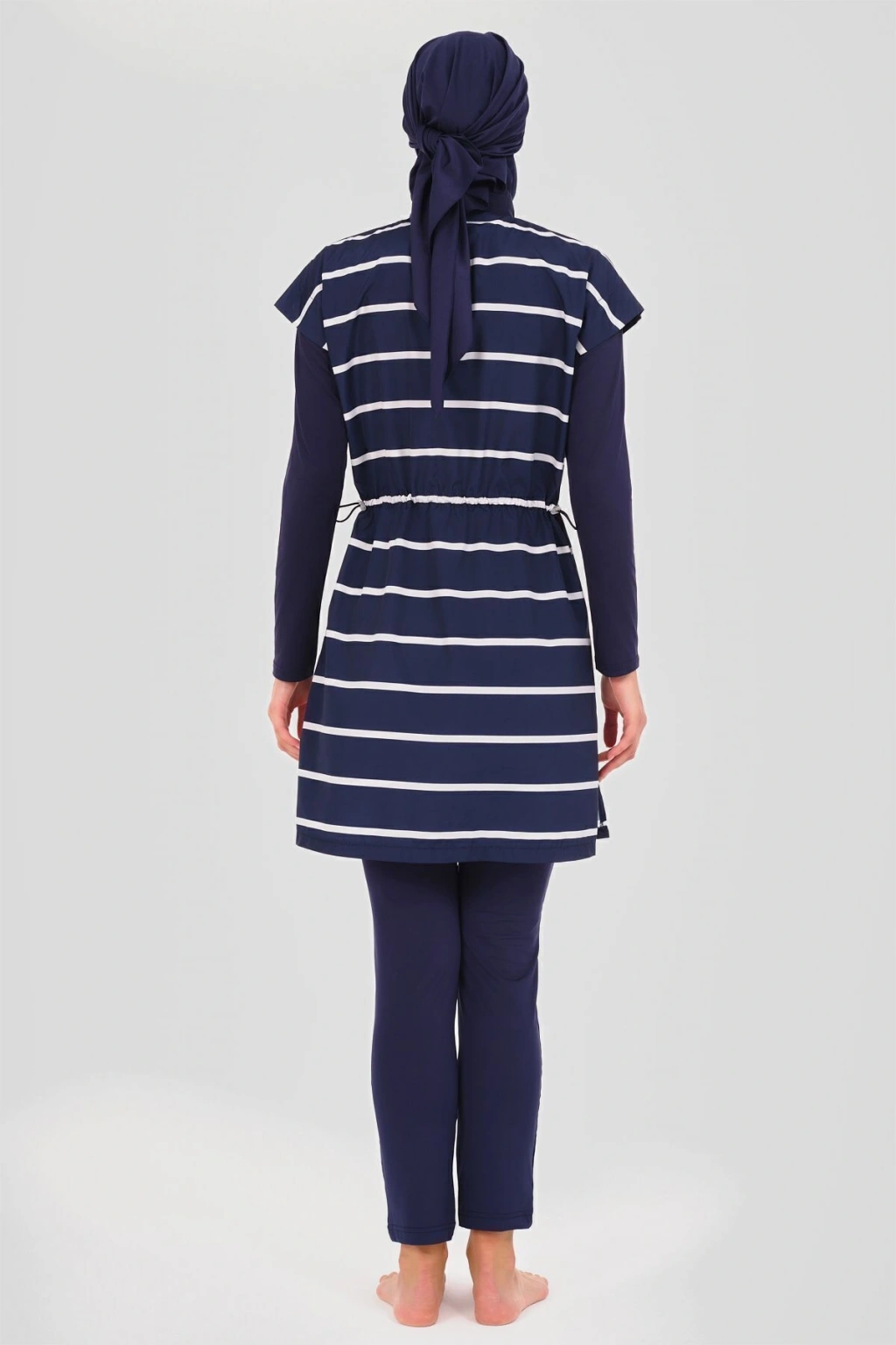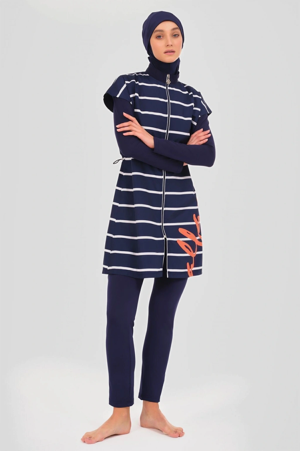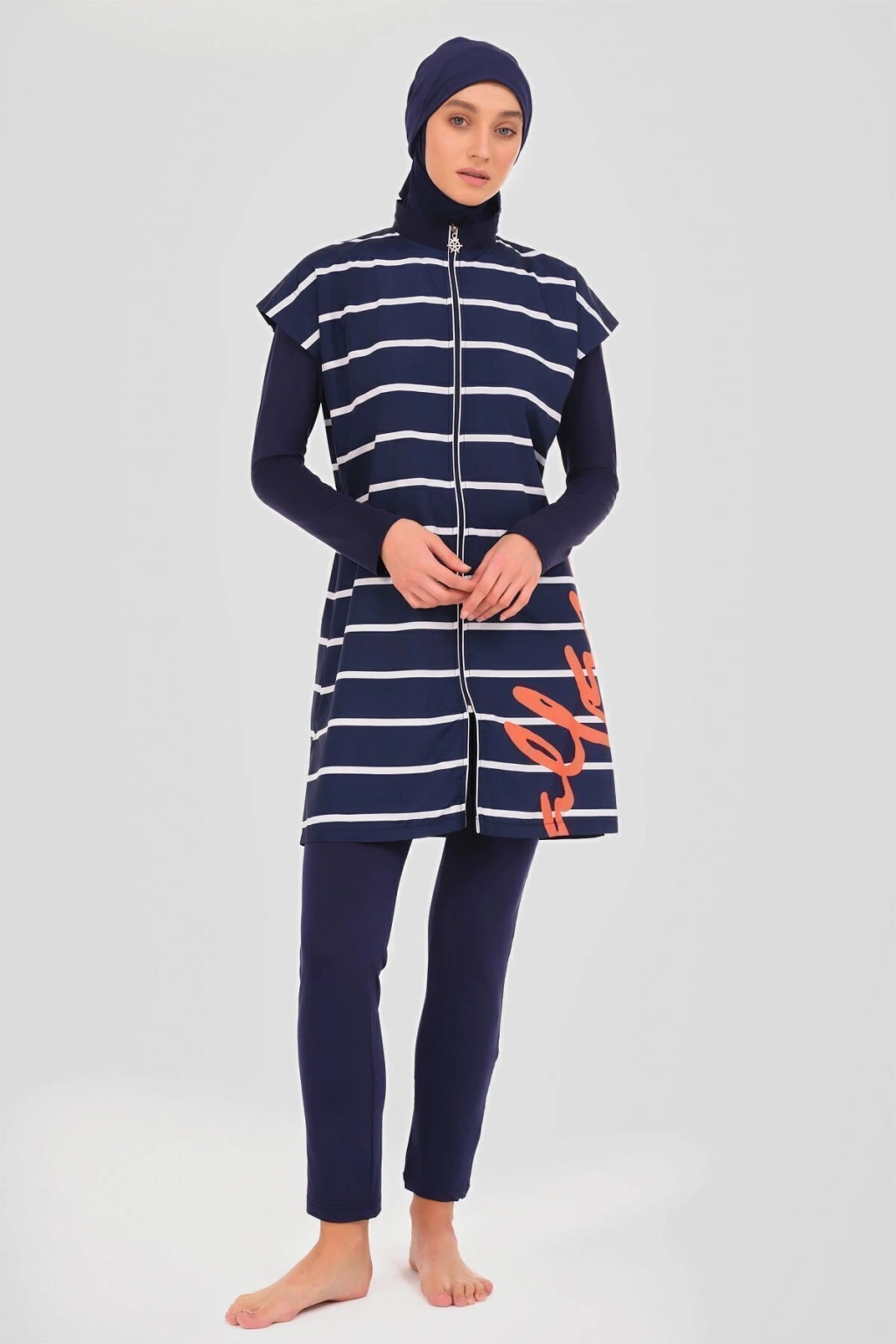 Dümen Çizgili Tesettür Mayo Dümen ve çizgili desenlerin mükemmel uyumuyla tasarlanmış bu tesettür mayo, denizcilik esintilerini stilinize taşır. Kaliteli kumaşı ve rahat kesimi ile suyun keyfini çıkarırken, şıklık ve konforu bir arada sunar. Yaz gardırobunuzun vazgeçilmez bir parçası olacak. Tanım Su itici apreli. Üst desenli paraşüt kumaş. Üst desenli. Önü fermuar kapamalı. Dümen elcik süslemeli. Dik yaka. Likra tayt. Likra eşarp ve üçgen bone. Yeni nesil crop; Likra uzun kollu. İçi kaplı crop tasarım. Paket İçeriği Üst, Tayt, Eşarp, Üçgen bone, Uzun kollu crop olmak üzere 5 parçadan oluşmaktadır. Hızlı kuruma, kolay yüzme olanağı sağlar. Kumaş İçeriği Ana Kumaş : %100 Poliester, Su itici paraşüt kumaş . Yardımcı Kumaş : %95 Poliester, %5 Elastan, Su itici apre uygulanmıştır.