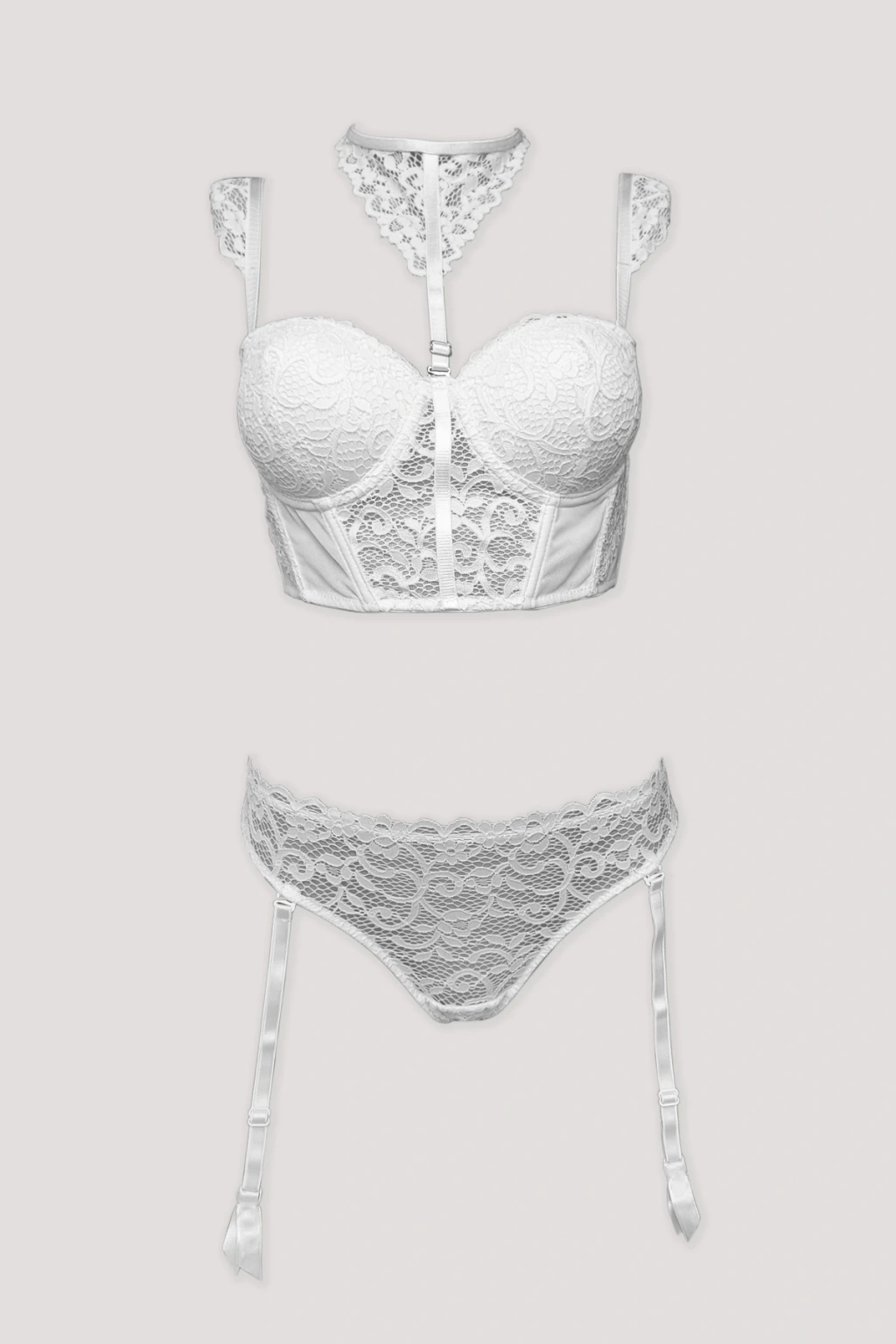 Ekru 4862 Cenova 3'lü Jartiyerli Büstiyer Sütyen Tanga / Fantezi İç Çamaşır Takımı Çorap Hediyeli