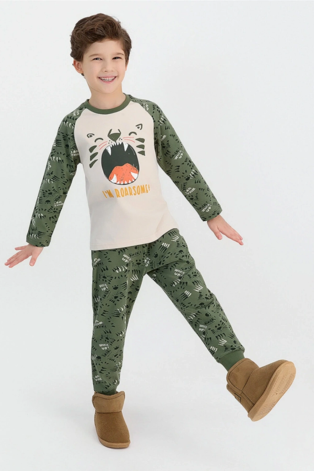 RolyPoly I'm Roarsome Lacivert Erkek Çocuk Pijama Takımı incelikli detayların bir arada olduğu bir ürün olarak ön plana çıkmaktadır. ; Erkek çocuklarının gündelik hayatlarını konforlu bir şekilde geçirmesini sağlayan pijama takımı, üst ve alt parça olmak üzere iki uyumlu parçadan meydana gelmektedir. ; Üst parça, lacivert zemine sahiptir ve zemin üzerinde oldukça sevimli bir hayvan figürü yer alır. ; Figür altında “I’m Roarsome” yazısı bulunmakta ve bu şekilde pijama takımına bir hareket katılmaktadır. ; Kol kısımları, gri zemin üzerinde minimalize edilmiş desenlere sahiptir. ; Alt parça ise yine aynı renk zemin üzerindeki desenlerle sevimli bir görünüm elde etmektedir. ; RolyPoly I'm Roarsome Lacivert Erkek Çocuk Pijama Takımı çocuklarınıza özel olarak %100 pamuktan tasarlanan işlevsel bir üründür. ; Stok Kodu :RP2534-C-V1 Marka :Rolypoly Renk :21k Lacivert Kumaş İçerik :Üst Kumaş : %100 Pamuk, Alt Kumaş : %100 Pamuk Kumaş Tipi :Üst Kumaş : Süprem, Alt Kumaş : Süprem;