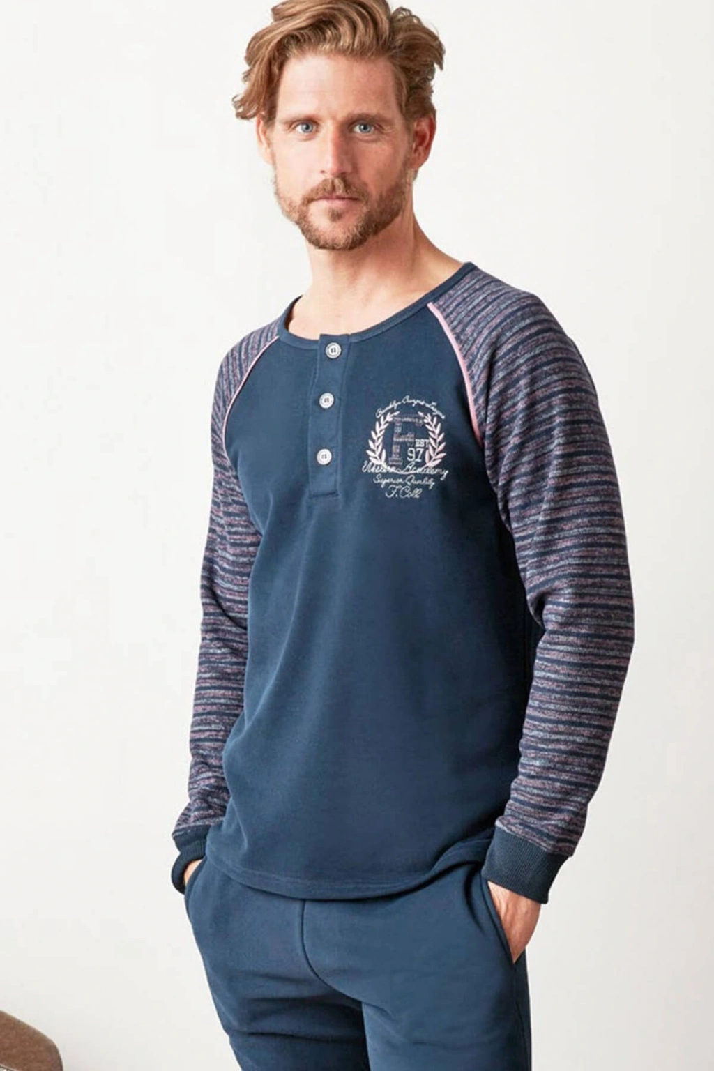 6093 Erkek Uzun Kollu Bisiklet Yaka Pijama Takımı-Lacivert