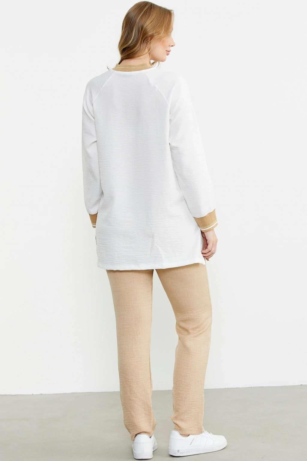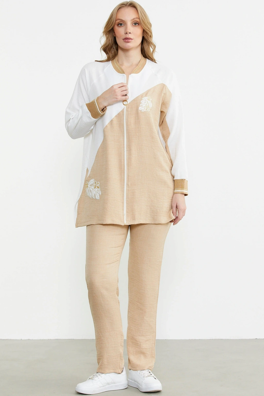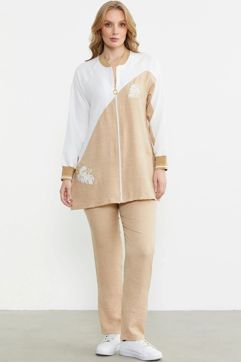 Fermuar Kapamalı Nakışlı Tunik Takım - Bej