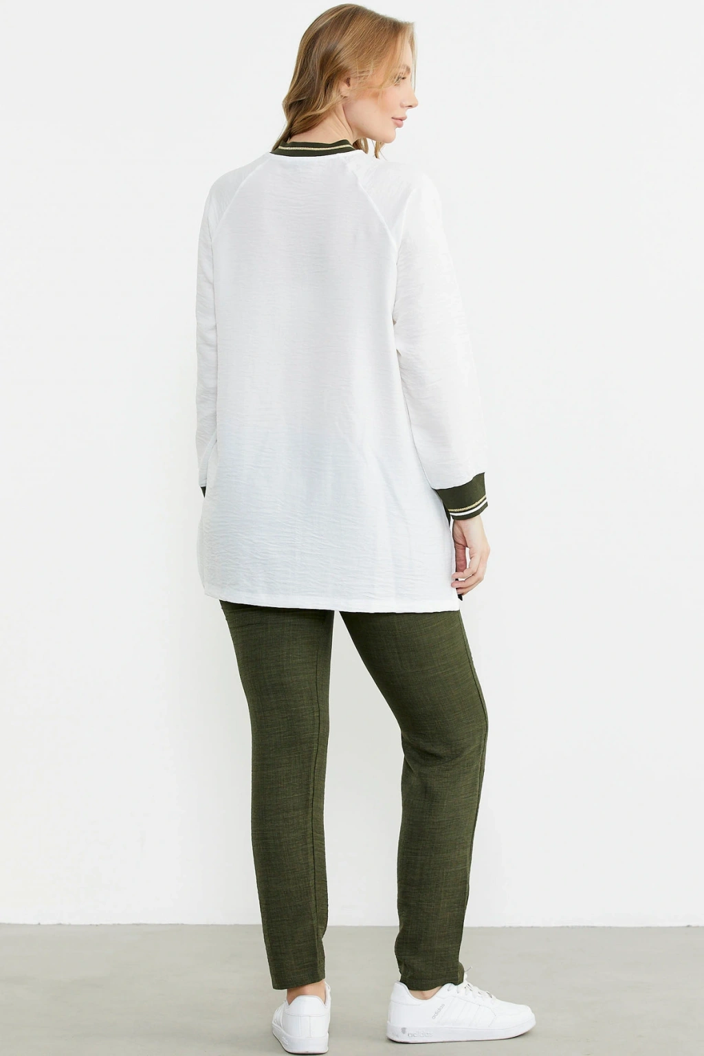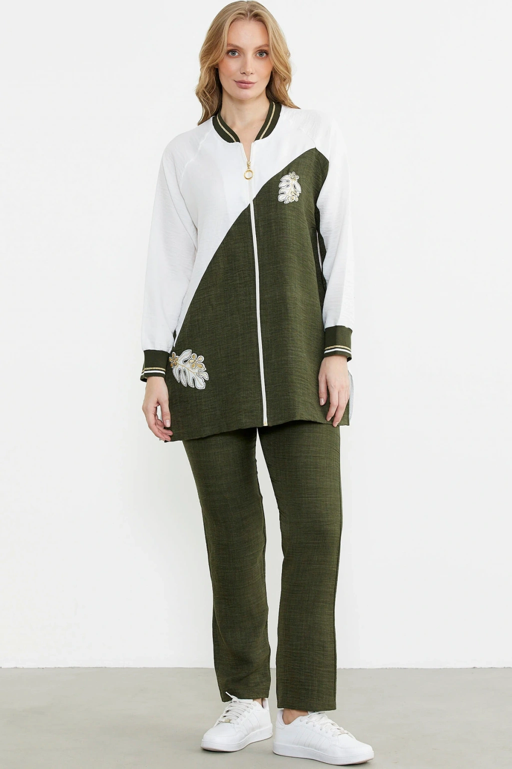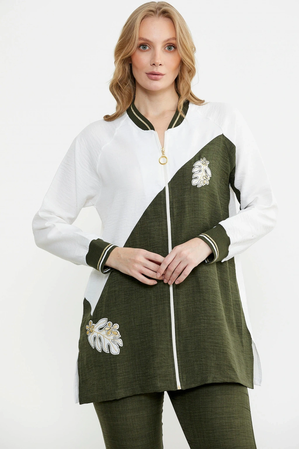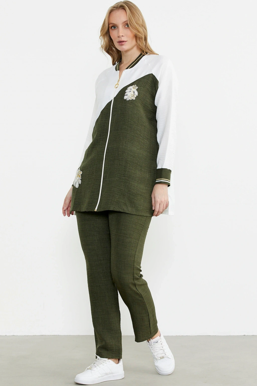 Fermuar Kapamalı Nakışlı Tunik Takım - Haki