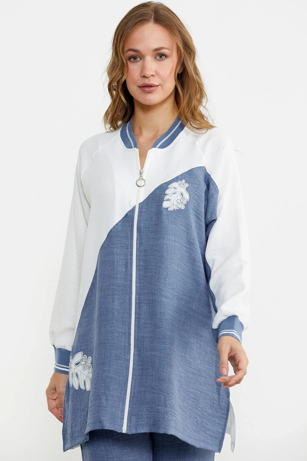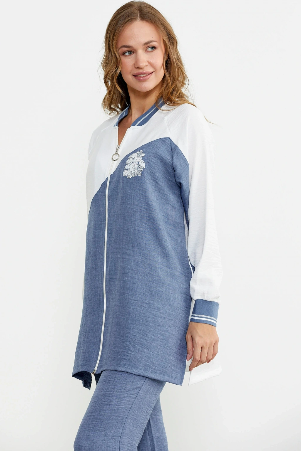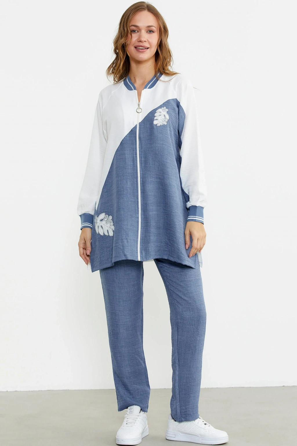 Fermuar Kapamalı Nakışlı Tunik Takım - Indigo