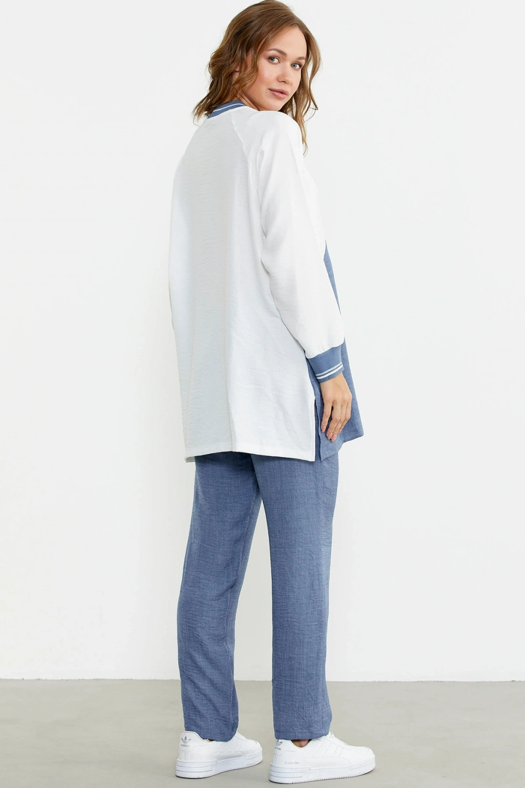 Bol kalıp keten görünümlü takıma sim detaylar eşlik etmektedir. Fermuar kapamalı ve kontrast renklidir.