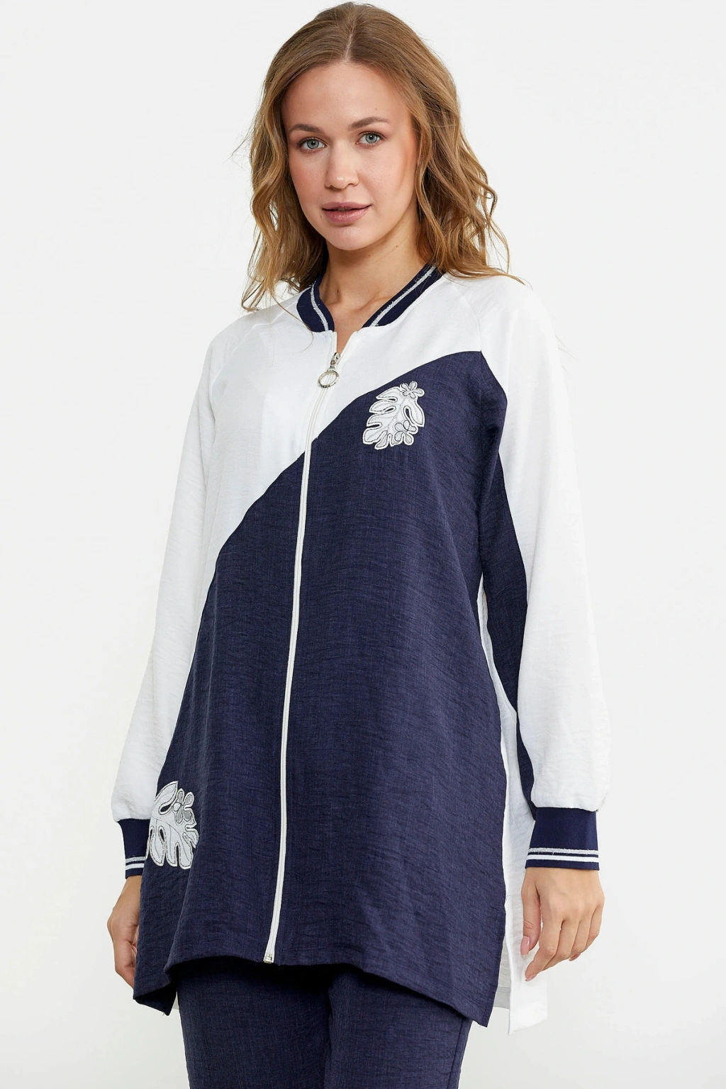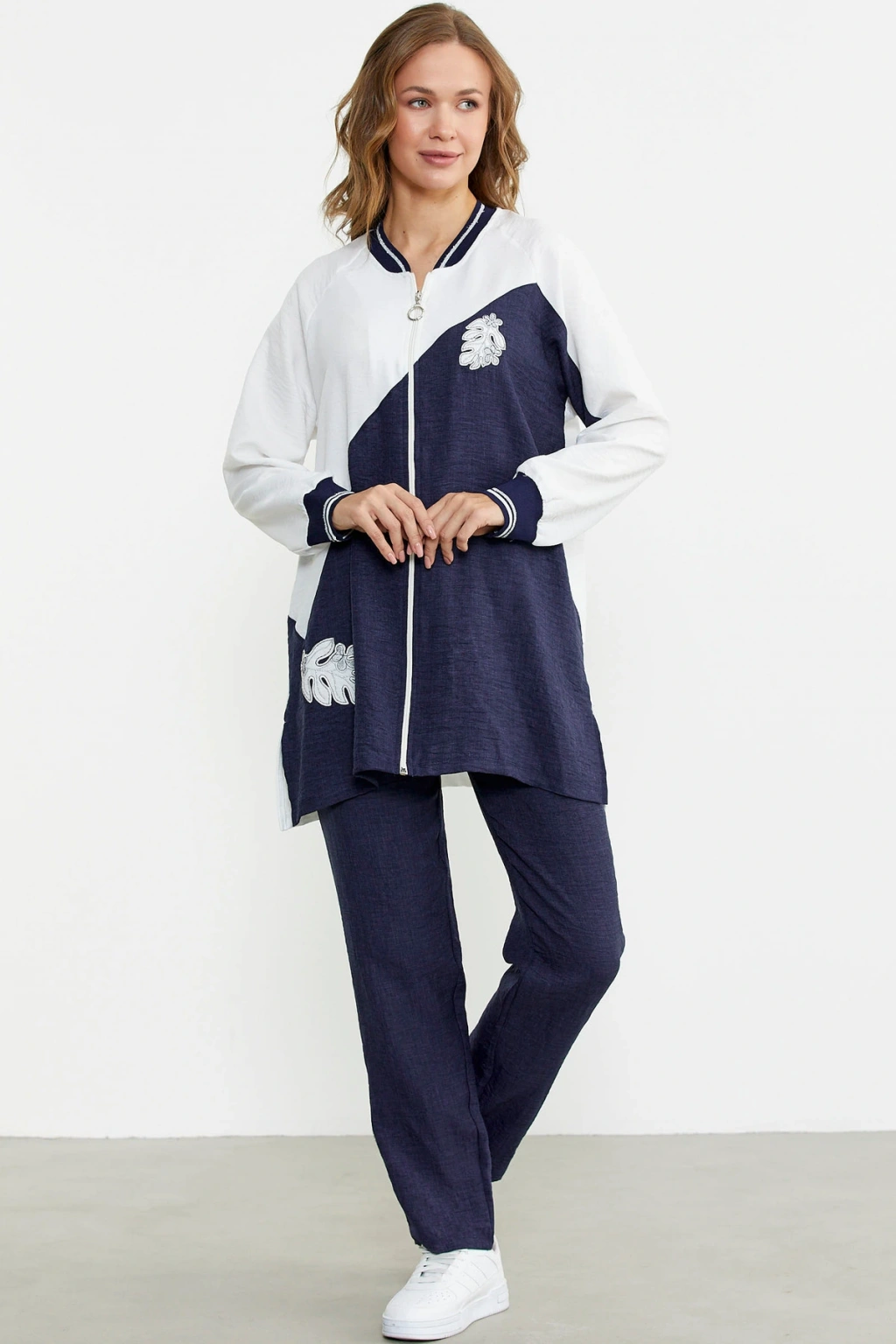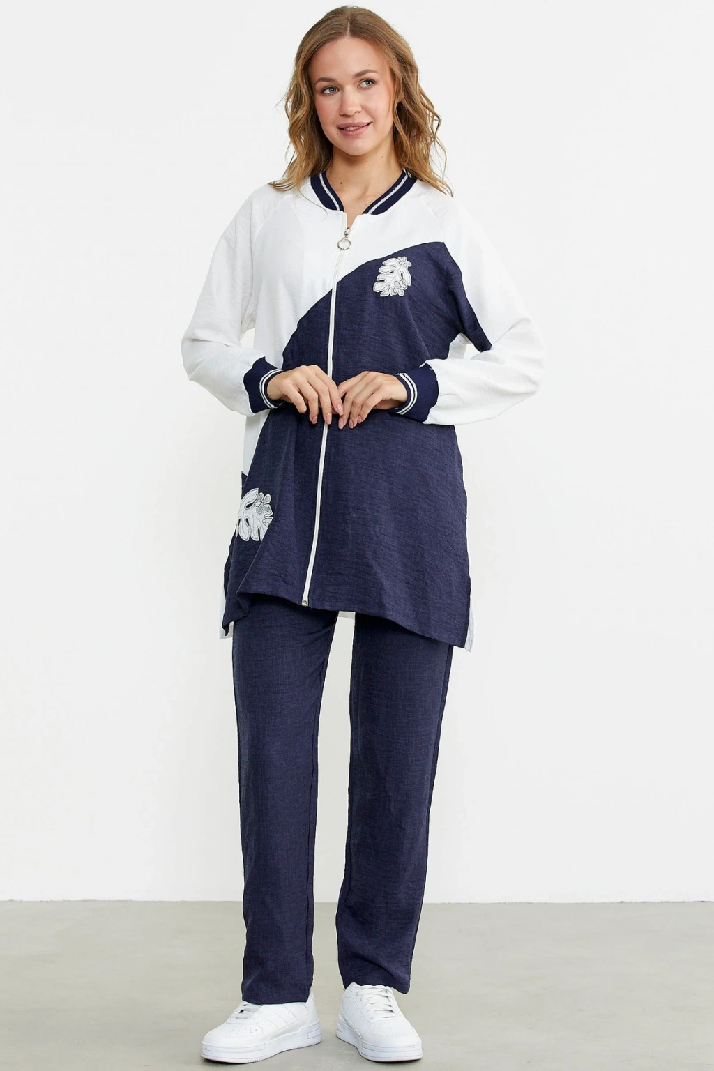 Fermuar Kapamalı Nakışlı Tunik Takım - Lacivert