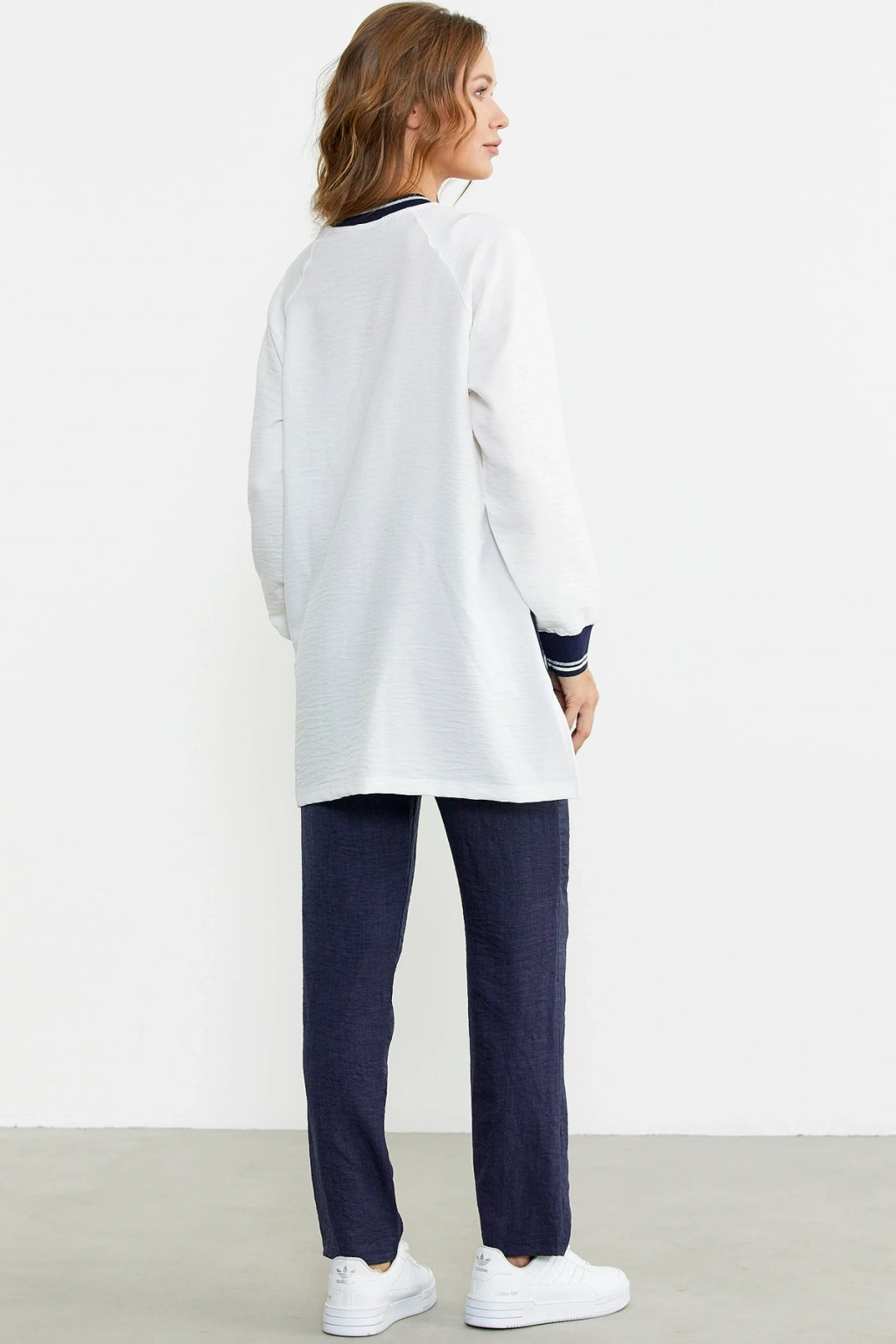 Bol kalıp keten görünümlü takıma sim detaylar eşlik etmektedir. Fermuar kapamalı ve kontrast renklidir.
