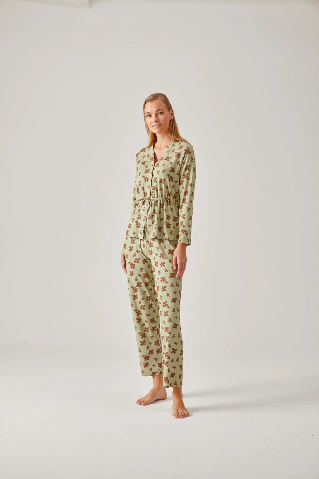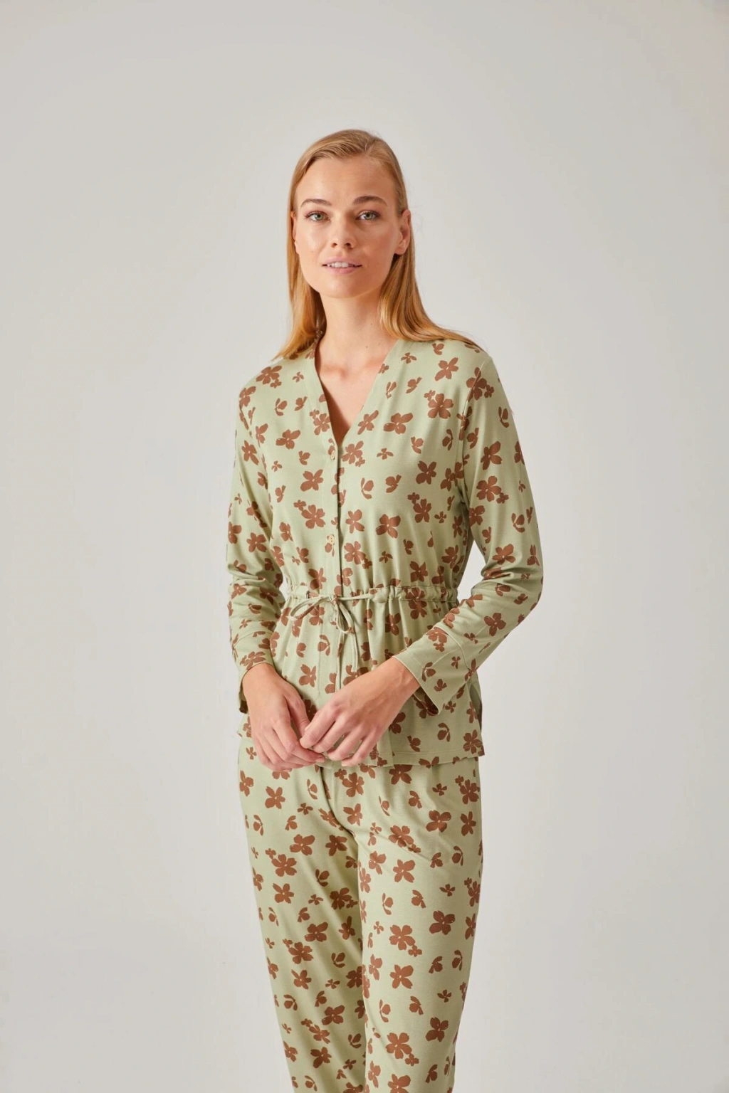 İki parçadan oluşan bu pijama takımı, rahatlığı ve şıklığı bir arada sunar.; Uzun kollu tasarımı ile mevsim geçişlerinde ideal sıcaklık sağlar.; Homewear koleksiyonunun bir parçası olan bu takım, evde konforunuzdan ödün vermeden şık görünmenizi sağlar.; Regular kalıbı ile vücut hatlarınıza uyum sağlayarak rahat bir kullanım sunar.; Örme kumaşı sayesinde esneklik ve dayanıklılık özellikleri ön plana çıkar.; Desenli yapısıyla göz alıcı bir stil oluştururken, fıstık yeşili rengiyle canlılık katmayı ihmal etmez.; %95 viskoz ve %5 elastan içeriği, esneklik ve nefes alabilirlik açısından mükemmel bir denge sunar.; Tüm yaş gruplarına hitap eden tasarımıyla geniş bir kullanıcı kitlesine uygunluk gösterir.;