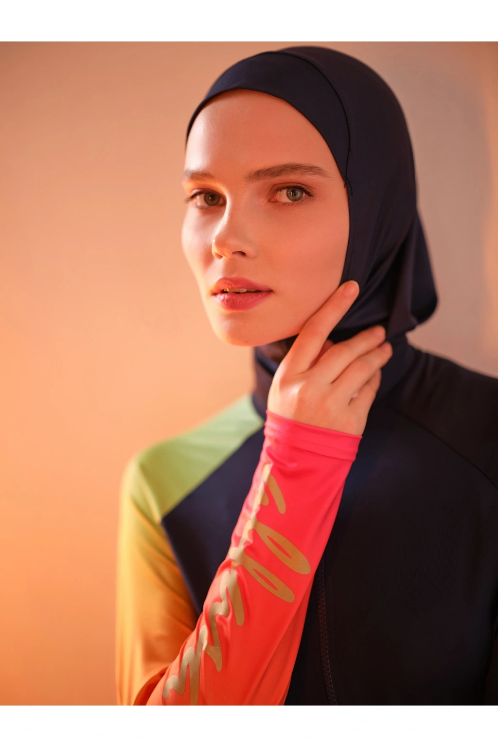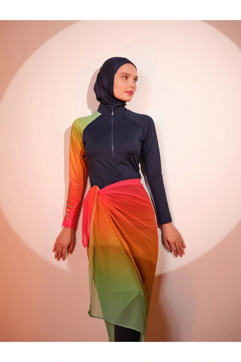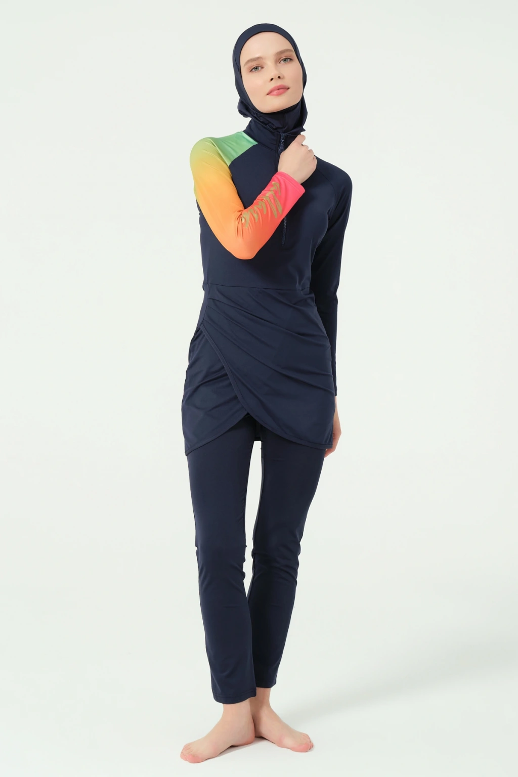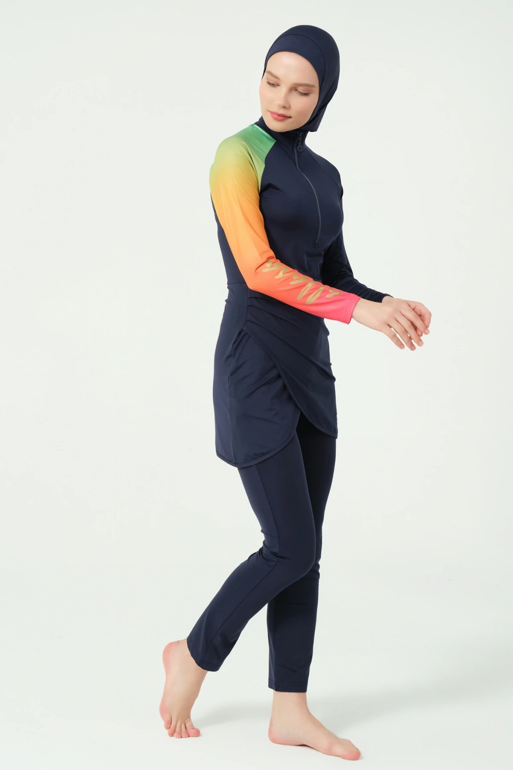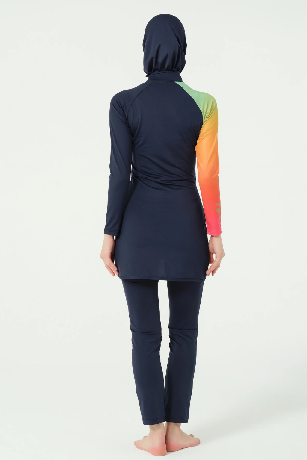 TR: Üst, Tayt, Eşarp, Bone, Tek parça iç çamaşırı olmak üzere 5 parçadan oluşmaktadır. Hızlı kuruma, kolay yüzme olanağı sağlar.
