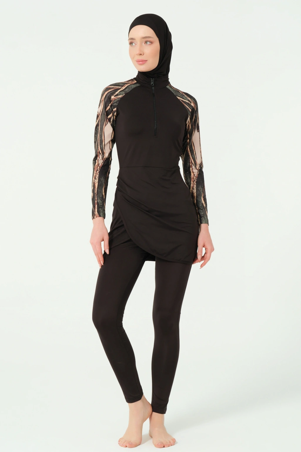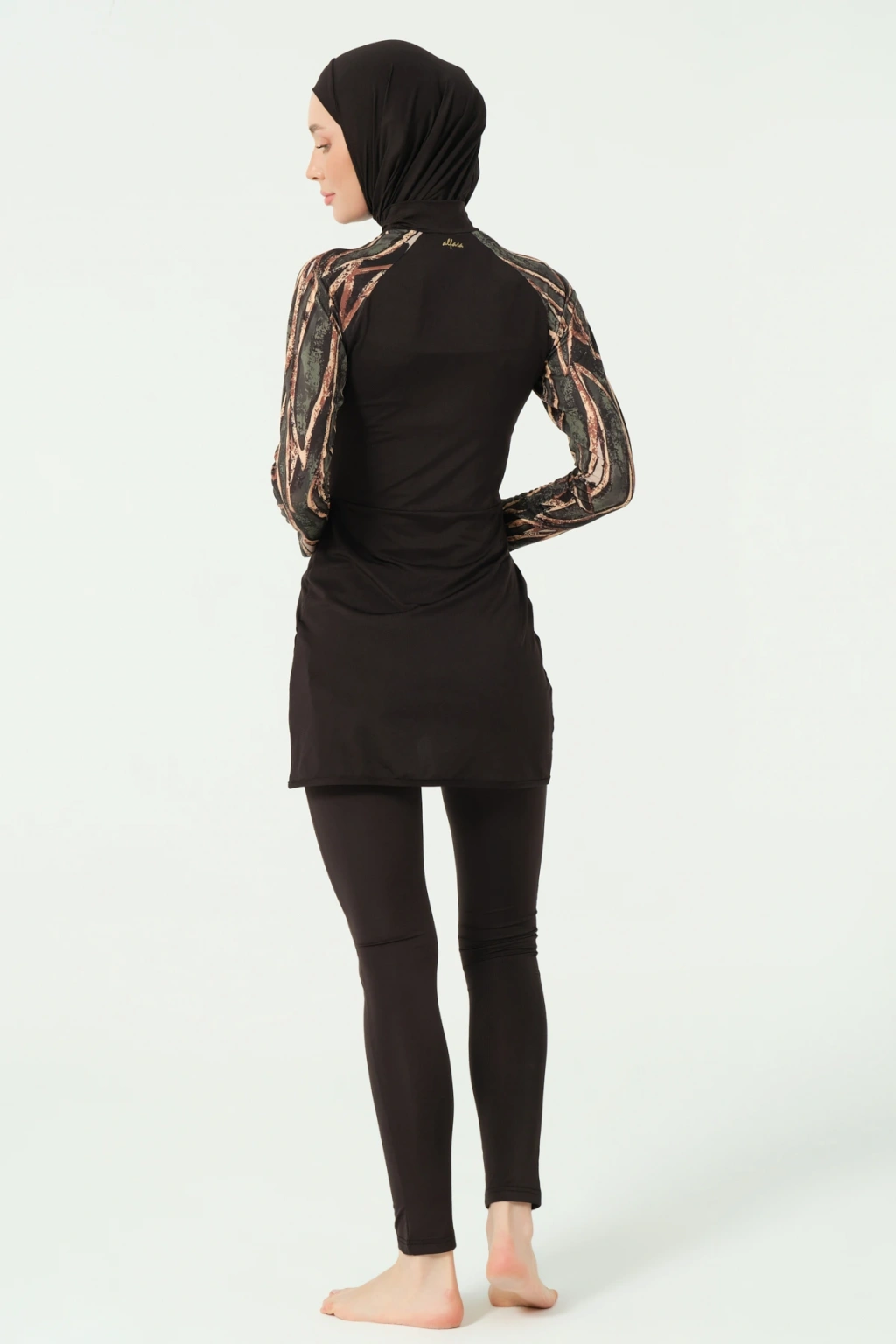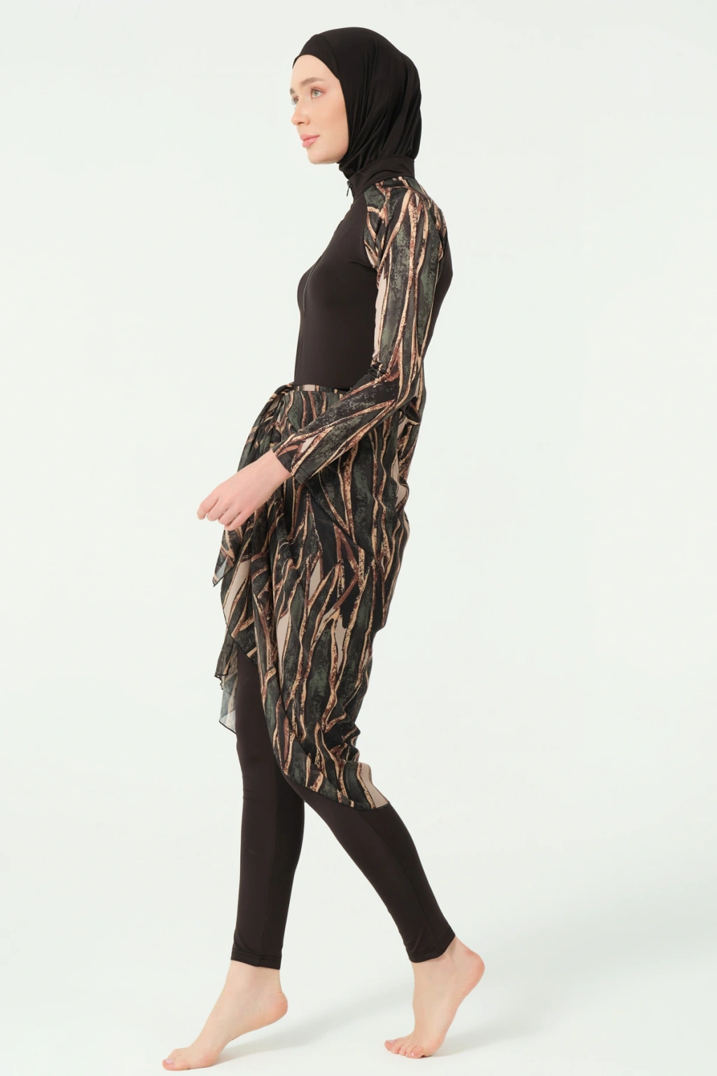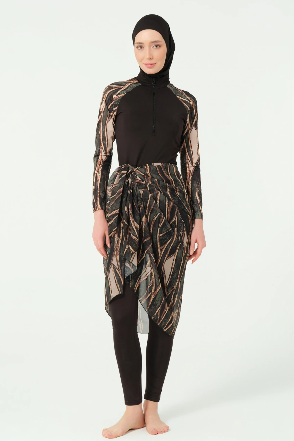 Üst, Tayt, Eşarp, Bone, Pareo, Tek parça iç çamaşırı olmak üzere 6 parçadan oluşmaktadır.; Hızlı kuruma, kolay yüzme olanağı sağlar.; Su itici: Suyu iten apreli likra kumaş.; Üst reglan uzun kollu.; Dik yaka.; Şifon etek pareo.; Tayt.; Eşarp ve bone.; Tek parça iç çamaşır.