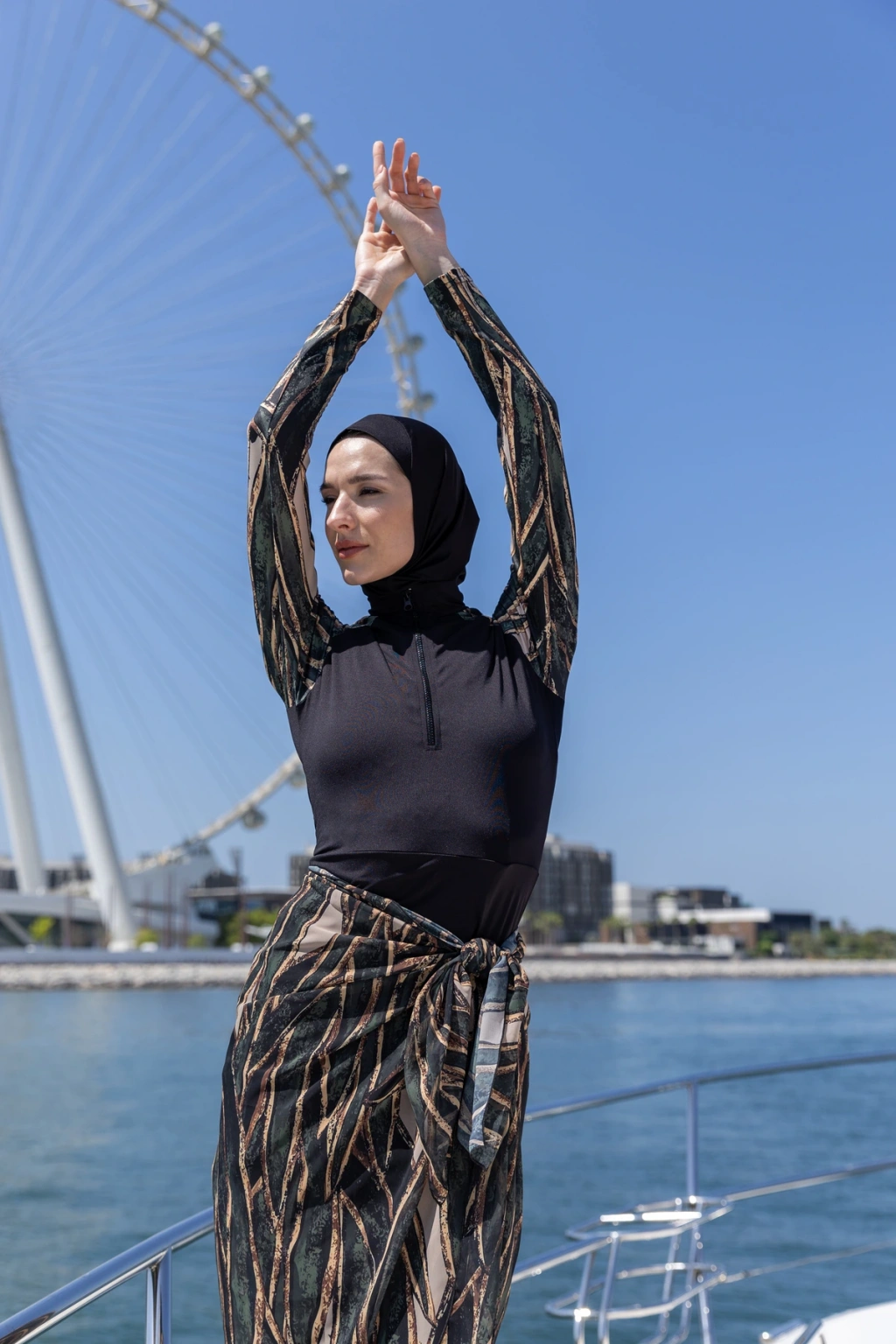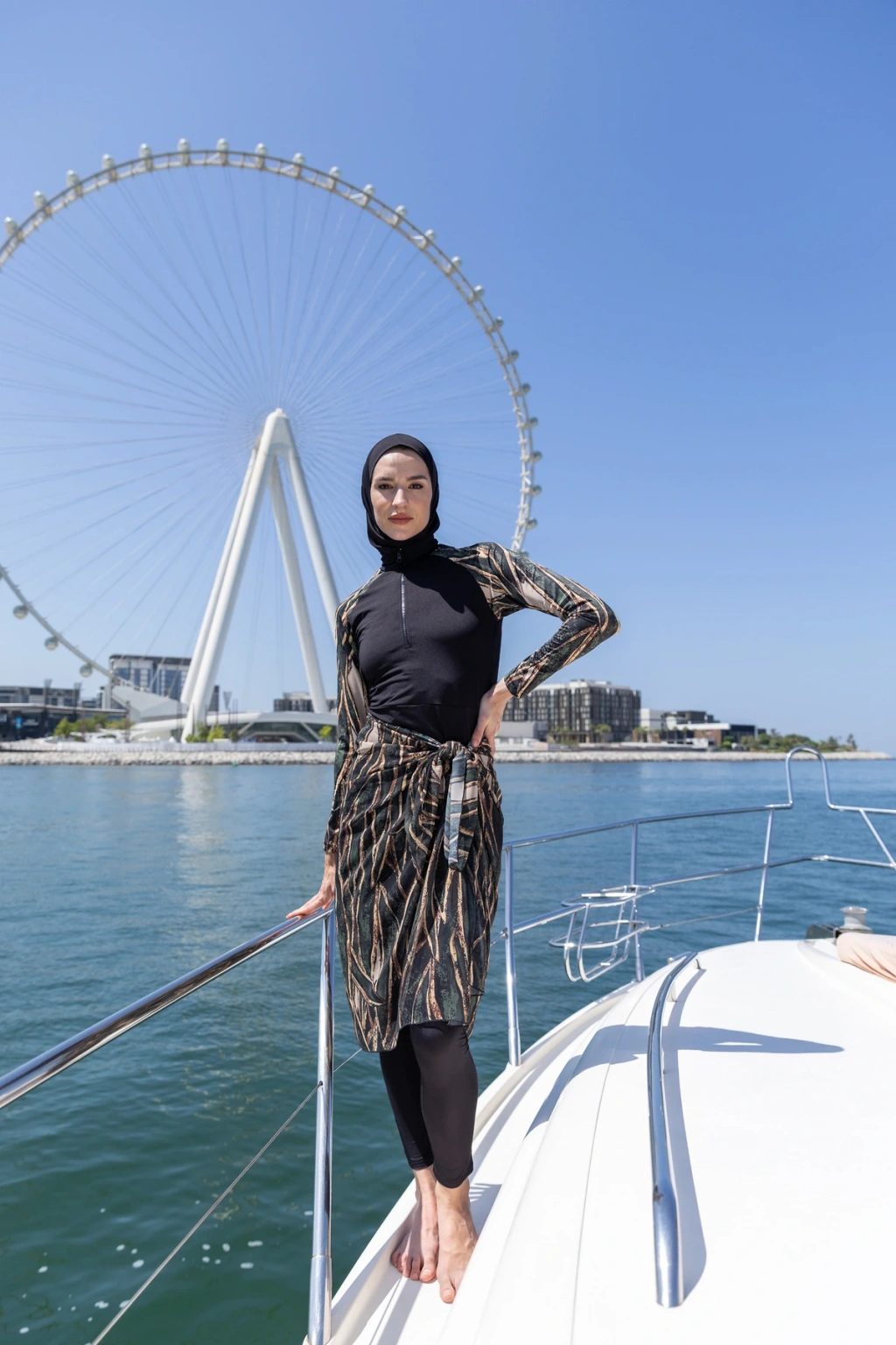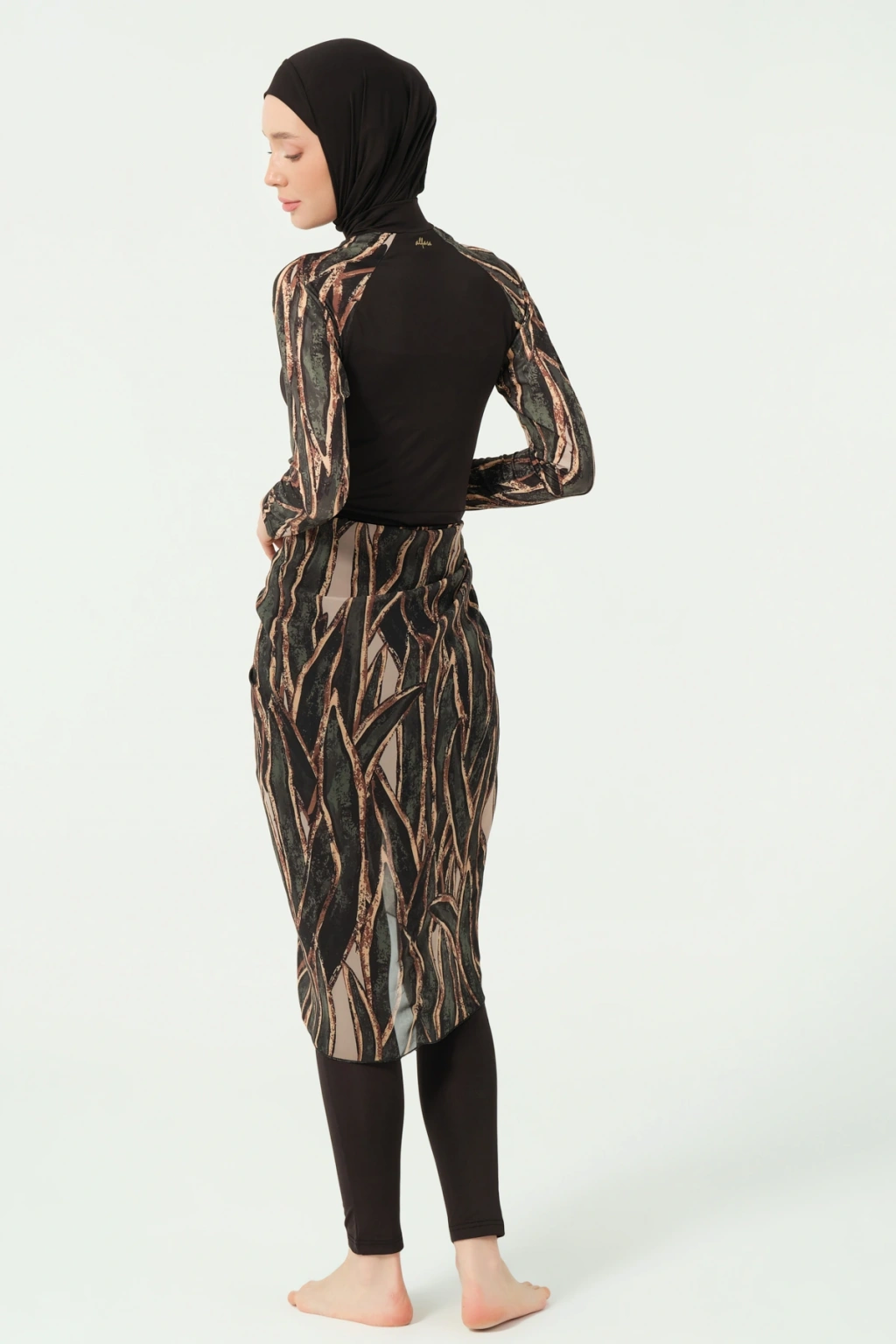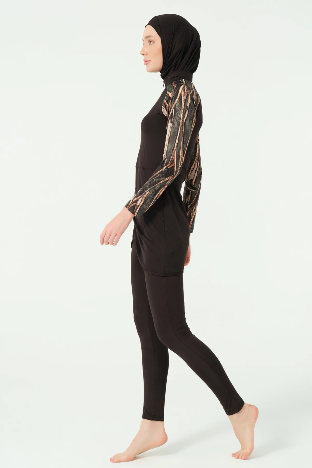 Üst, Tayt, Eşarp, Bone, Pareo, Tek parça iç çamaşırı olmak üzere 6 parçadan oluşmaktadır.; Hızlı kuruma, kolay yüzme olanağı sağlar.; Su itici: Suyu iten apreli likra kumaş.; Üst reglan uzun kollu.; Dik yaka.; Şifon etek pareo.; Tayt.; Eşarp ve bone.; Tek parça iç çamaşır.