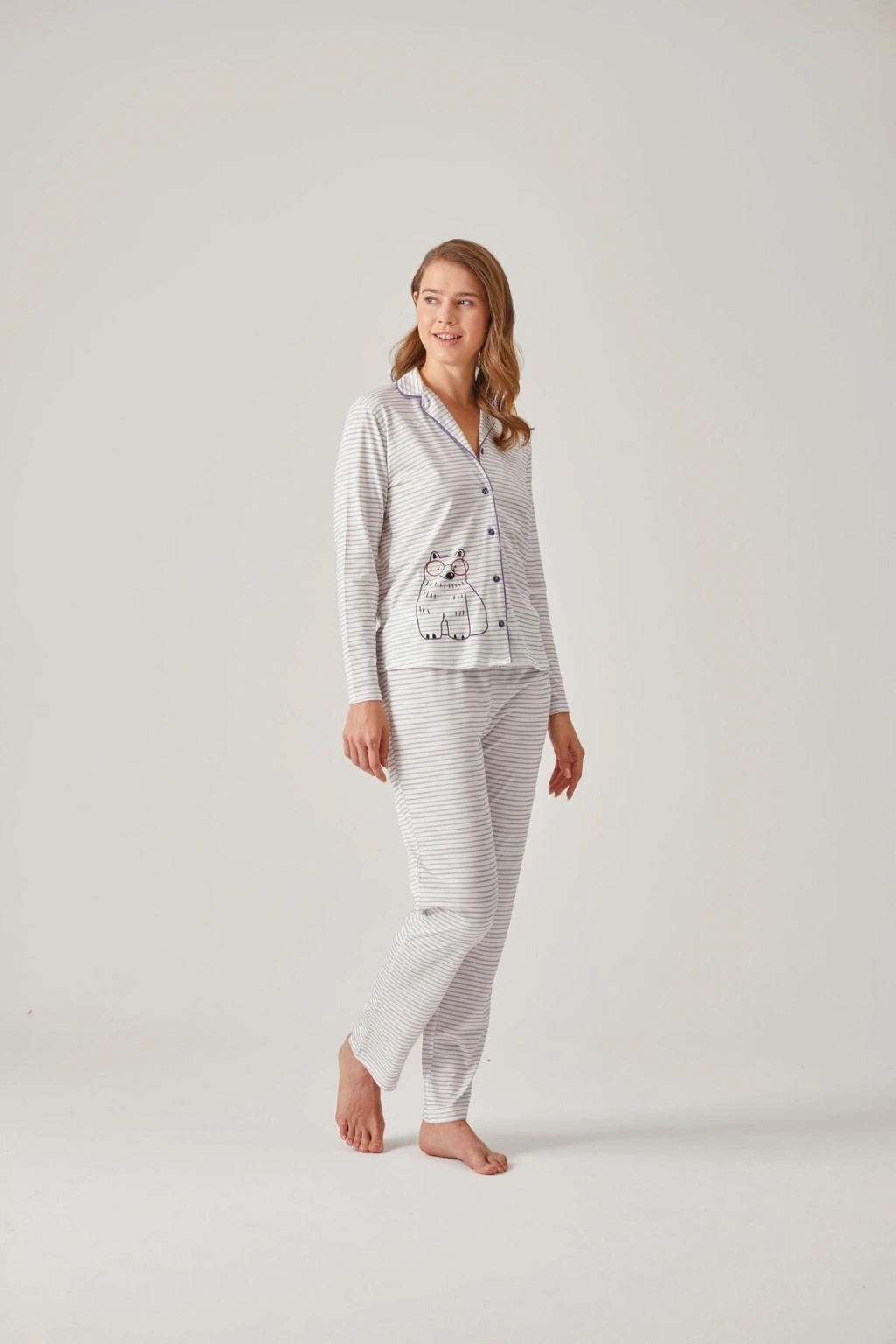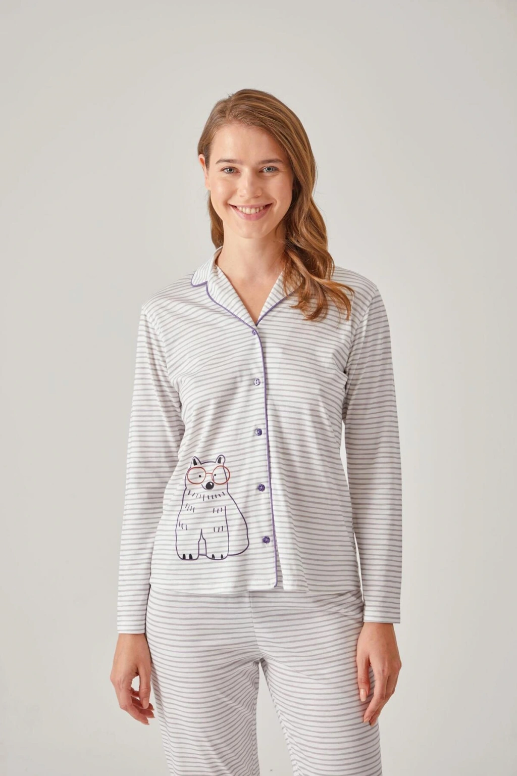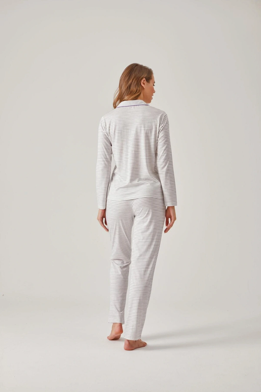Rahat ve şık bir uyku deneyimi için tasarlanmış, gri çizgili desenli modal pamuklu pijama takımı; %50 pamuk ve %50 modal karışımı kumaşı ile yumuşak dokunuşu ve nefes alabilir yapısı sayesinde konforlu bir kullanım sunar; Her yaş grubuna hitap eden geniş beden skalası ile herkes için ideal bir seçimdir; Homewear koleksiyonunun bir parçası olarak evde geçirilen zamanları daha keyifli hale getirir; Uzun kollu tasarımı ile mevsim geçişlerinde ve serin havalarda ekstra sıcaklık sağlar; İki parçadan oluşan set, hem üst hem de alt parça olarak tam bir uyum ve şıklık sunar; Örme kumaş tipi, esneklik ve dayanıklılık sağlayarak uzun süreli kullanım imkanı tanır;