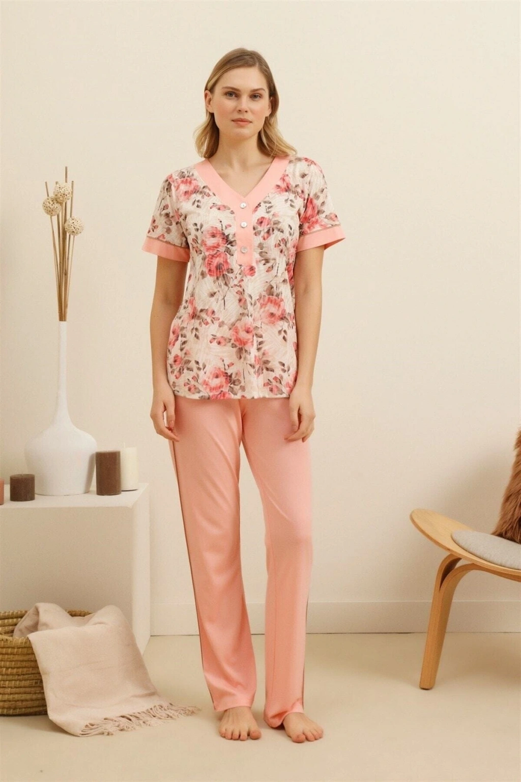 25109 Kadın V Yaka Kısa Kollu Bol Paçalı Pijama Takım