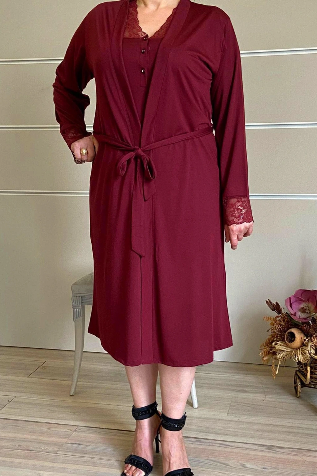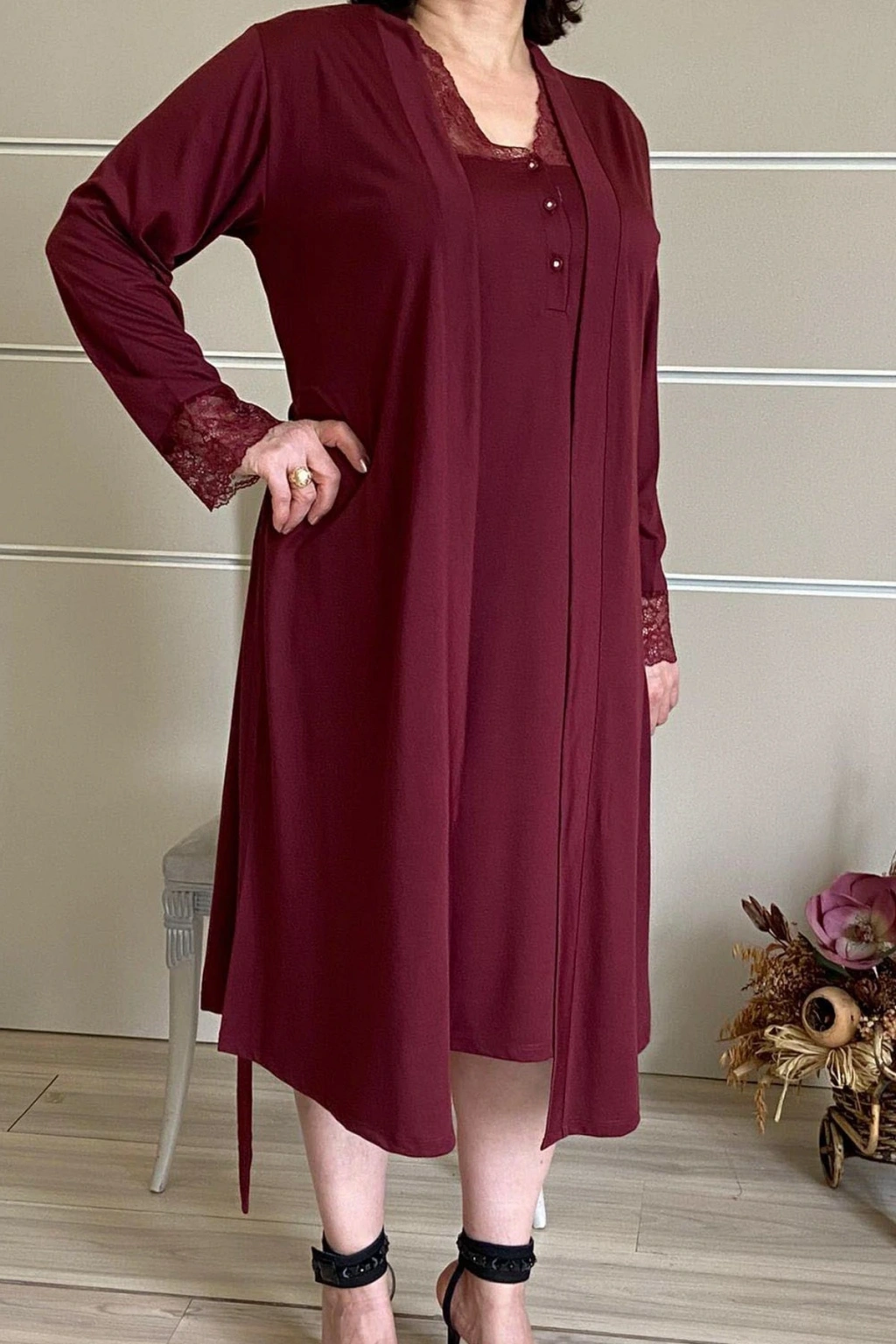 - Hamilelik döneminde konfor ve şıklığı bir arada sunan bordo renkteki lohusa sabahlık, özel koleksiyonunuzun vazgeçilmez bir parçası olacak; - Dokuma kumaş yapısı sayesinde yumuşak dokunuşu ve dayanıklılığı ile uzun süreli kullanım imkanı sağlar; - Regular kalıp tasarımı, hamilelik sürecindeki vücut değişimlerine uyum sağlayarak rahat bir kullanım sunar; - Regular boy kesimi ile farklı vücut tiplerine uygunluk gösterir ve hamilelik süresince ideal bir oturuş sağlar;