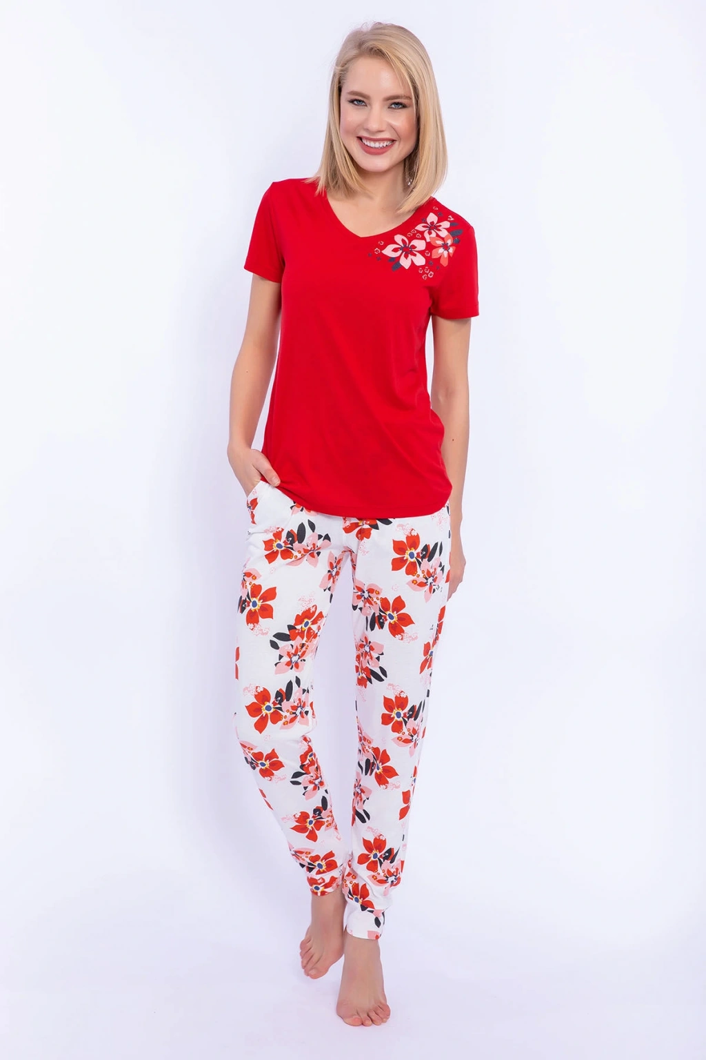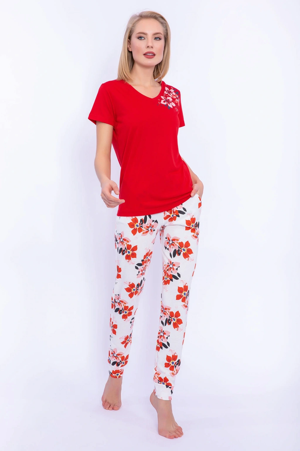 25109 Kadın V Yaka Kısa Kollu Bol Paçalı Pijama Takım