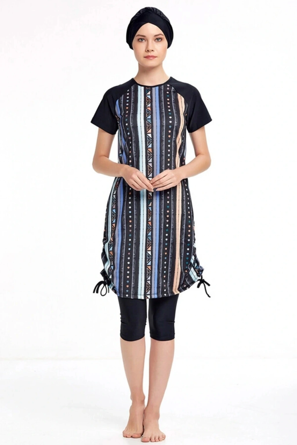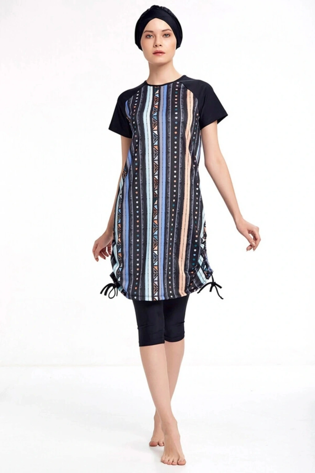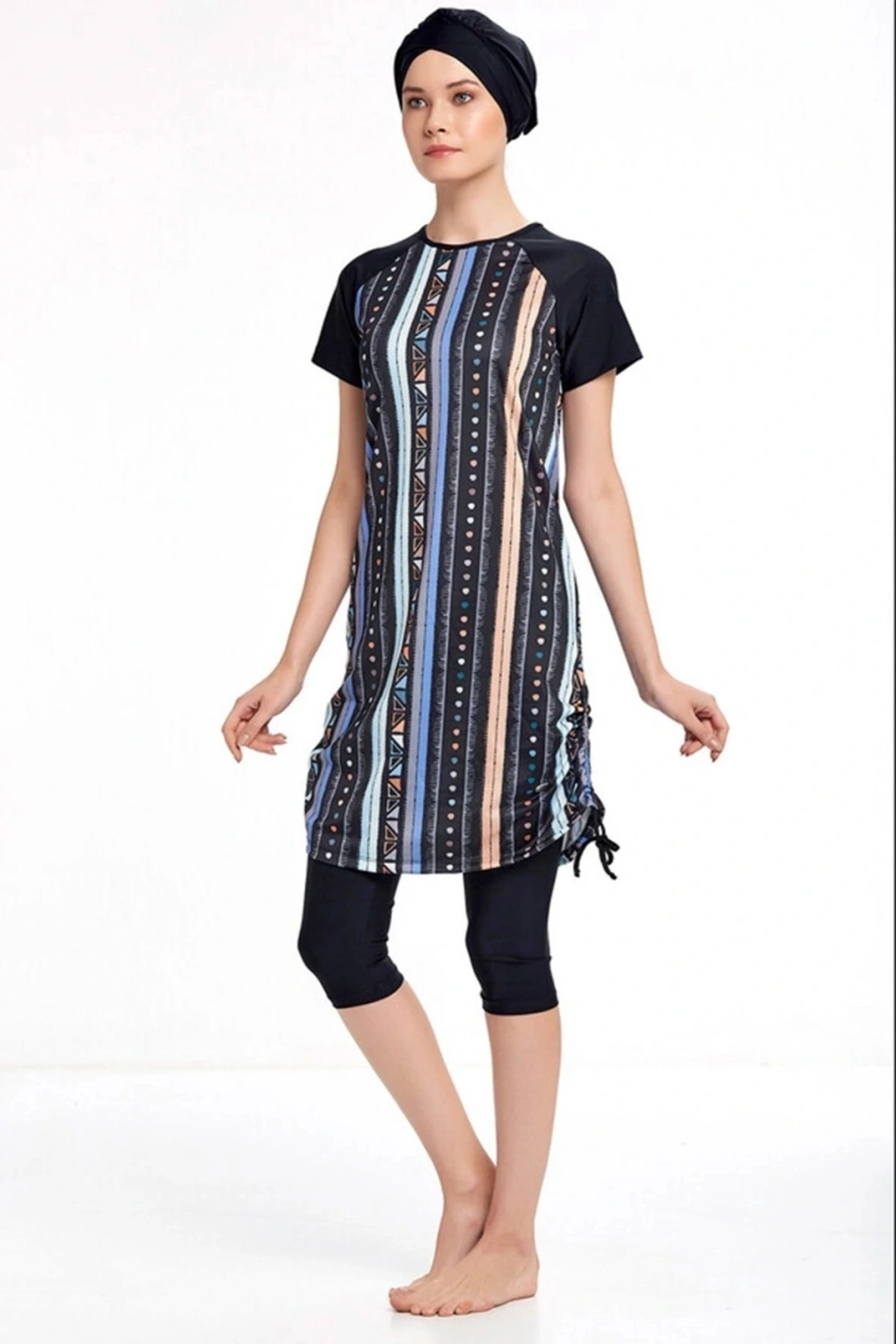Adasea Likralı Yarı Kapalı Kısa Kollu Tesettür Mayo 3409 Siyah Adasea yarı kapalı mayo kısa kollu üst, kısa tayt ve bone olmak üzere 3 parçadan oluşmaktadır. Rahat kesimi ile kaçlarınızı örten üstü renkli tasarıma sahiptir. Mayo üstünün alt kenar kısmında bulunan lastikler ile zevkinize göre kısaltma yapabilirsiniz. Standart düz renk büyük beden yarı kapalı mayo modellerinin aksine hareketli tasarıma sahip büyük beden yarı kapalı mayo modeli arayanlar için kurtarıcı bir parçadır. Ürün oldukça ince ve hafiftir. Hava akışını sağlayan yapısıyla terletme yapmaz. Ürünü uzun ömürlü kullanmanız için yıkama talimatlarına uymanızı tavsiye ederiz. Ürün Bilgileri: Adasea Likralı Yarı Kapalı Mayo 3409 ilkbahar - yaz koleksiyonumuzda beğeninize sunuldu. Adasea Likralı Yarı Kapalı Mayo 3409 ürün içeriği; %80 polyester, %20 elastan likralı 1. kalite kumaştan üretilmiştir. Setimiz; - Üst - Alt - Bone Üretiminde sağlığa zararlı hiçbir materyal kullanılmamıştır. TESETTÜR MAYO UZUN ÖMÜRLÜ KULLANIM ÖNERİLERİ Mayonuzu her kullanım sonrası elle ılık su ve beyaz sabun ile yıkayınız.; Güneş kremi yağı, güneş sütü vb. tüm kozmetiklerden arındığına emin olunuz.; Mayonuzu yıkarken çamaşır makinesi, sıcak su, deterjan, çamaşır suyu ve diğer ağartıcı temizlik maddelerini kullanmayınız.; Kuru temizleme işlemi yaptırmayınız.; Birden fazla renklileri ıslak olarak bekletmeyiniz.; Direkt güneş ışığında değil gölgede ve tersinden sererek kurutunuz.; Ütülemeyiniz.; Üretim yeri: Türkiye BEKLEMEK YOK ANINDA KARGOYA VERİLİR.