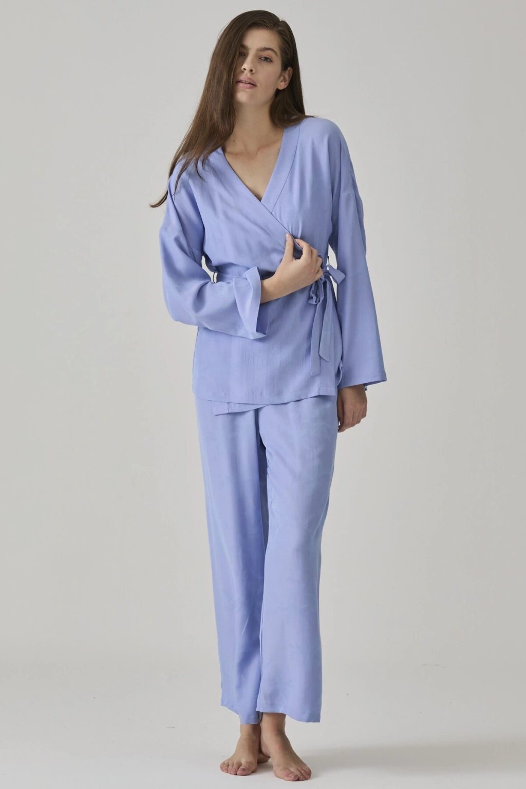 KADIN MAVİ JAKARLI KİMONO YAKA PİJAMA TAKIMI