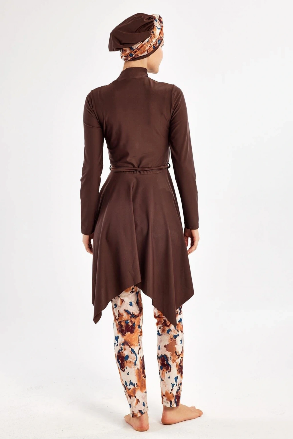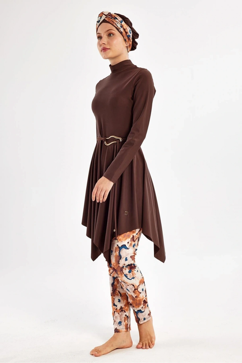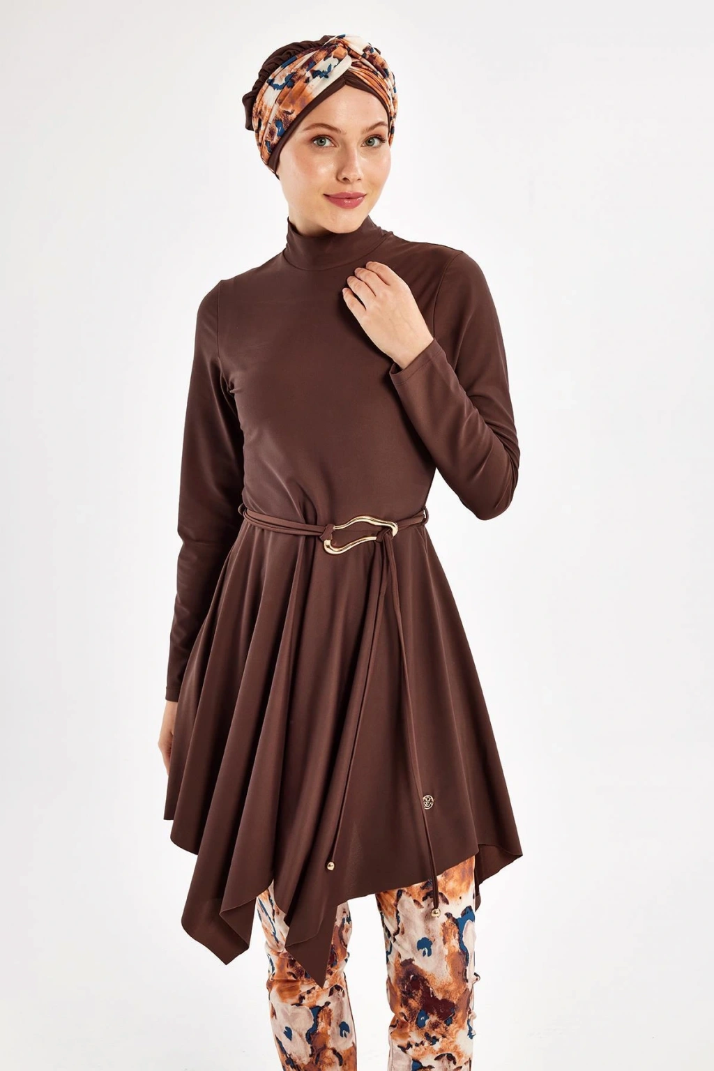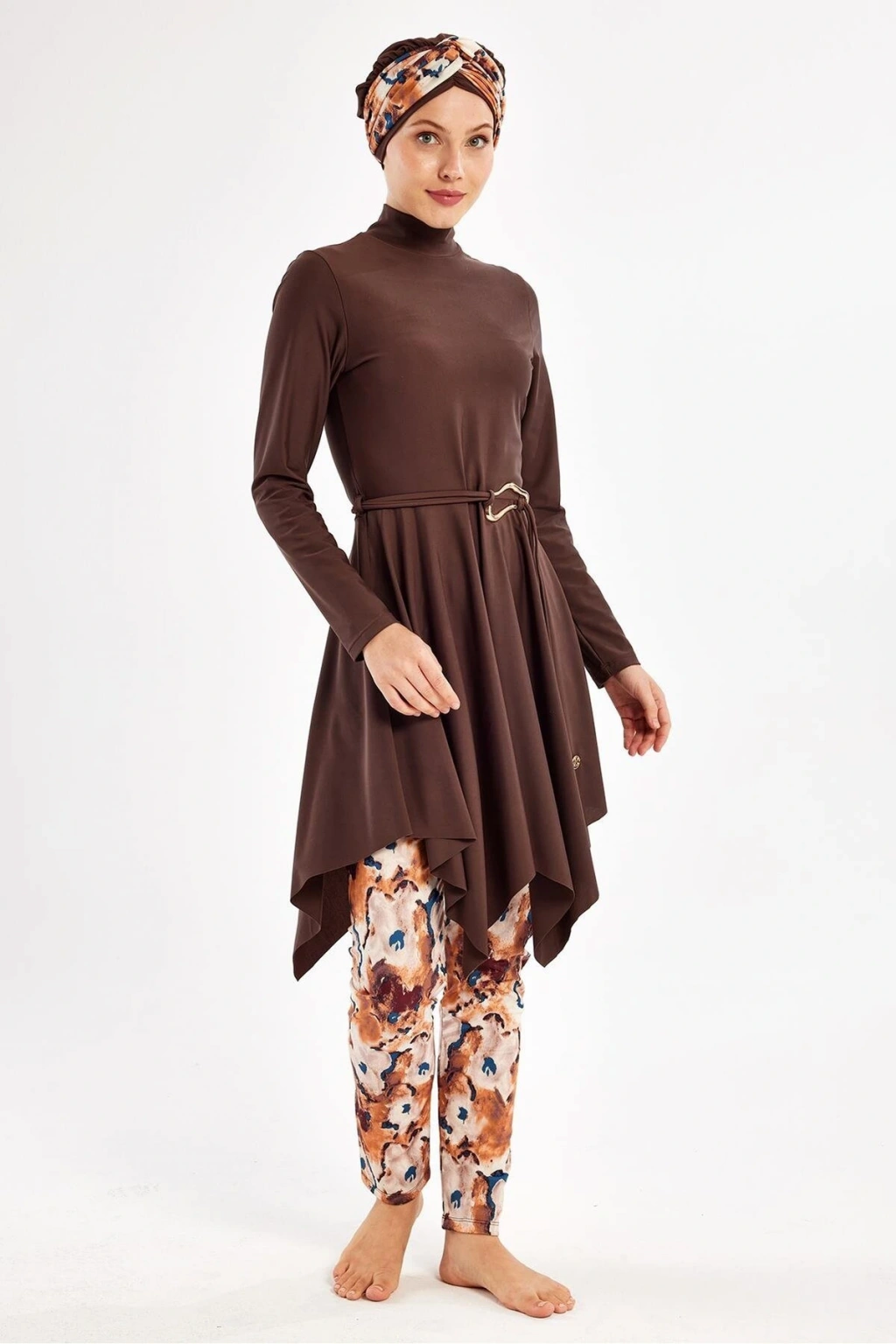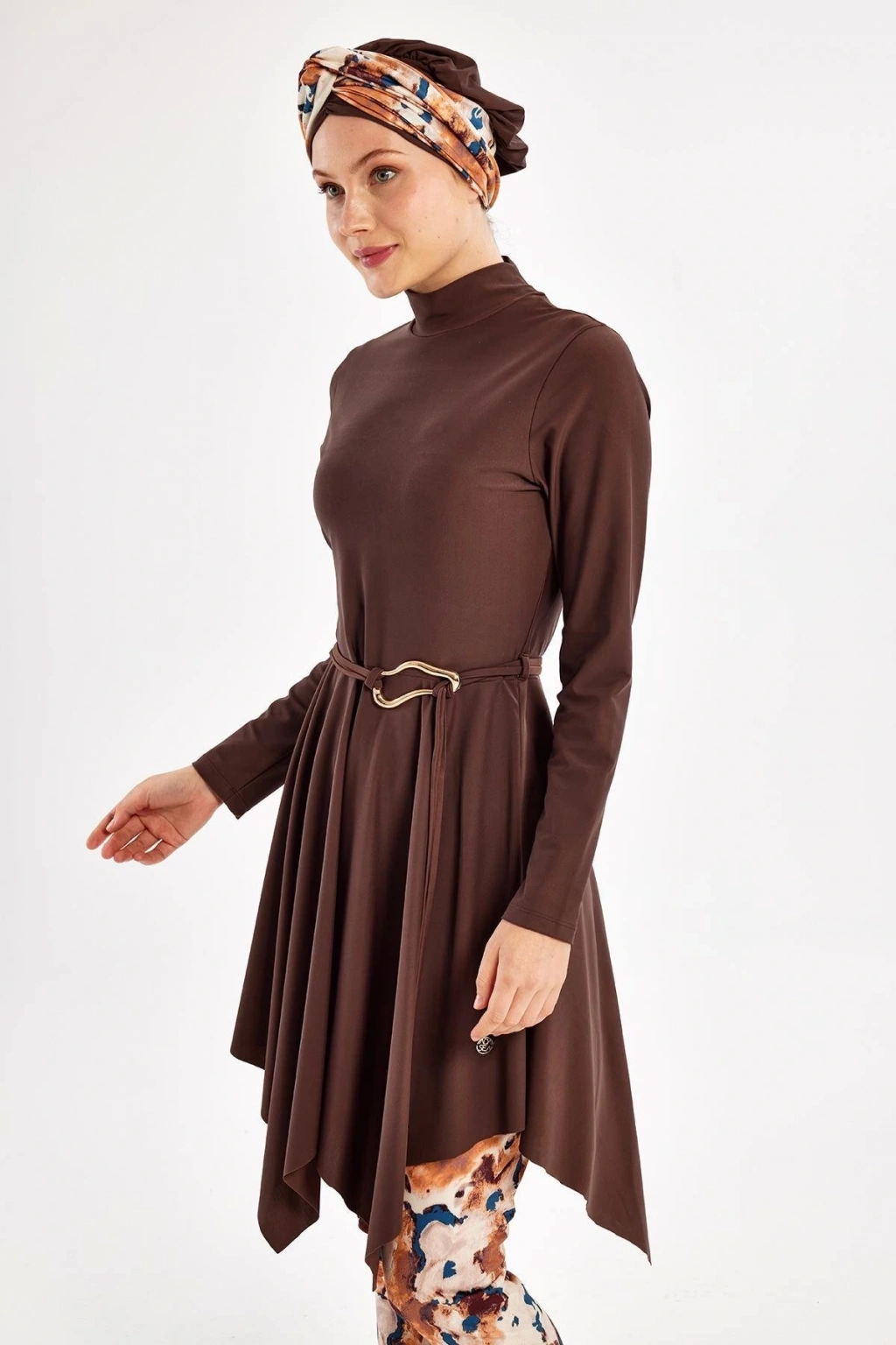 - Kahverengi tonlarındaki çiçek desenleriyle yaz aylarının vazgeçilmezi, şıklığı ve rahatlığı bir arada sunan tesettür mayo.; - %100 poliamid materyal bileşeni sayesinde uzun süreli kullanım ve dayanıklılık sağlar.; - Dik yaka tasarımı ile modern ve zarif bir görünüm kazandırırken, suyun içinde de konforlu bir deneyim sunar.; - Dalgıç/scuba dokuma tipi, mayonun formunu koruyarak vücut hatlarını nazikçe sarar ve hareket özgürlüğü tanır.; - Kadın/kız cinsiyetine hitap eden bu ürün, her yaş grubundan kadının gardırobunda yerini almayı hak ediyor.; - Atma kap özelliği ile göğüs bölgesine ekstra destek sağlayarak rahatlık sunarken, maksimum konfor için idealdir.; - Yaz sezonuna özel olarak tasarlanmış olup, sıcak günlerde serin kalmanız için idealdir.; - Türkiye menşeli olmasıyla yerel üretim avantajını kullanarak hem kaliteyi hem de uygun fiyatı buluşturur.; - Standart kol tipiyle günlük aktivitelerinizde veya plajda rahatça hareket etmenize olanak tanır.; - Maxi boy kesimiyle bacakları tamamen örterken aynı zamanda estetik bir siluet oluşturur.; - T-shirt elbise kalıbıyla hem spor hem de şık kombinler yapabilme imkanına sahipsiniz.; - Uzun kollu tasarım soğuk havalarda ekstra koruma sağlarken güneşten gelen zararlı UV ışınlarına karşı da etkilidir.; - Beachwear ortamları için mükemmel seçim olan bu mayo, plaj modasında trendleri takip edenlerin tercihi olacaktır.; - Monogram kapama şekli sayesinde pratik kullanım sunarken aynı zamanda stil sahibi bir görünüm kazandırır.; - Dokuma kumaşı nefes alabilir yapıda olup cildinizin gün boyu ferah kalmasına yardımcı olur.; - Yetişkin beden ölçülerine uygun olarak üretilmiştir; geniş beden skalasıyla herkes için erişilebilirlik sunar.
