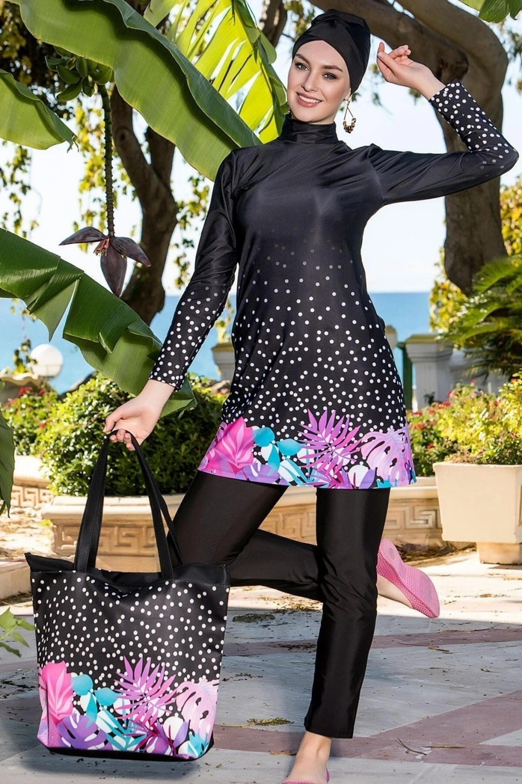 % 88 Polyester % 12 Elastan; Paket İçeriği: Uzun Kollu Üst, Beli Lastikli Pantolon, Bone (3 Parça); Dikme Kap, Astarlı; Üst boy- 86 cm, Tayt Boyu- 93 cm (48 beden ölçüleri); Bedenler arası yaklaşık olarak 2 cm farklılık göstermektedir.; Mankenin Ölçüleri:Boy-1,74, Göğüs-85 cm, Bel-59 cm,Kalça-93 cm.; Her kullanımdan sonra sabunlu ılık suda elde yıkayınız. Ağartıcı ve deterjan kullanmayınız. Mayoyu ıslak, havasız, kapalı, naylon torbada bekletmeyiniz. Tersinden sererek gölgede kurutunuz.; Paket içeriğinde çanta, babet, terlik gibi yan ürünler dahil değildir.; Ürün görselinde bulunan plaj çantasını satın almak için satıcı mağazamızı ziyaret edebilirsiniz.;