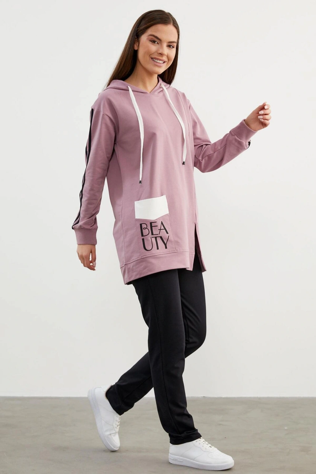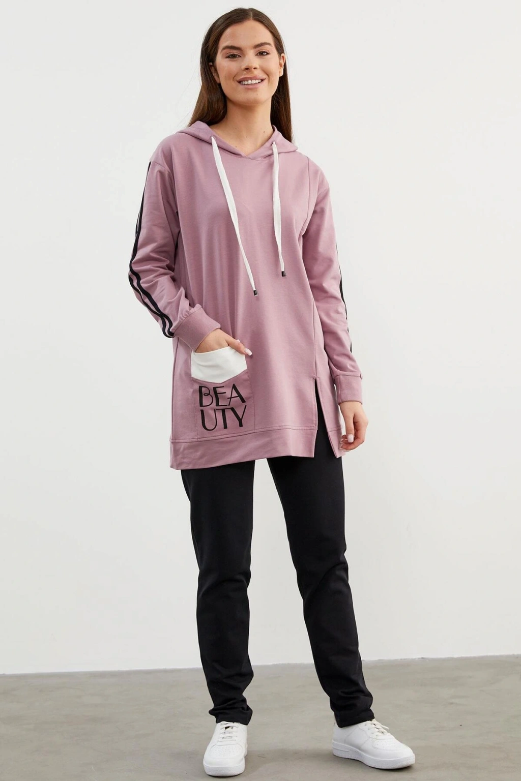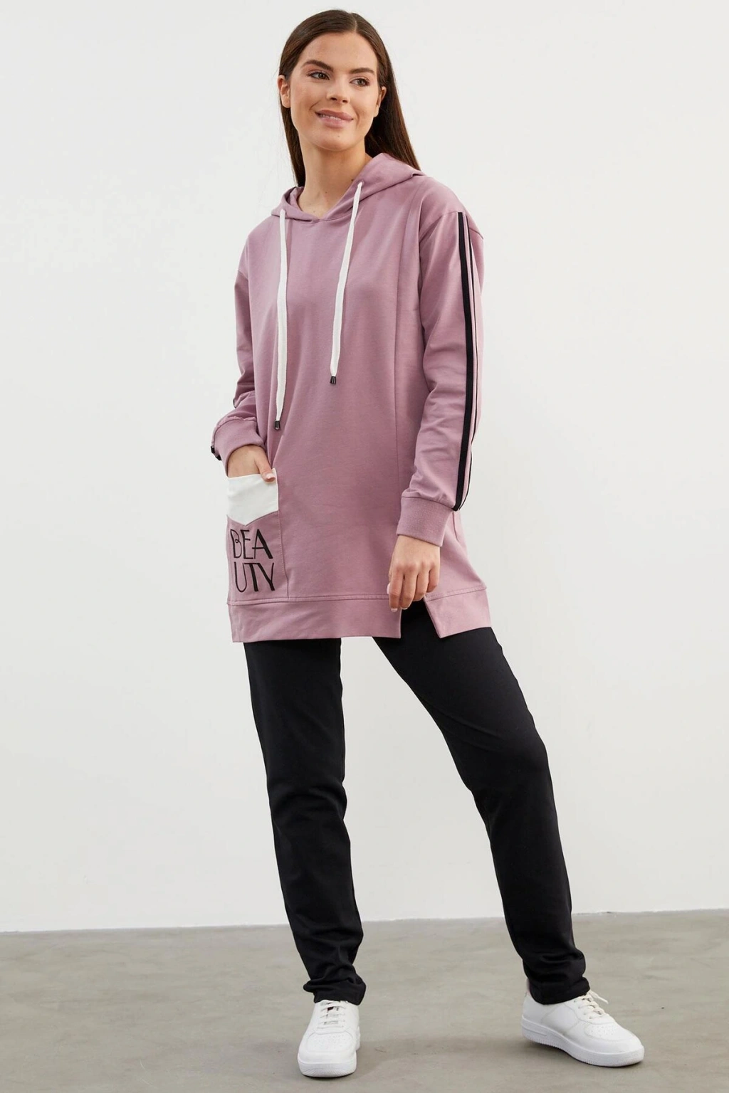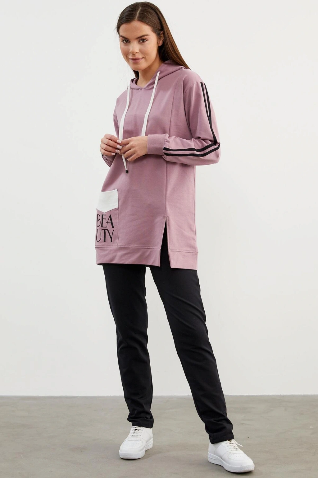 Rahatlığıyla vazgeçilmeziniz olacak tasarım, canlı renk seçenekleriyle günün her anı sizinle.. ; Kapüşonlu, kolları şerit detaylı, ön kısmında yırtmaç bulunan sweatshirt ve boru paça alttan oluşan takım ile haftasonu stilinizi oluşturun. ; ÜST Kumaş İçeriği: %60 Polyester %35 Pamuk %5 Elastan Desen: Düz Yaka Tipi: Kapüşonlu Kol Tipi: Uzun Kol Ürün Boyu: 77 cm Kalıp Tipi: Standart Kalıp Cep: Cepli ALT Kumaş İçeriği: %60 Polyester %35 Pamuk %5 Elastan Desen: Düz Paça Tipi: Boru Paça Bel Tipi: Lastikli Cep: İki Adet Yan Cep Ürün Boyu: 103 cm Kalıp Tipi: Standart Kalıp Mankenin Giydiği Beden: S Manken Ölçüleri: Boy: 173 cm Göğüs: 82 cm Bel: 60 cm Basen: 90 cm;