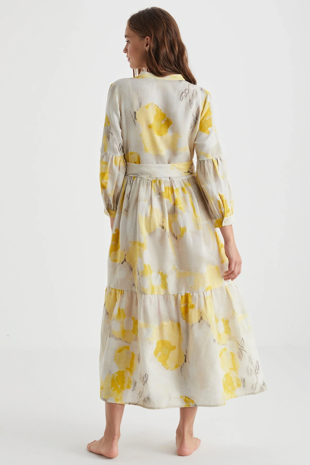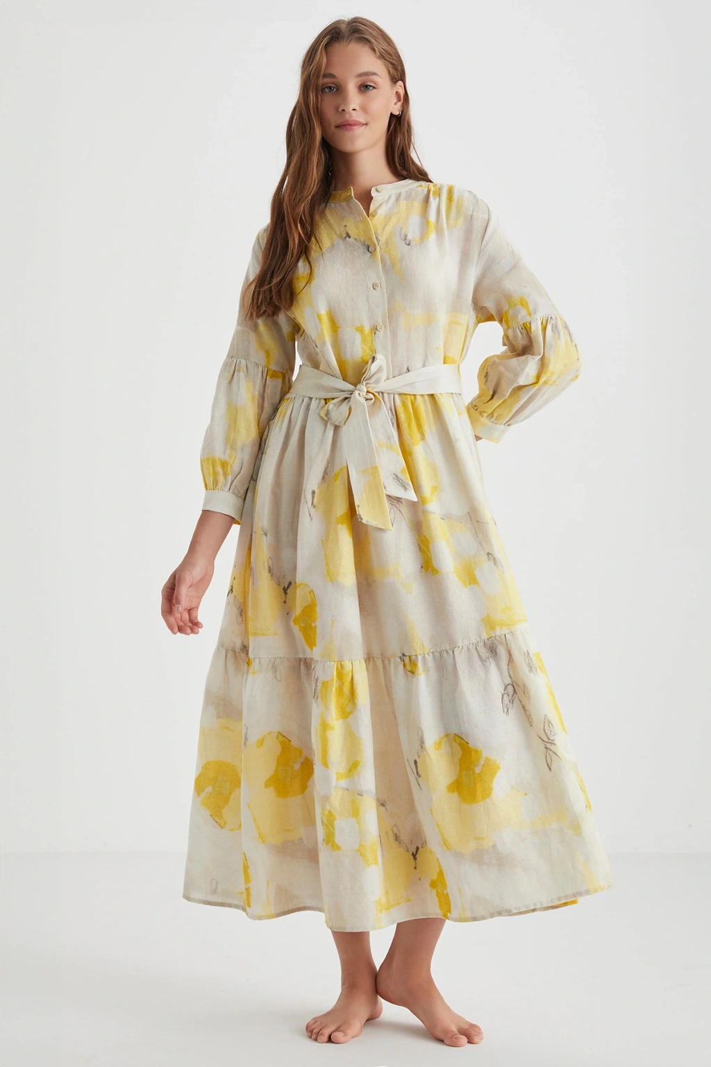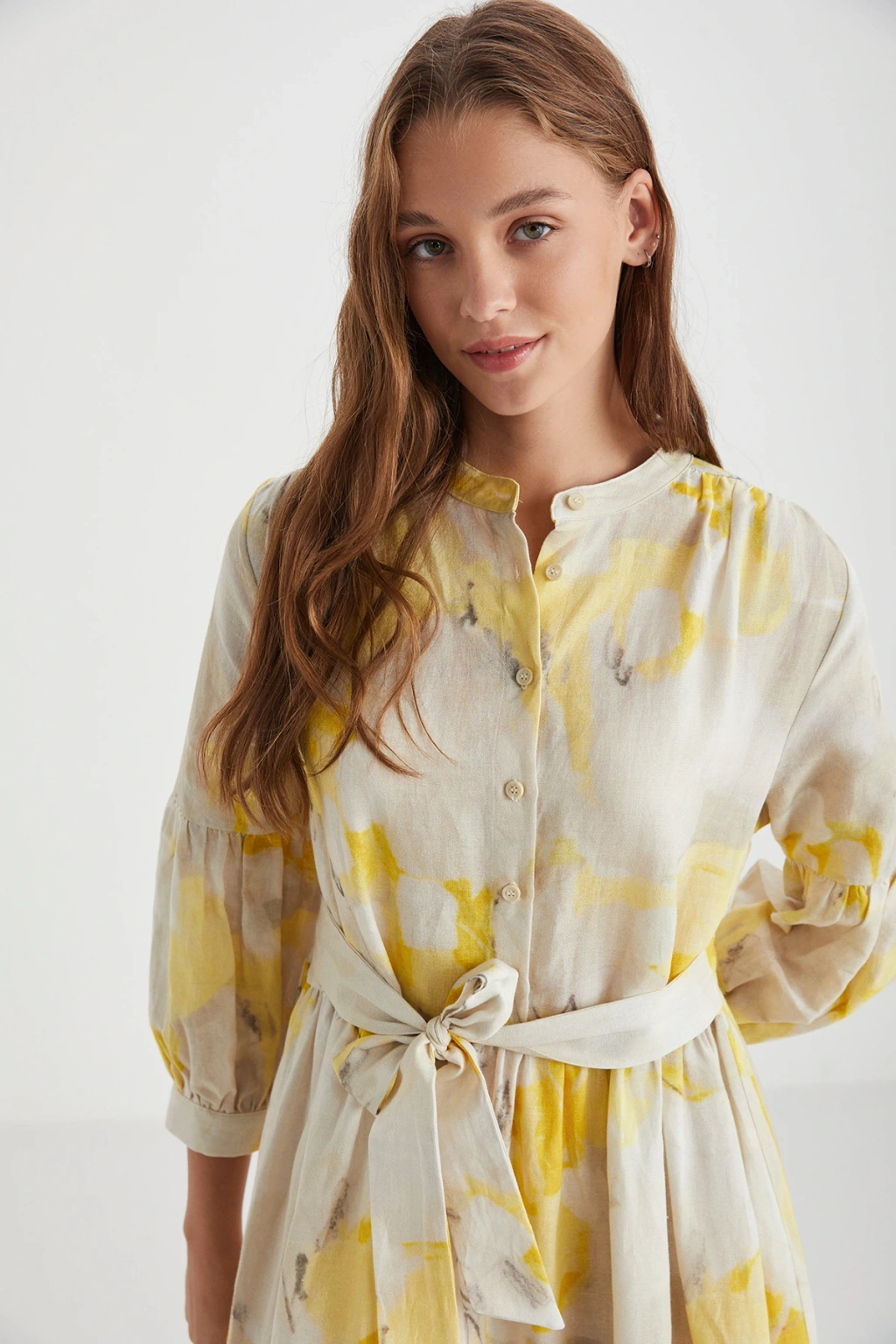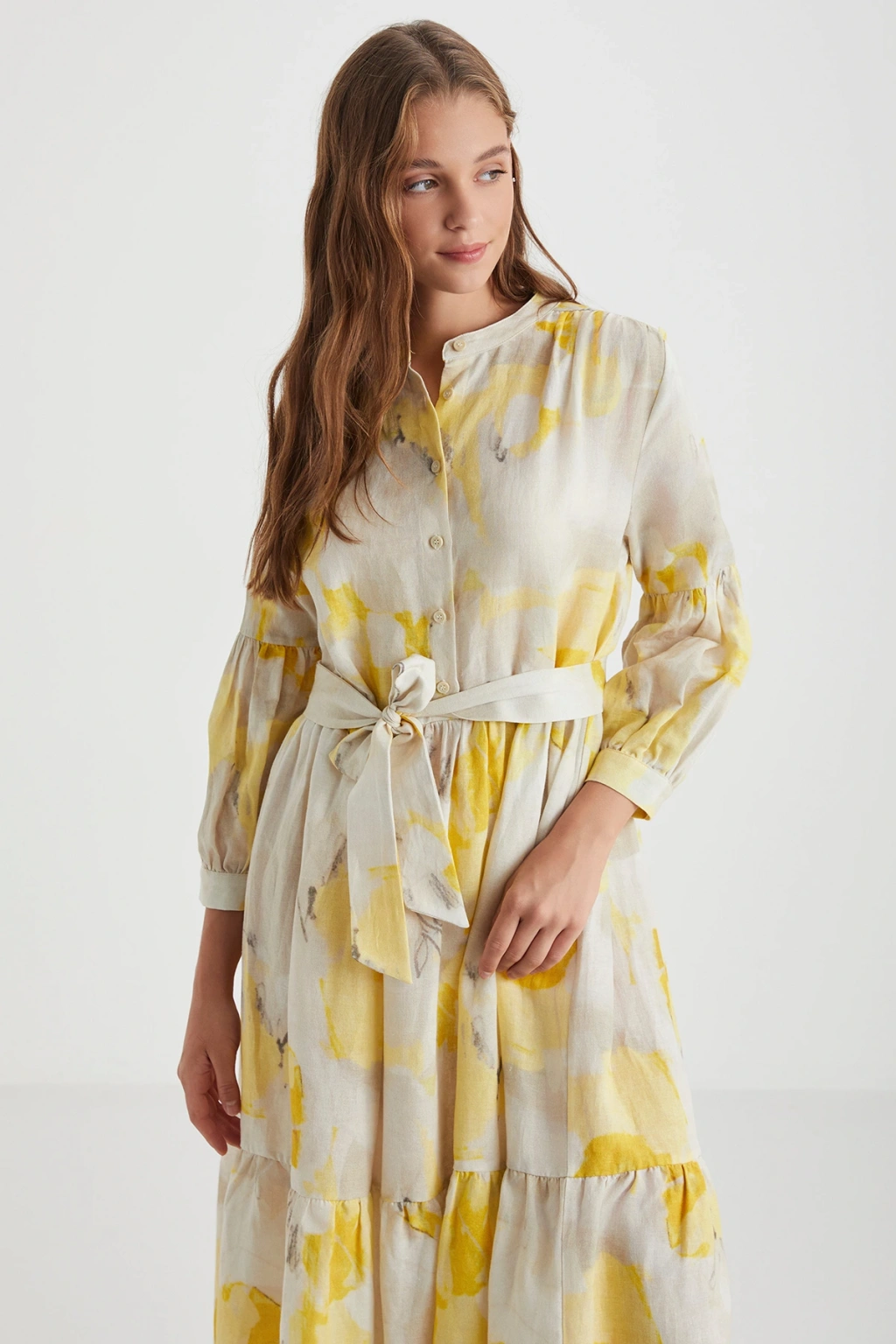 Keten Görünümlü Uzun Gömlek Elbise - Bej